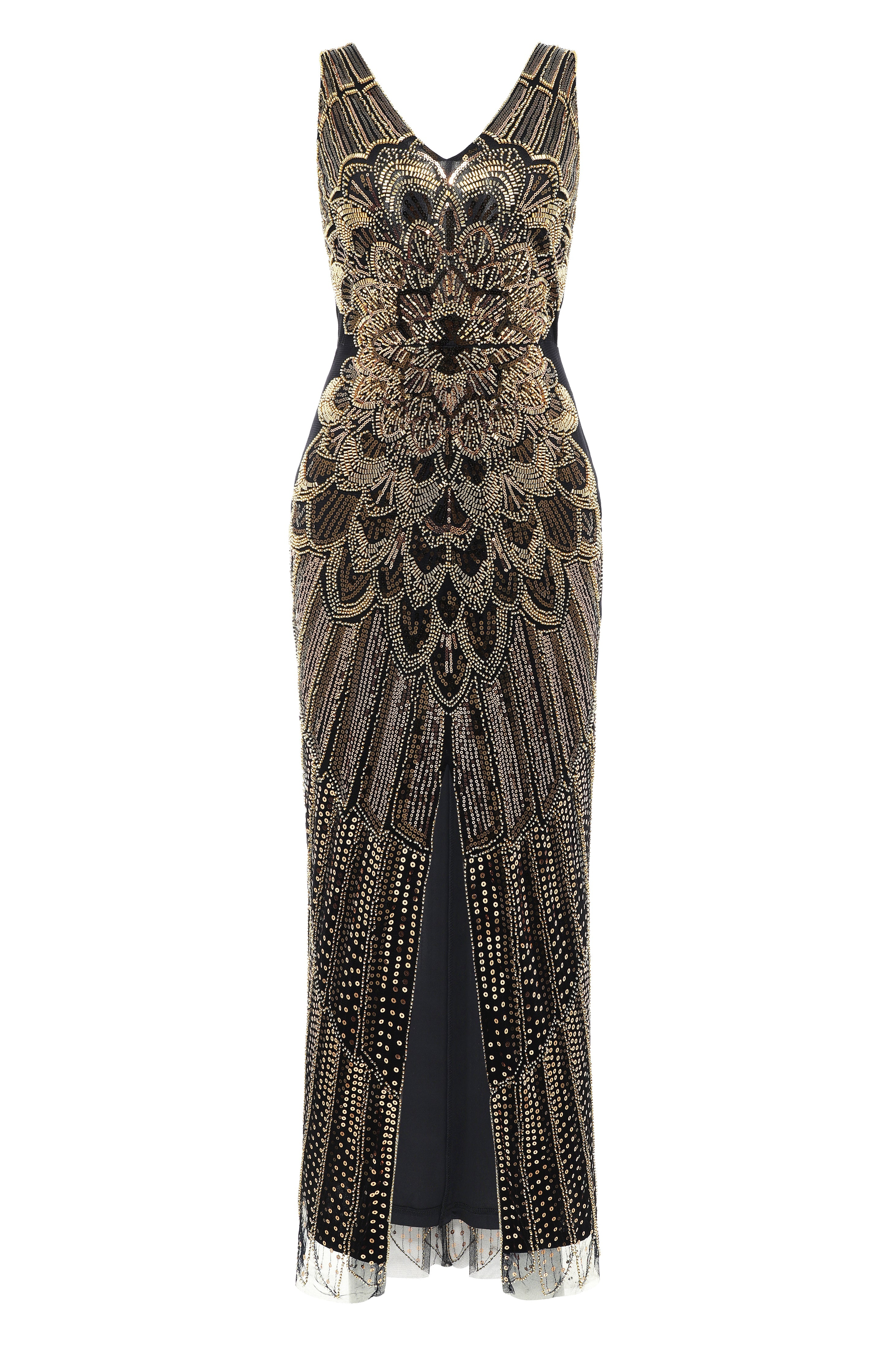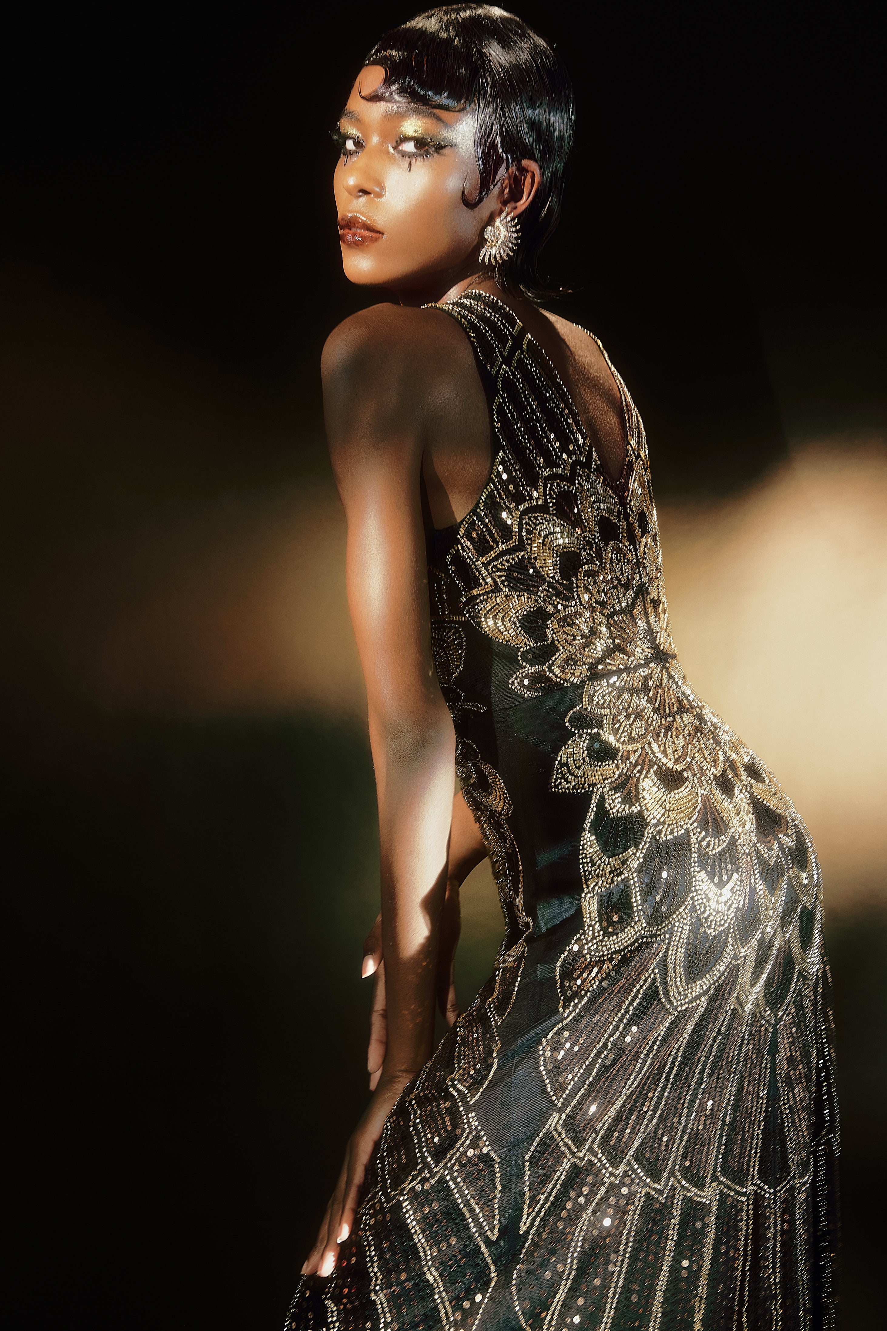 Evoking the Roaring Twenties' spirit, our collection, inspired by Josephine's 'La Revue Nègre', blends tradition with modern elegance through embroidered feather motifs. This dress dazzles with its slimming color contrast, sunburst sparkles, and beaded hem.