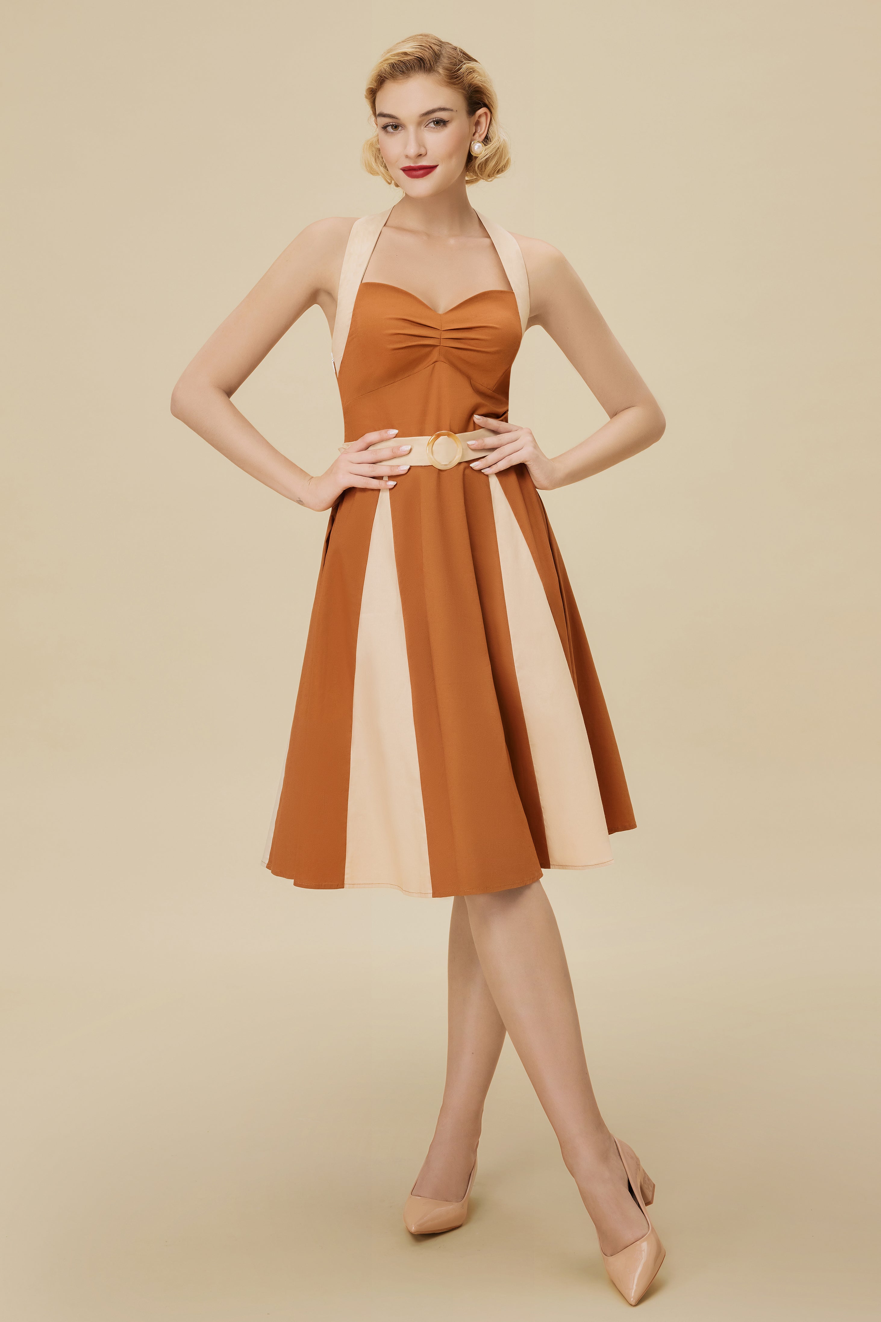 Designed with a retro halter neckline and contrast panels, this swing dress highlights your curves while creating a refined hourglass silhouette. The wide belt cinches the waist for definition, and the full circle skirt moves with effortless grace.
