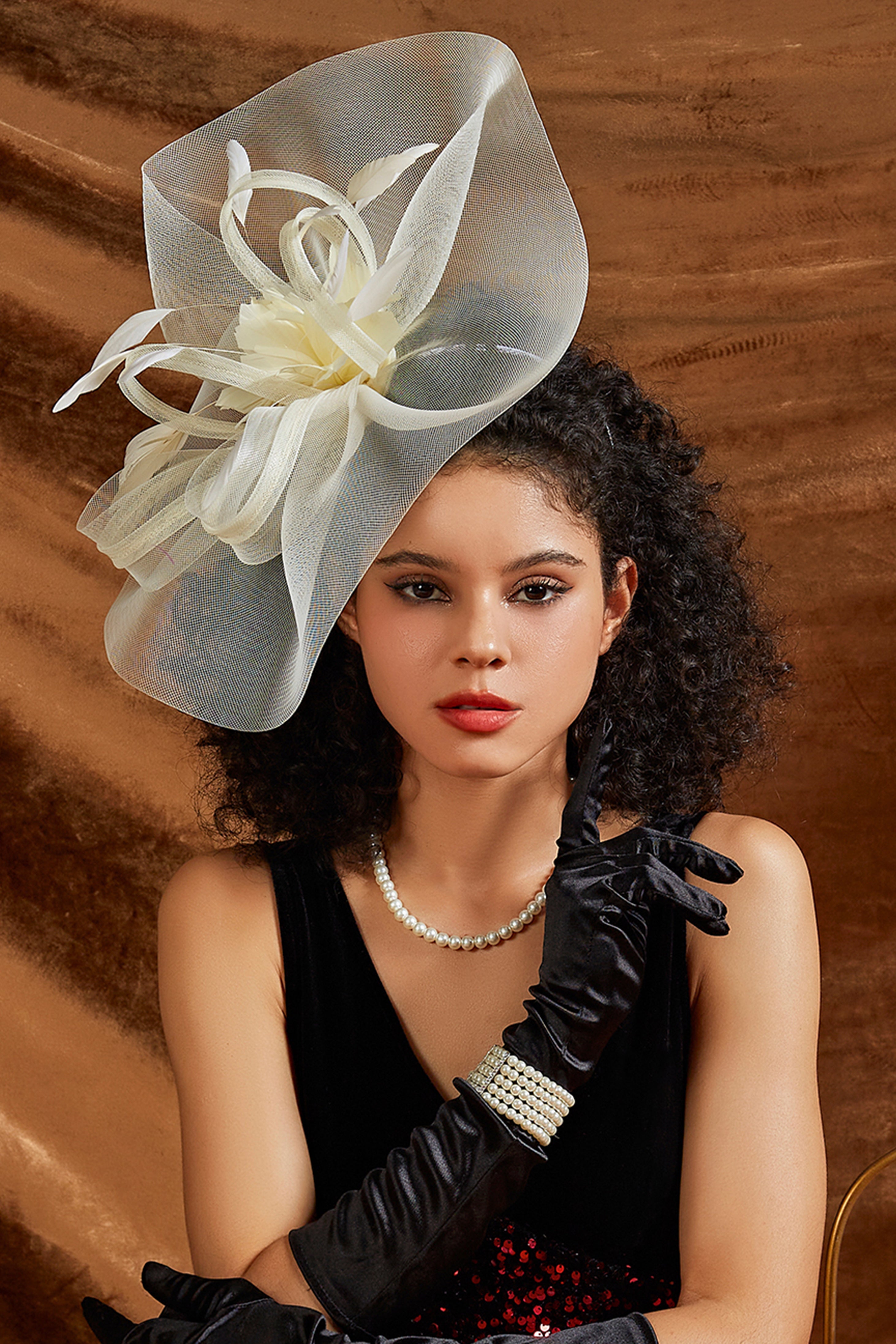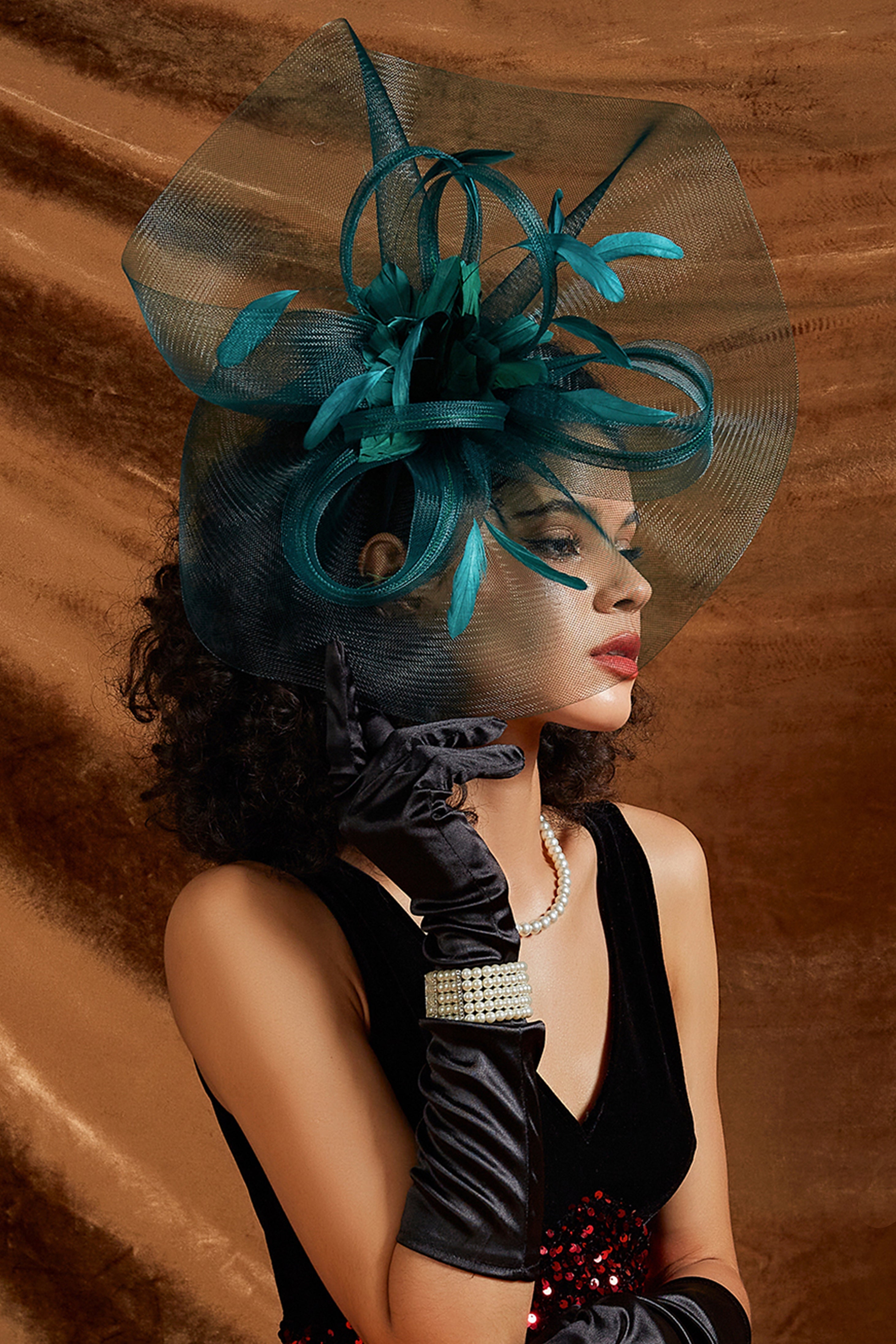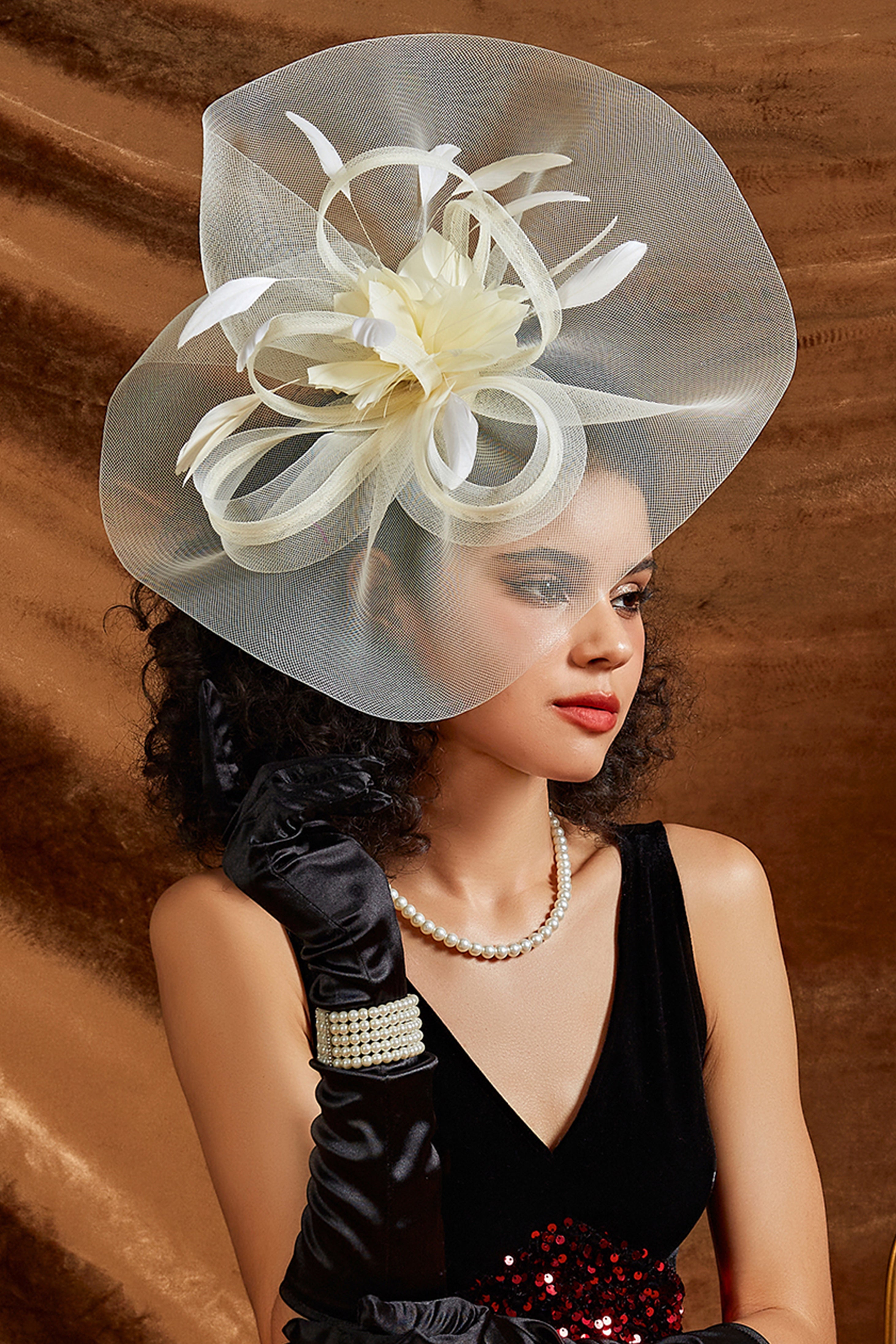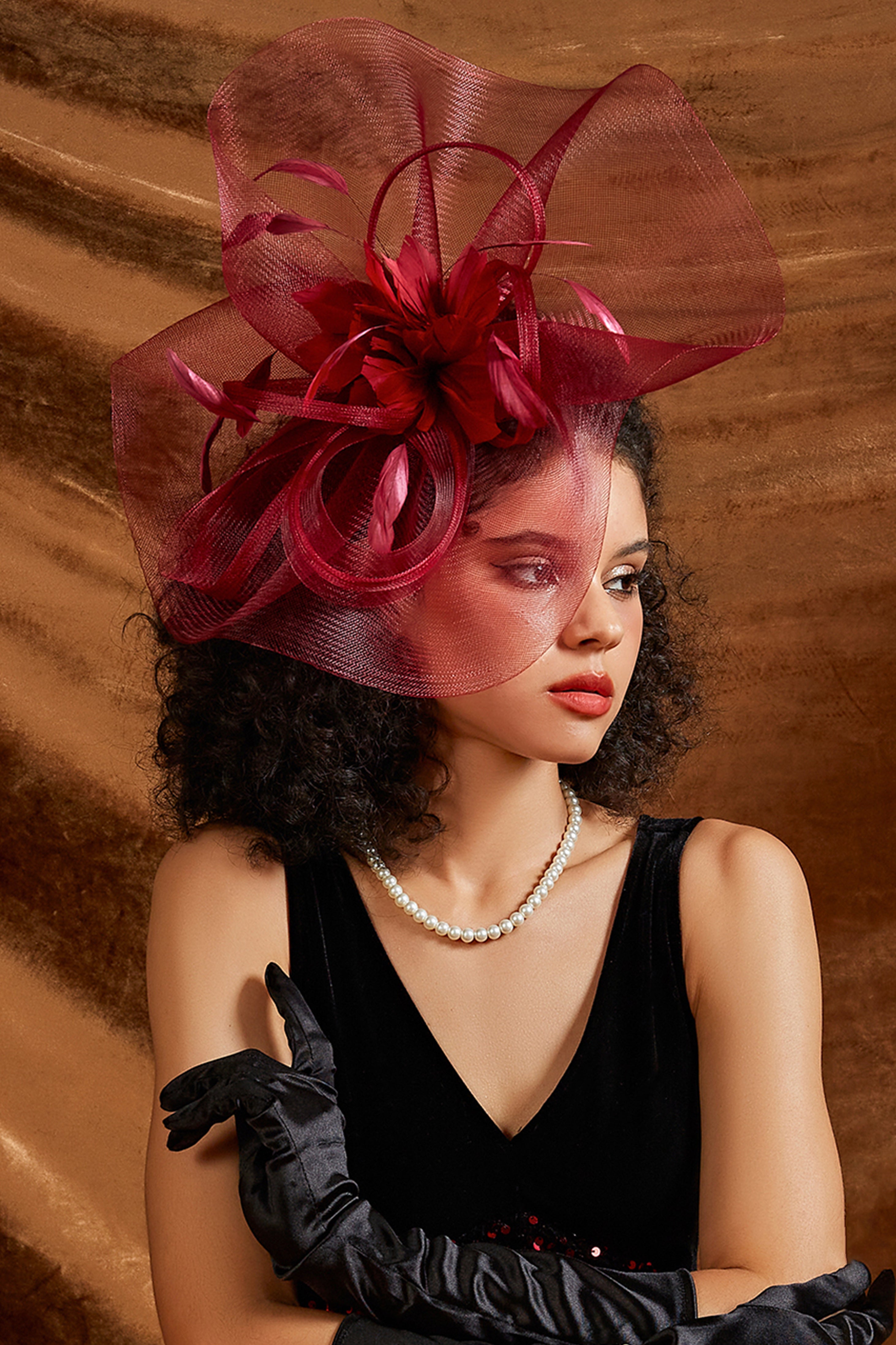 This dreamy wavy brim mesh fascinator features a unique wave-shaped wide brim, accented with satin ribbon and feather bow, offering a stylish and elegant touch perfect for weddings, tea parties, or racing events.