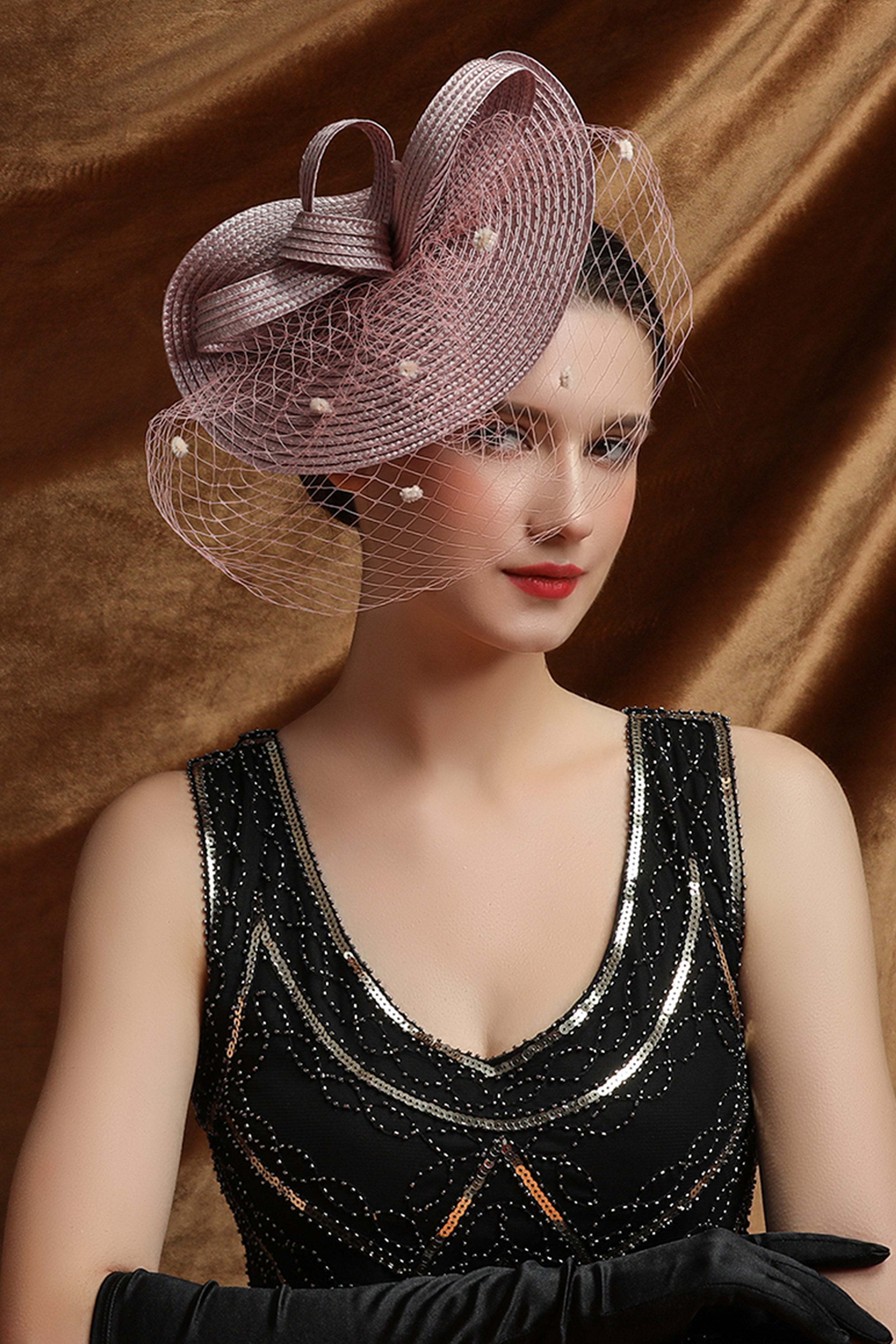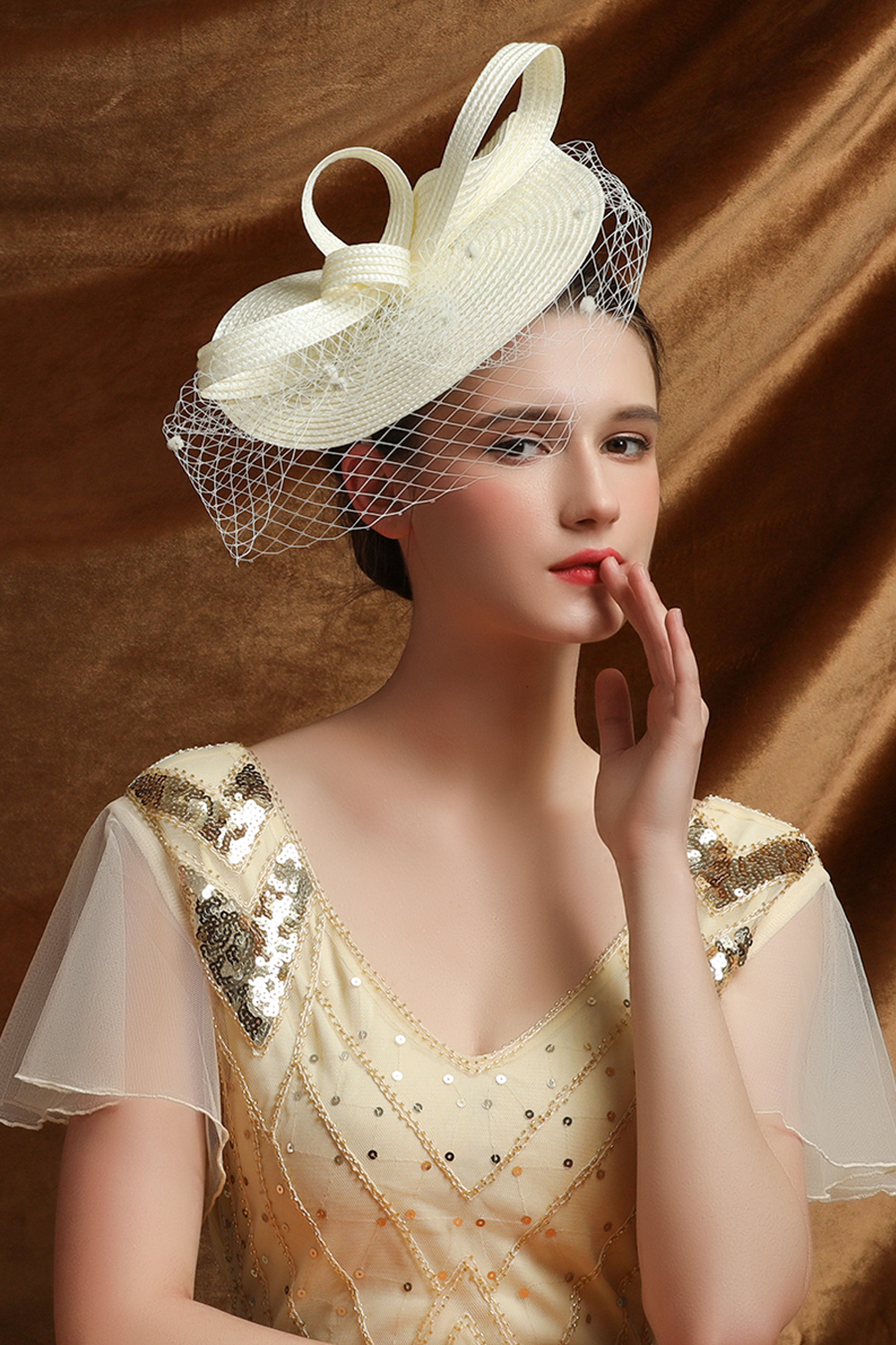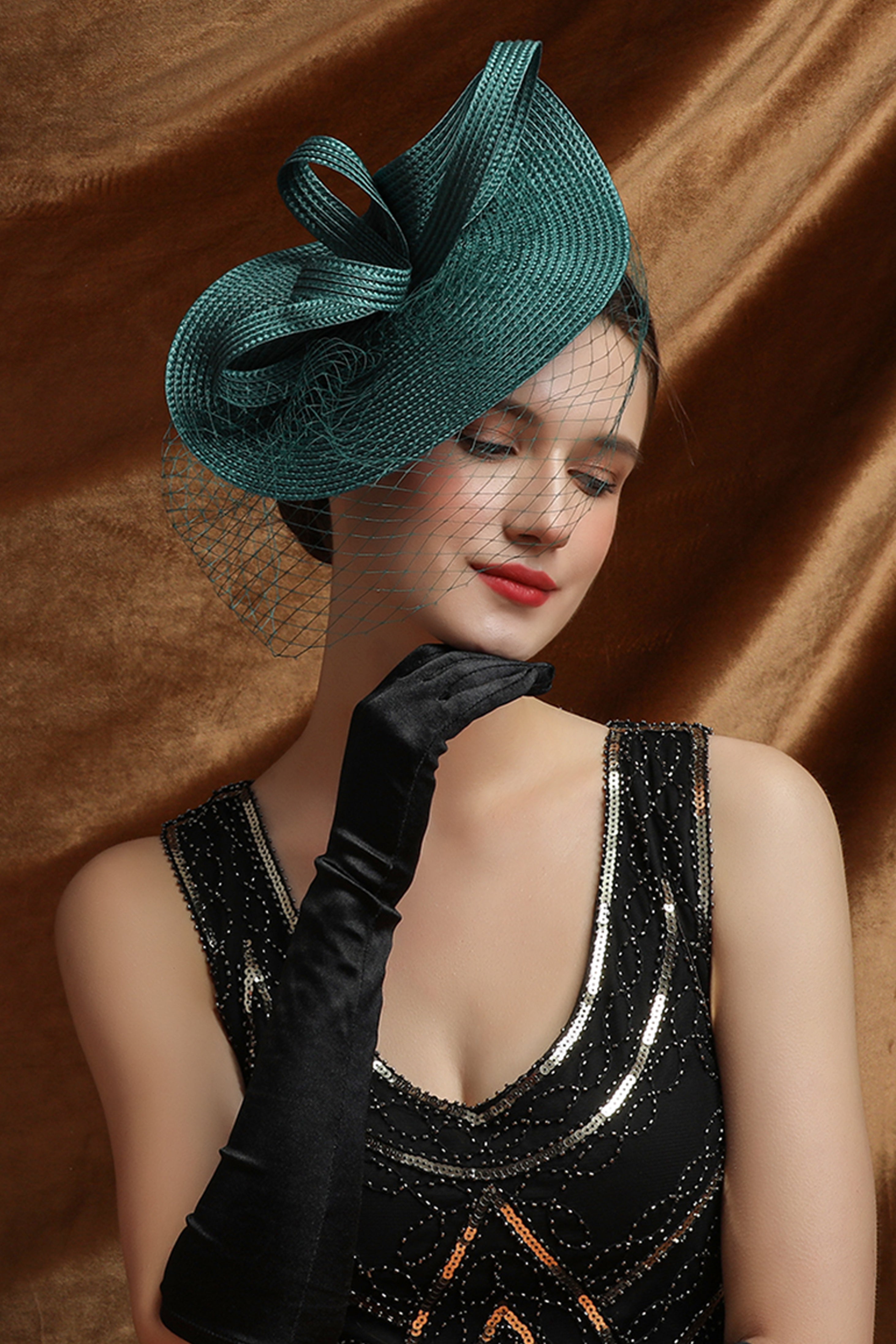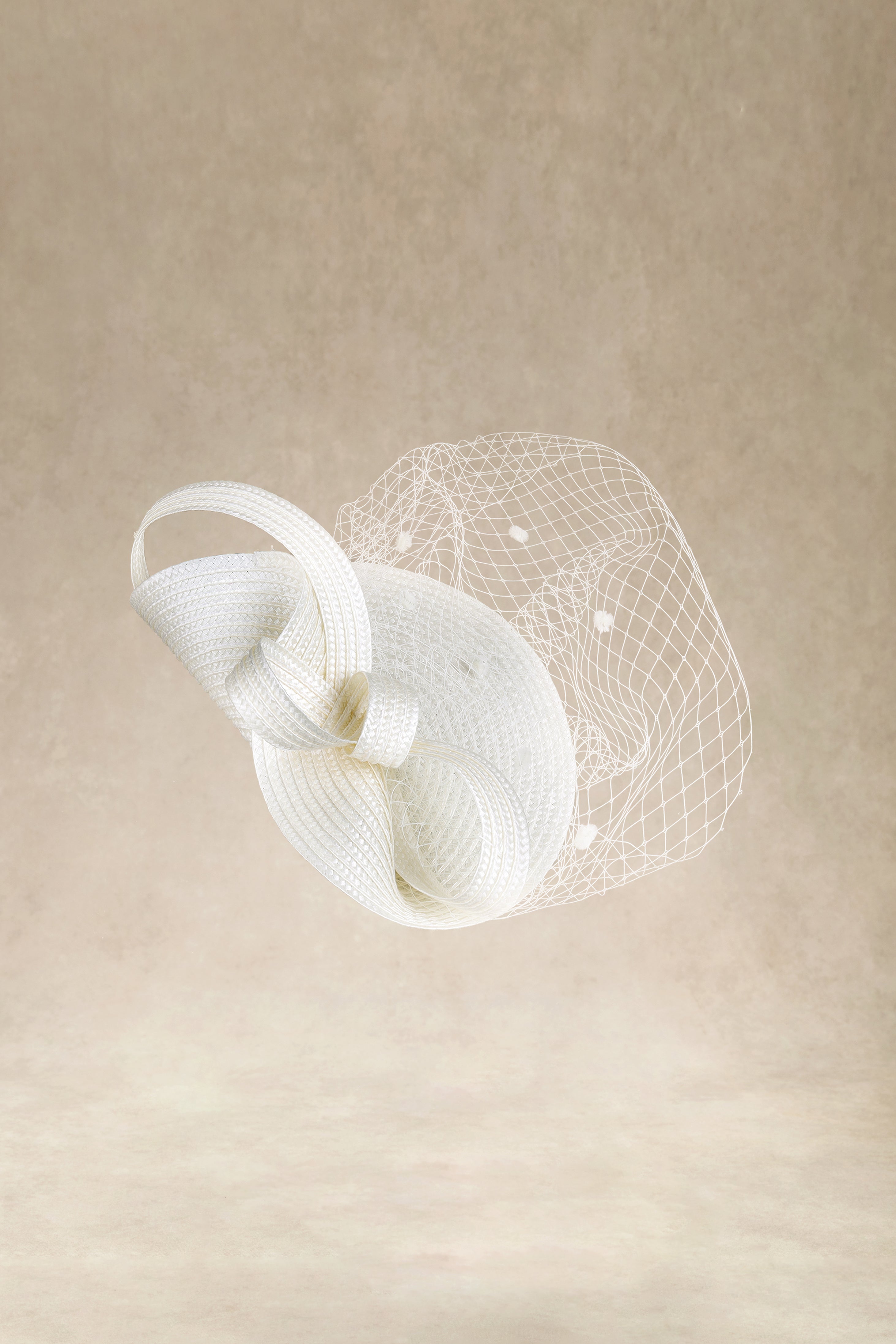 This race day fascinator features a sculpted ribbon design, adorned with a light half veil and delicate fluffy accents, exuding timeless elegance and vintage charm.