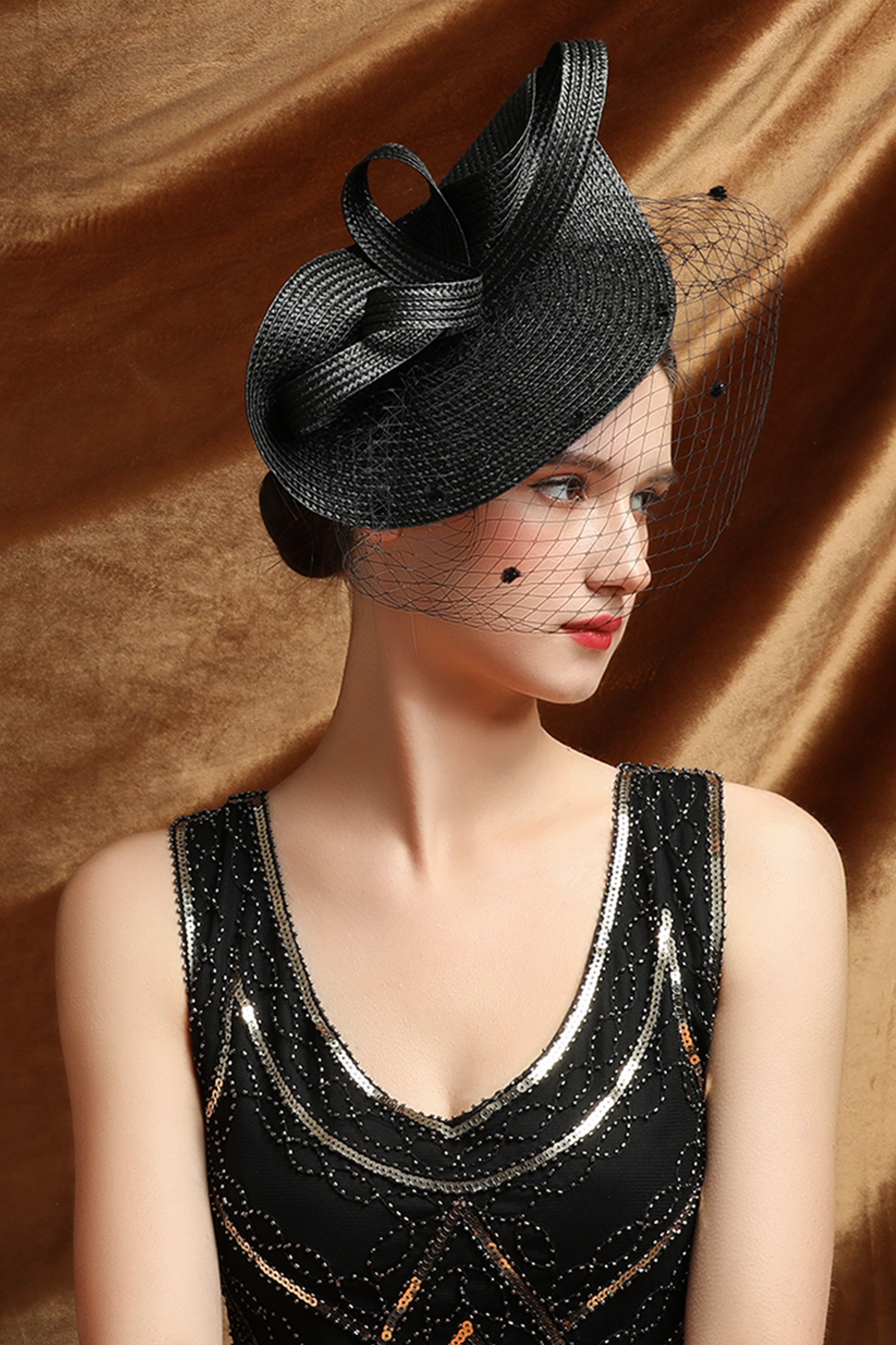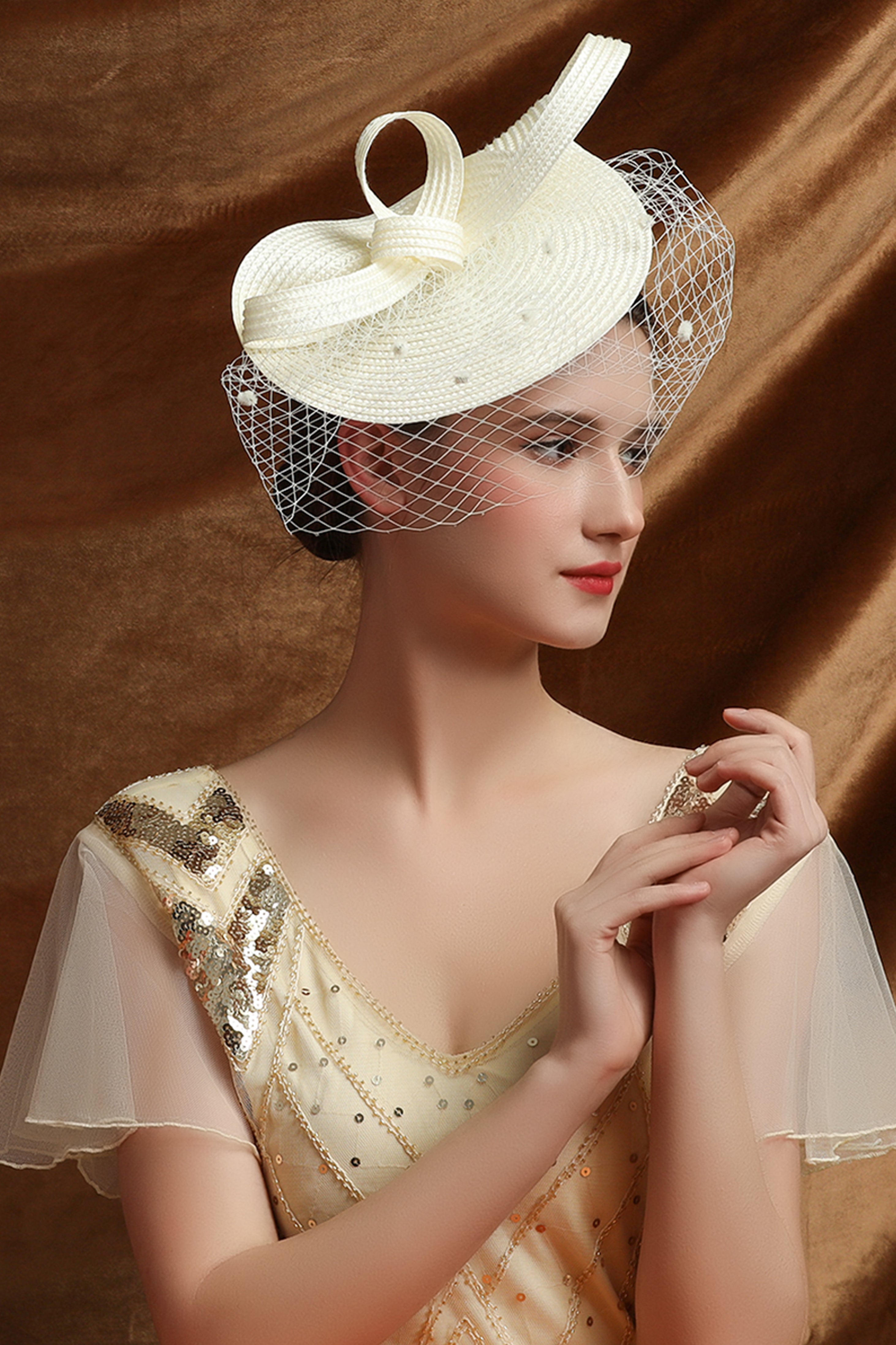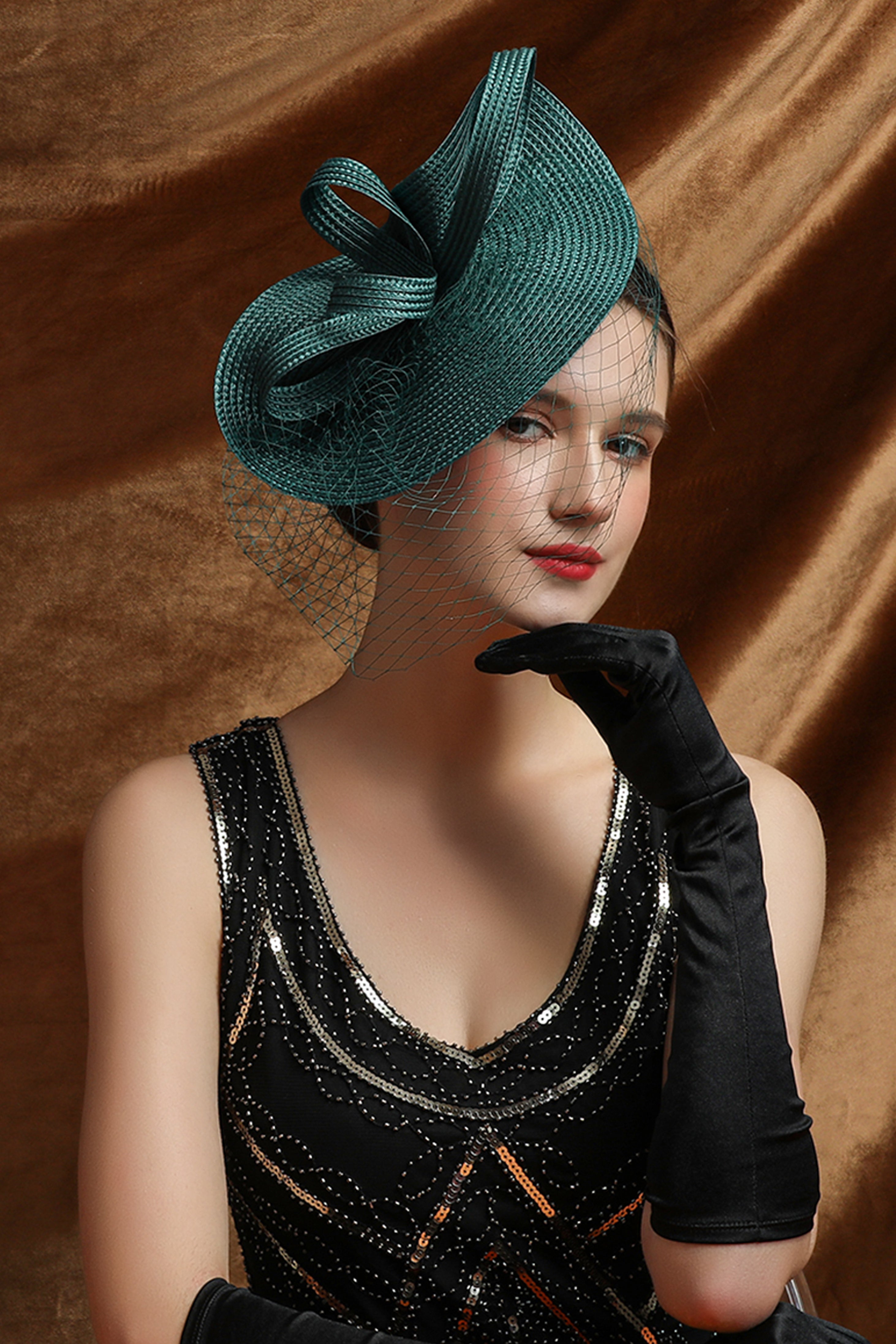 This race day fascinator features a sculpted ribbon design, adorned with a light half veil and delicate fluffy accents, exuding timeless elegance and vintage charm.