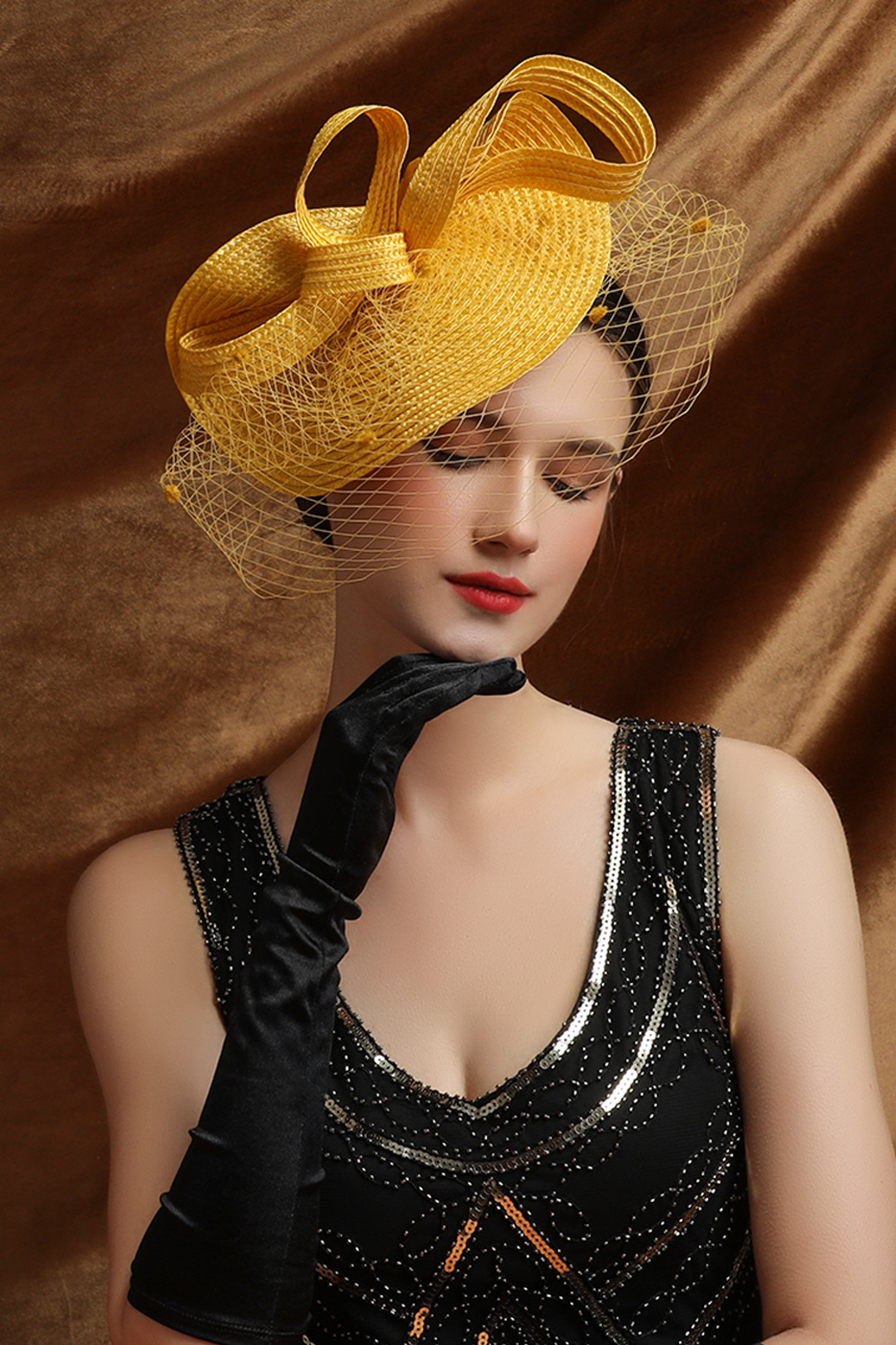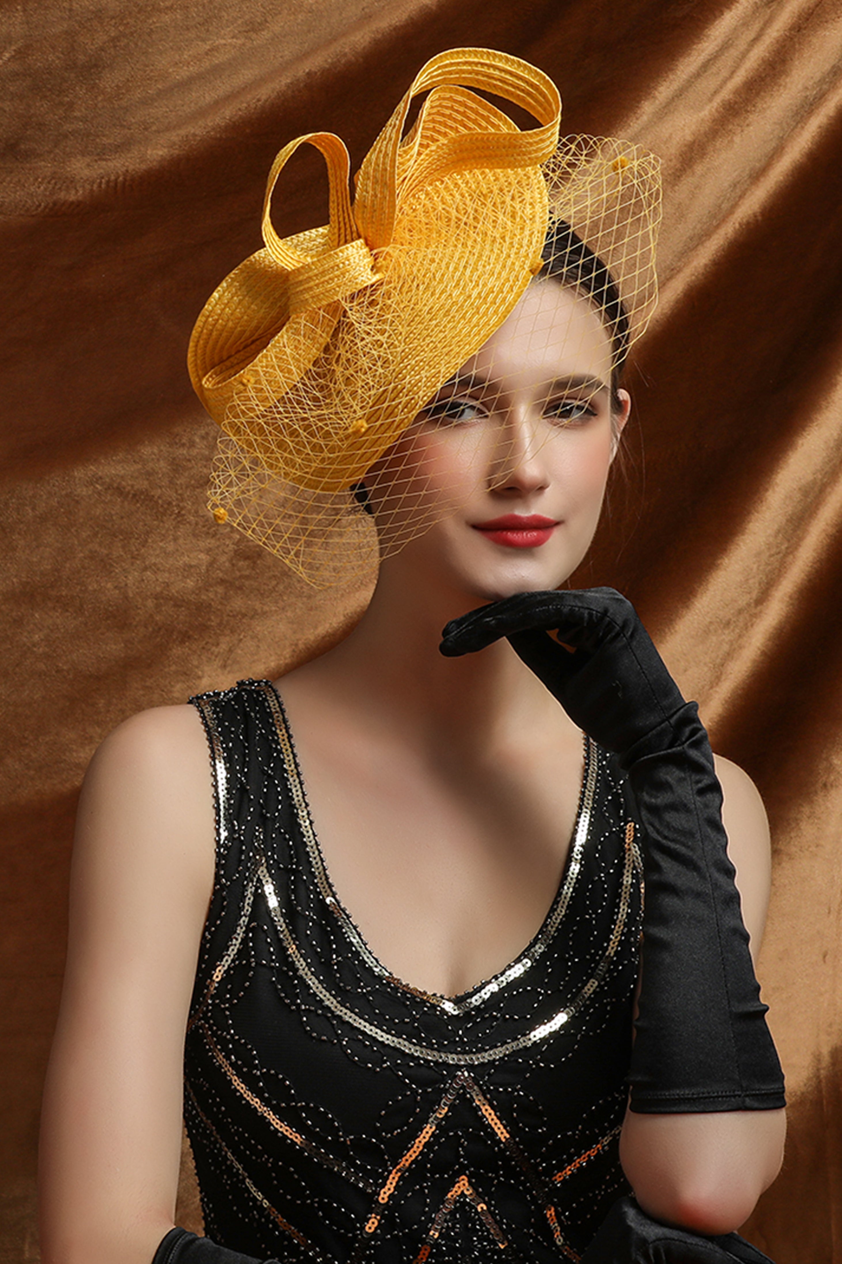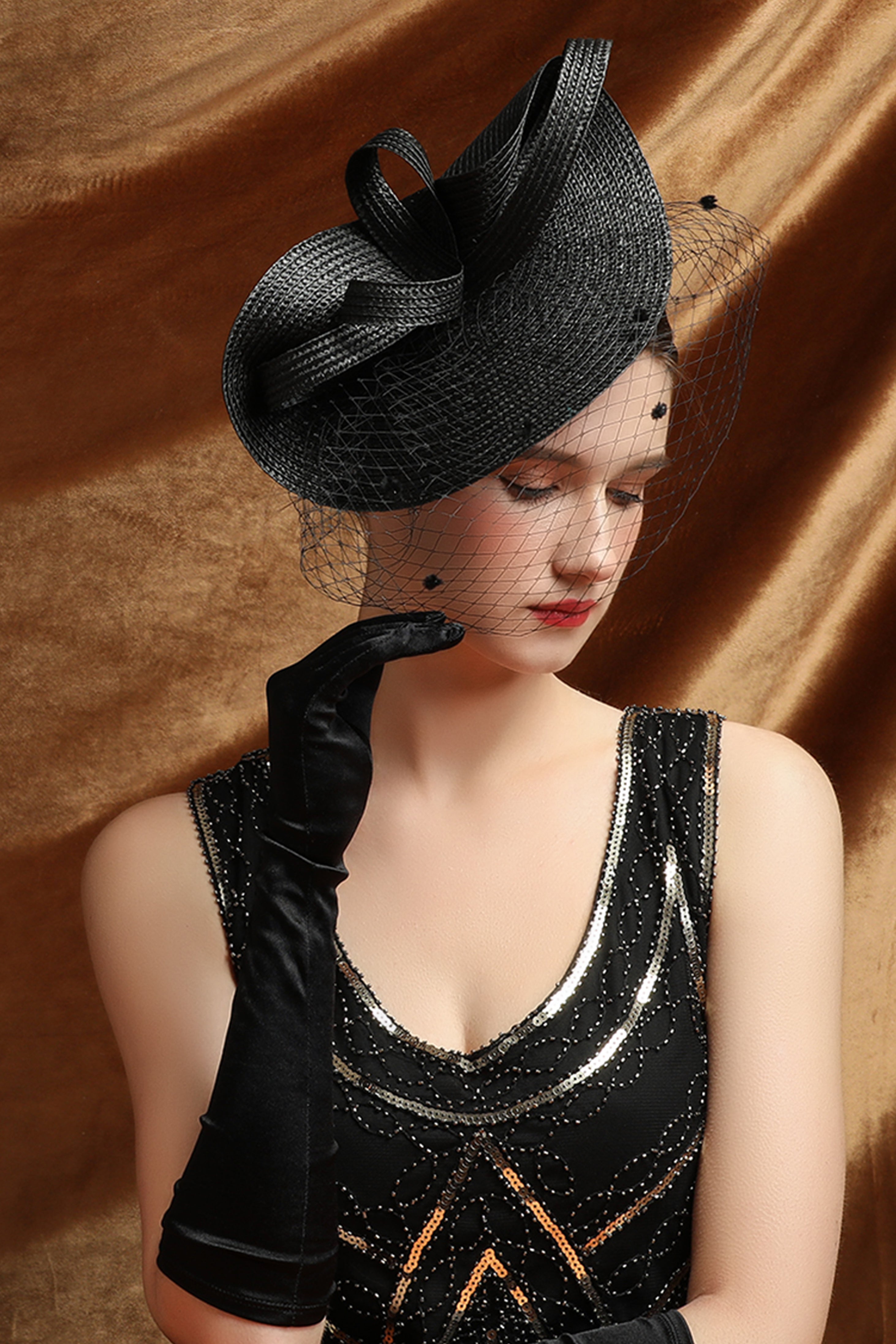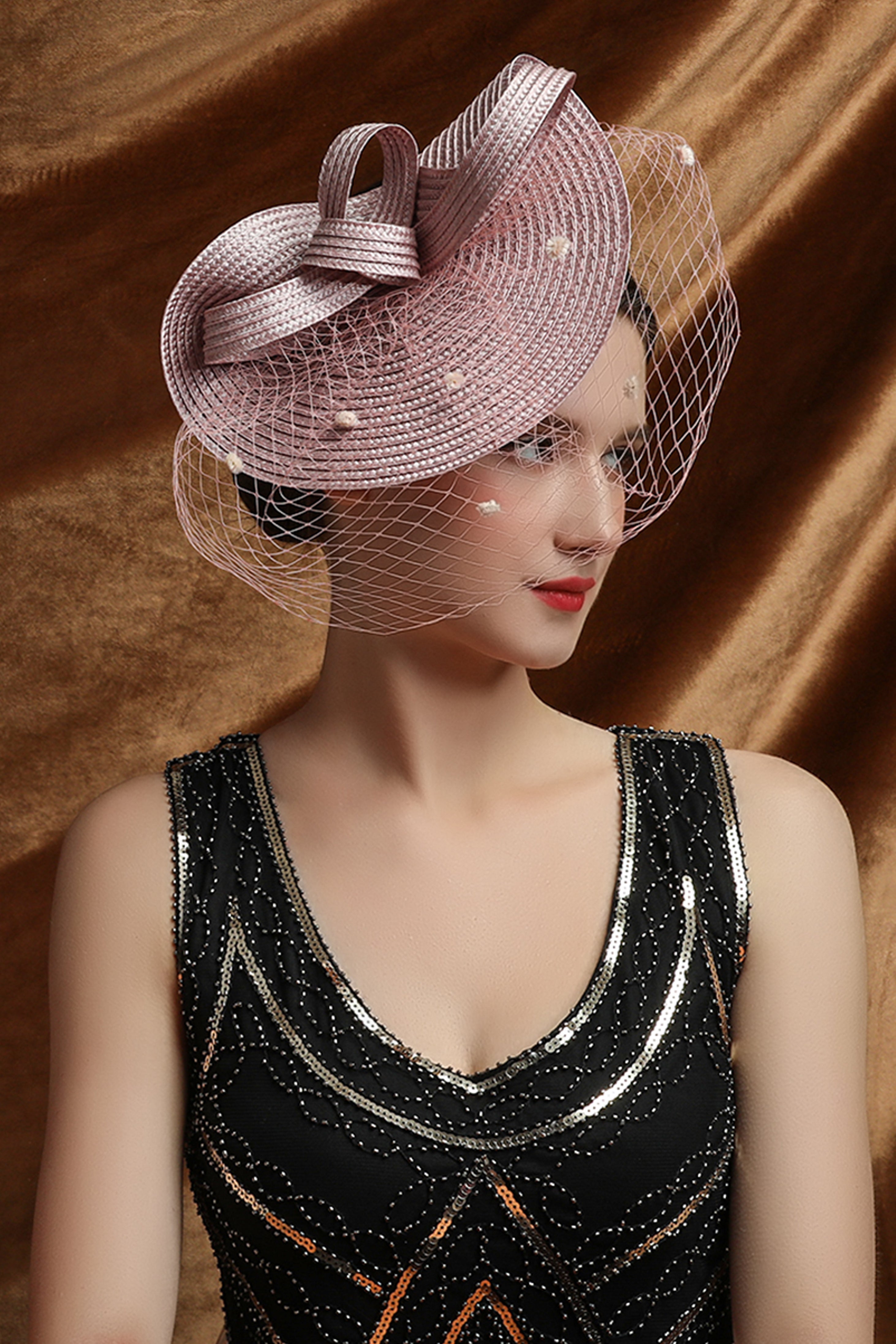 This race day fascinator features a sculpted ribbon design, adorned with a light half veil and delicate fluffy accents, exuding timeless elegance and vintage charm.