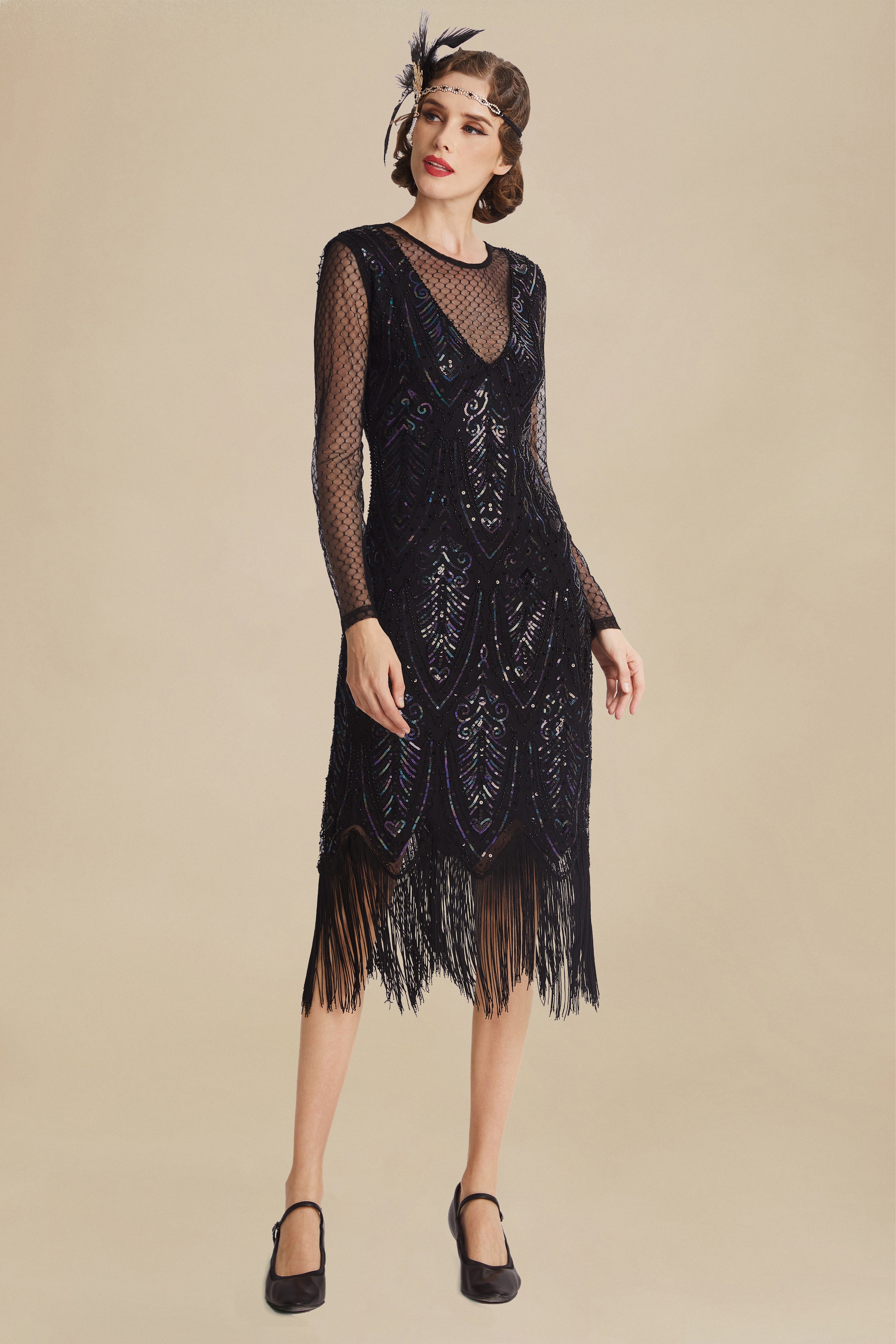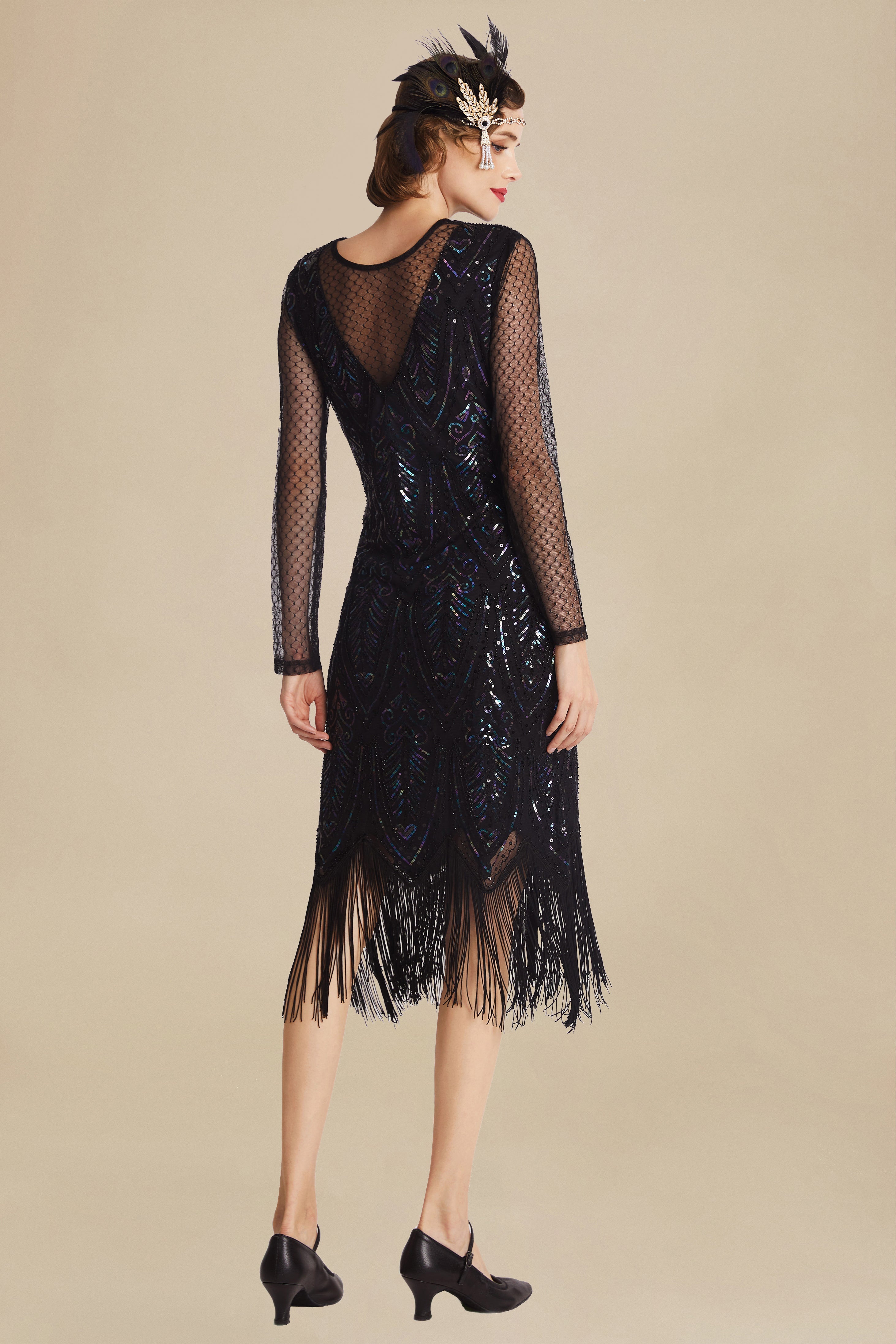 Elegant Sheer Sleeve Sequin Fringe Flapper Dress