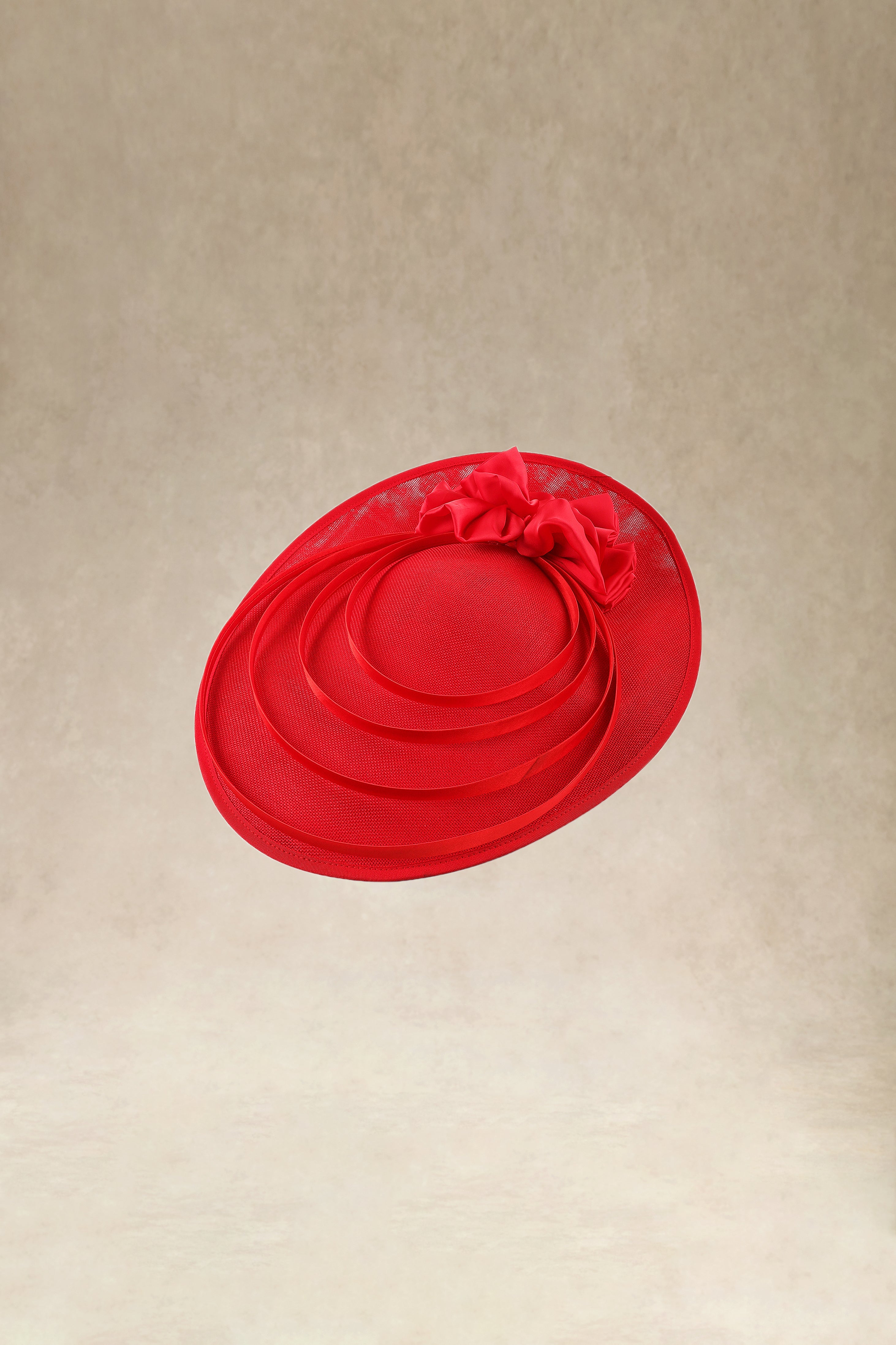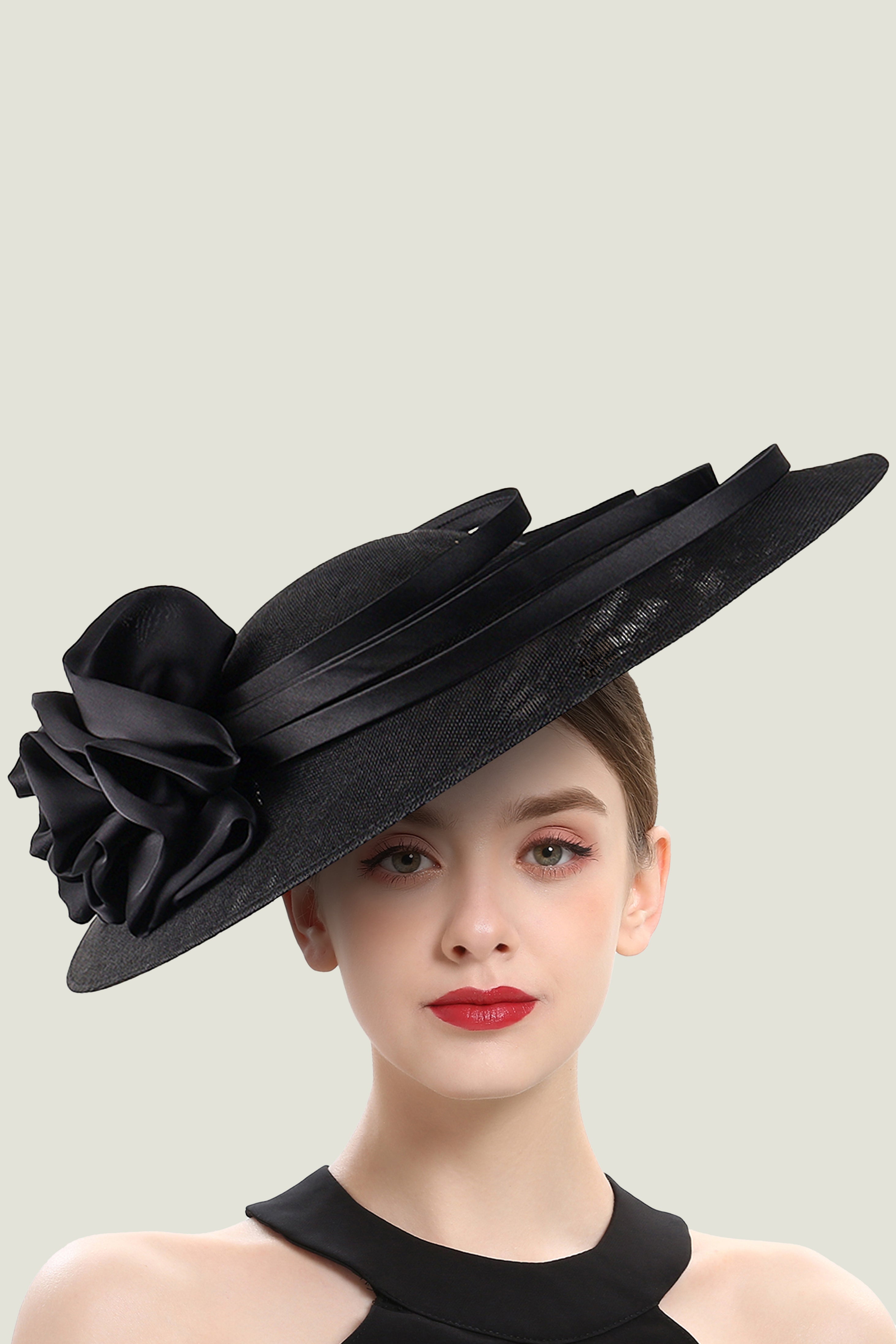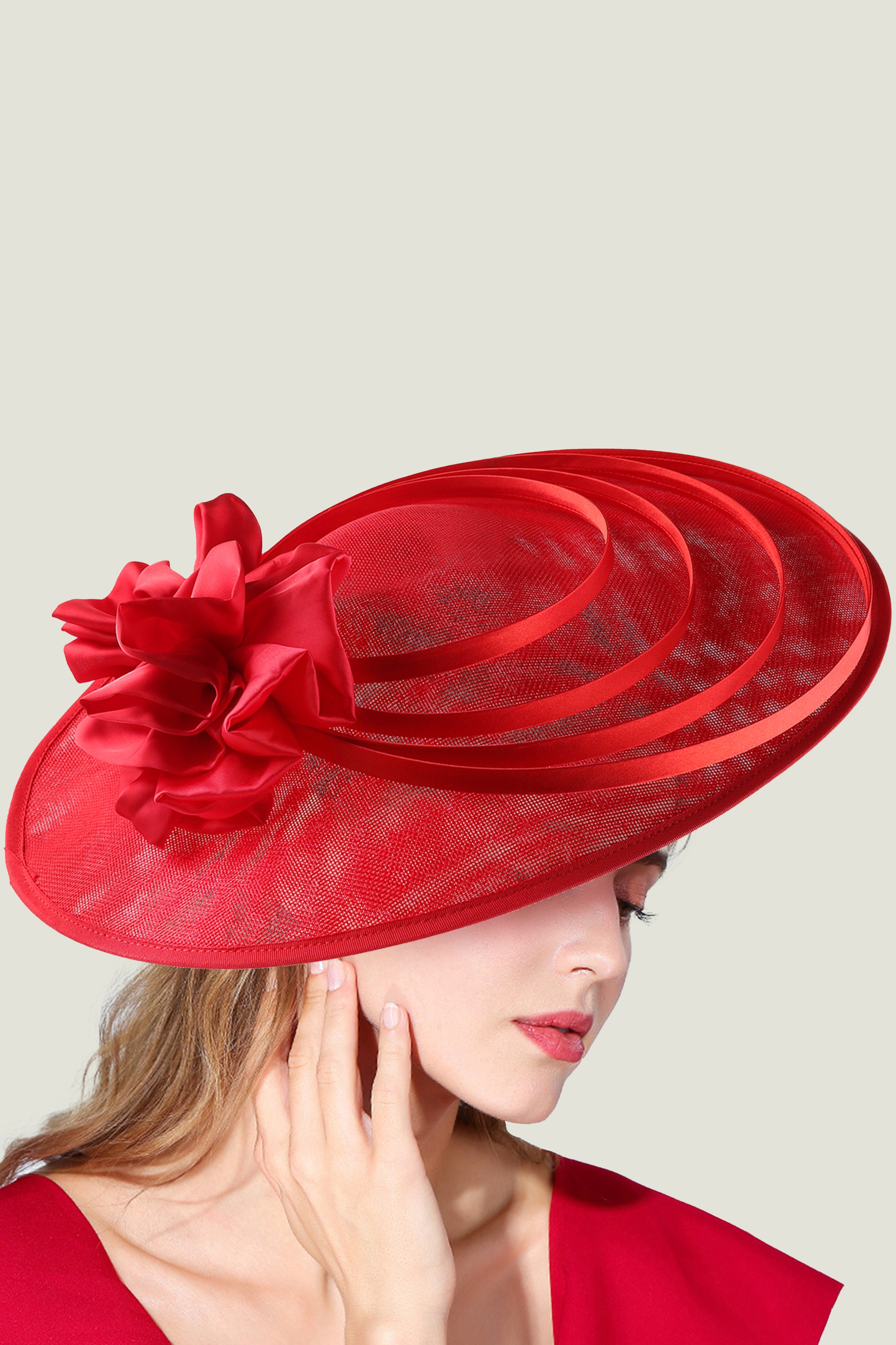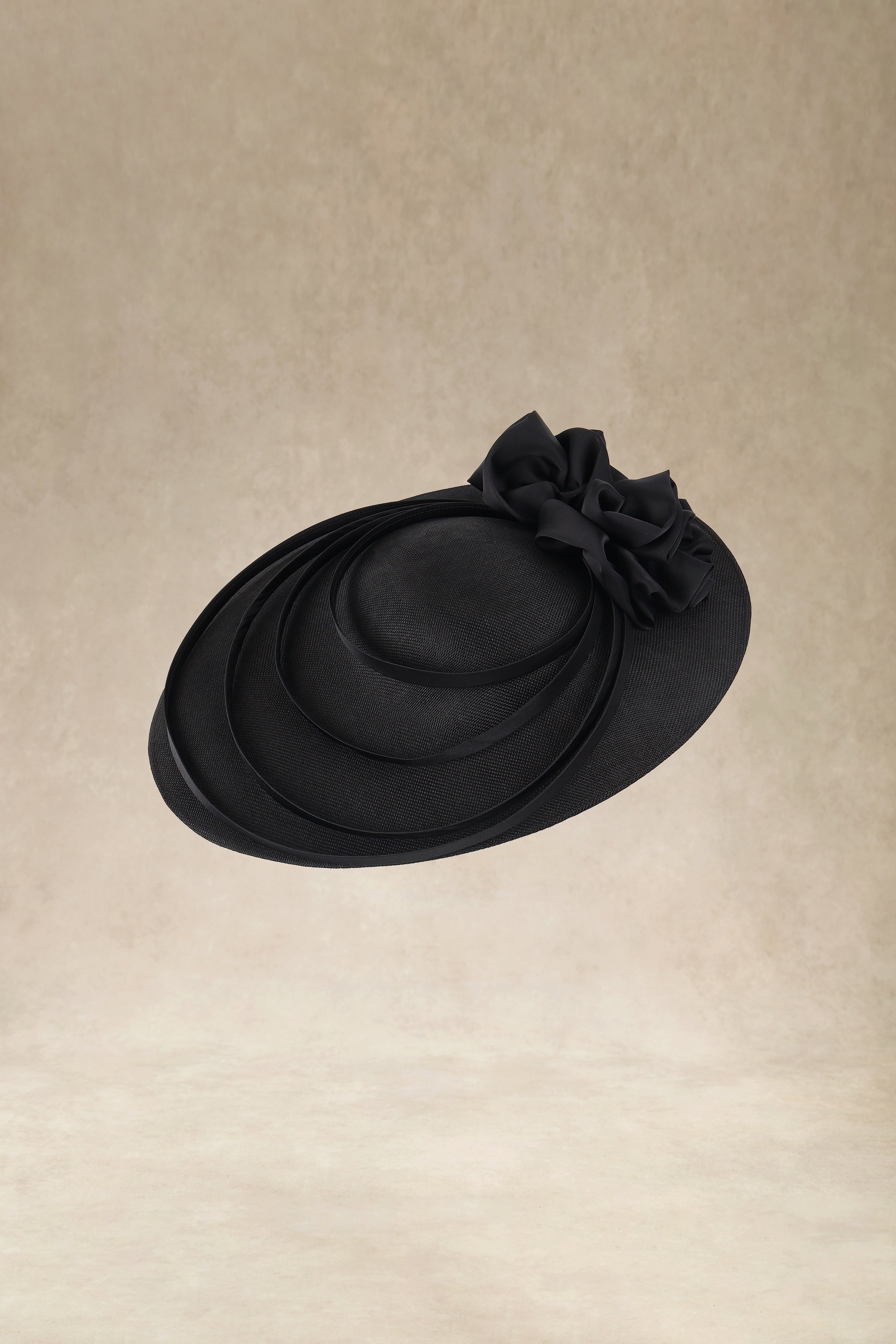 A statement piece with a wide-brim mesh design, adorned with layered satin ribbons and elegant floral accents.