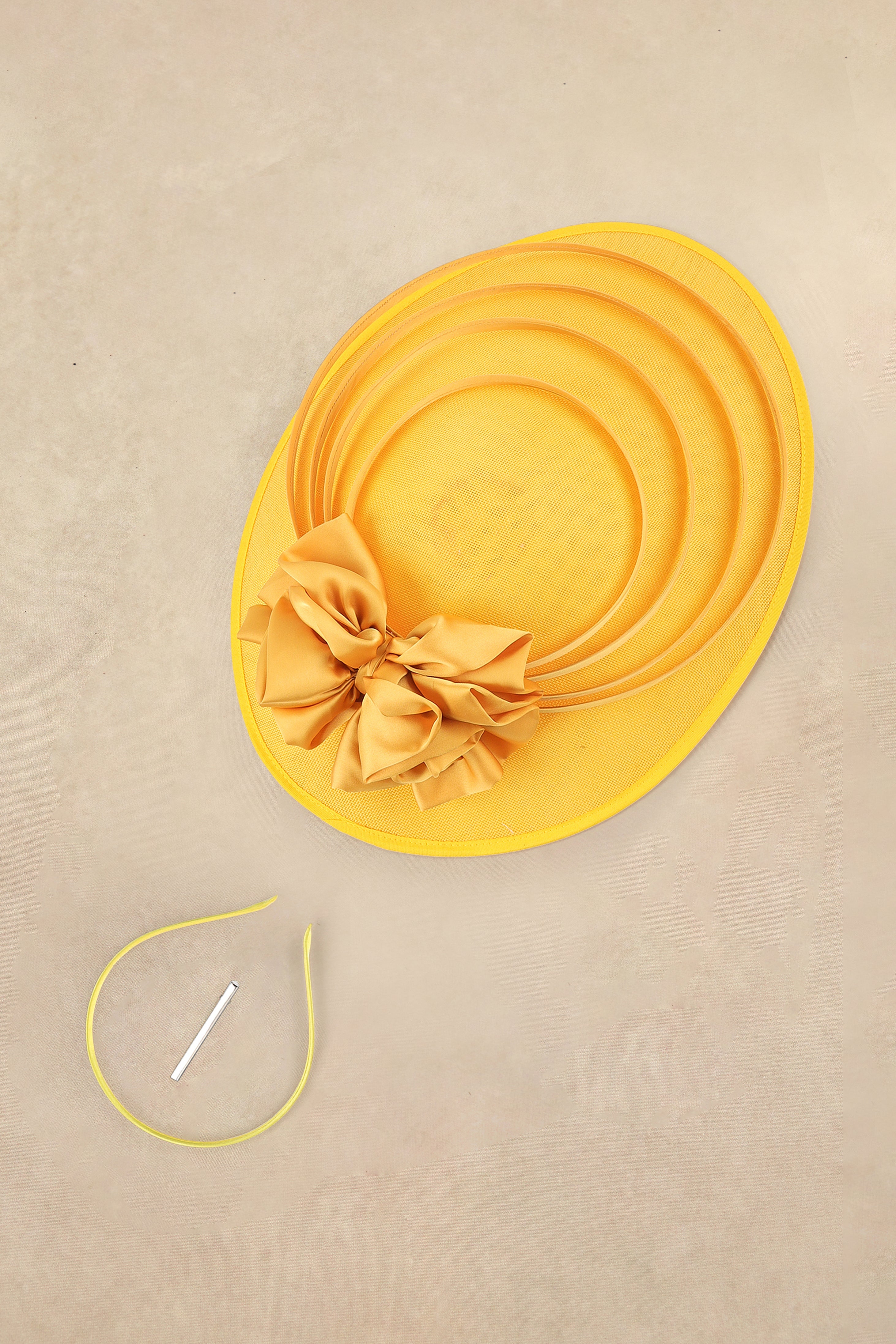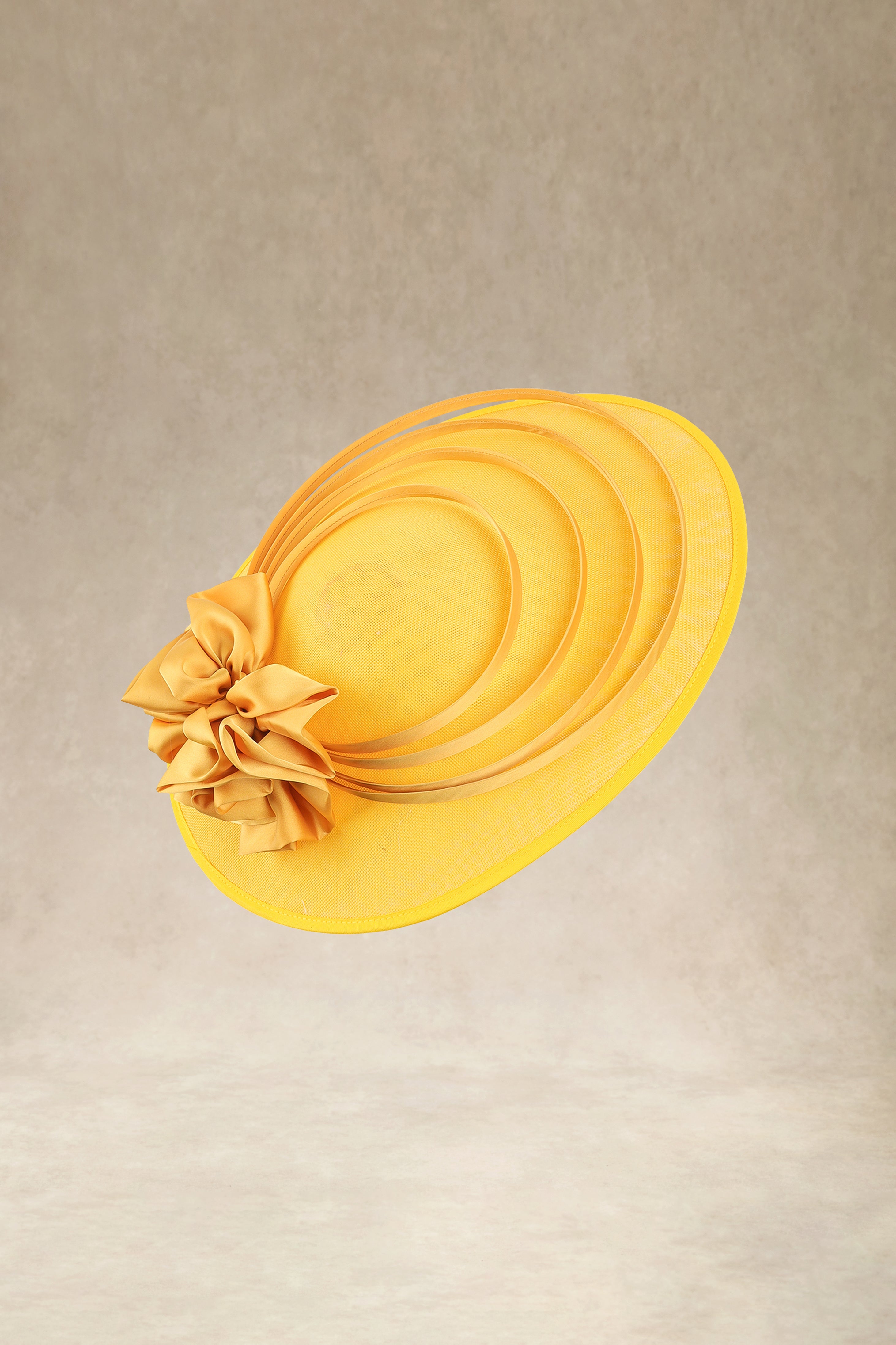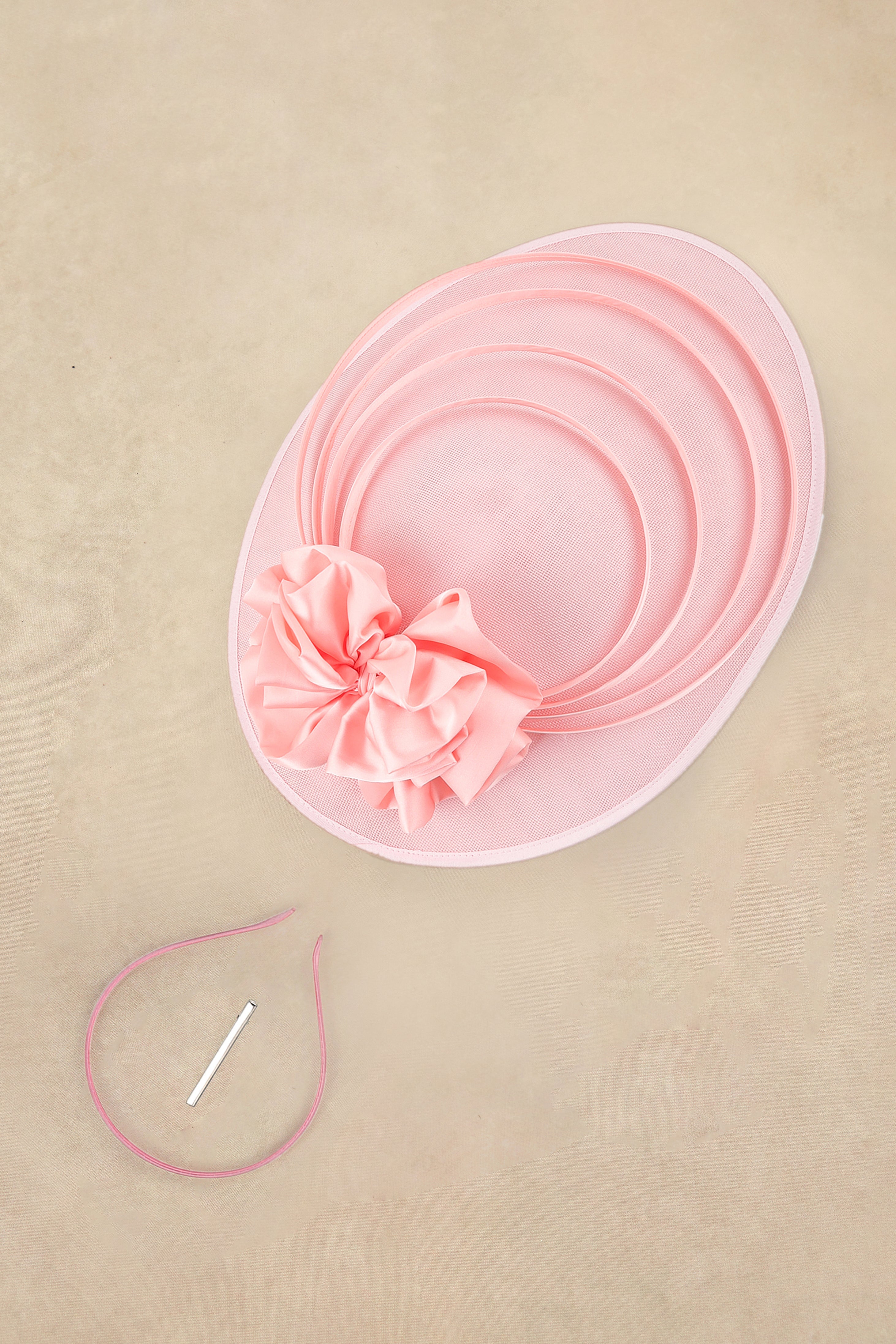 A statement piece with a wide-brim mesh design, adorned with layered satin ribbons and elegant floral accents.