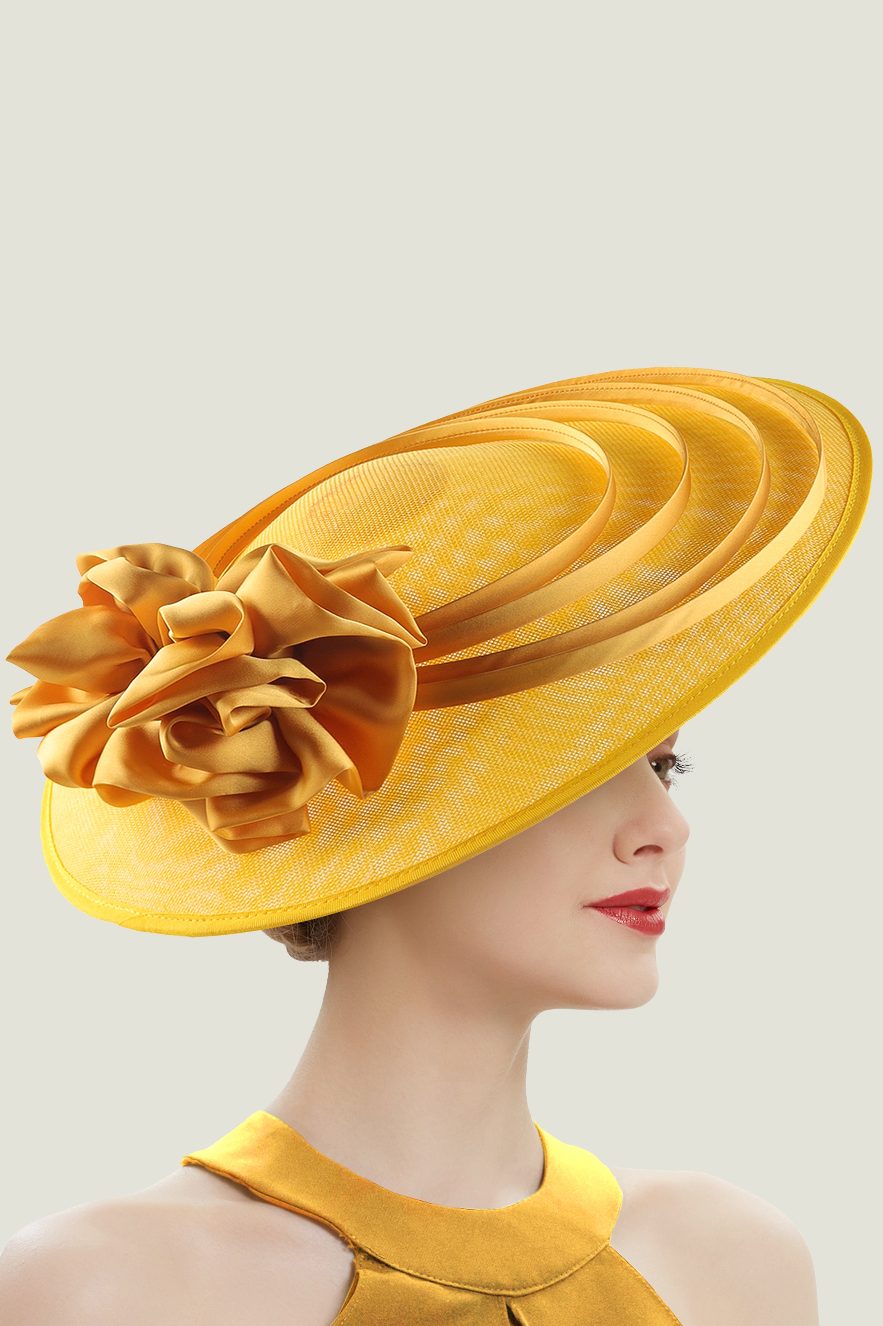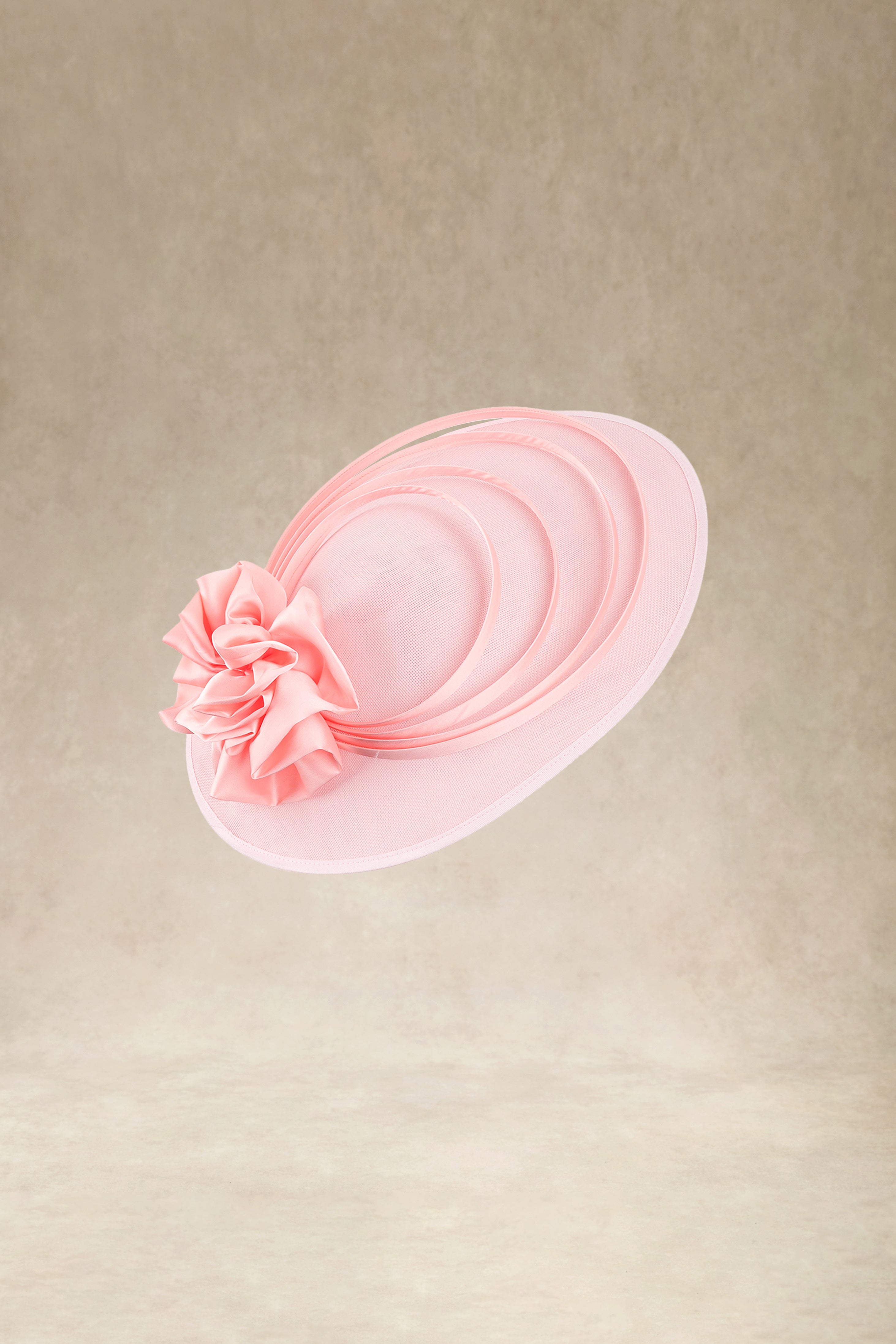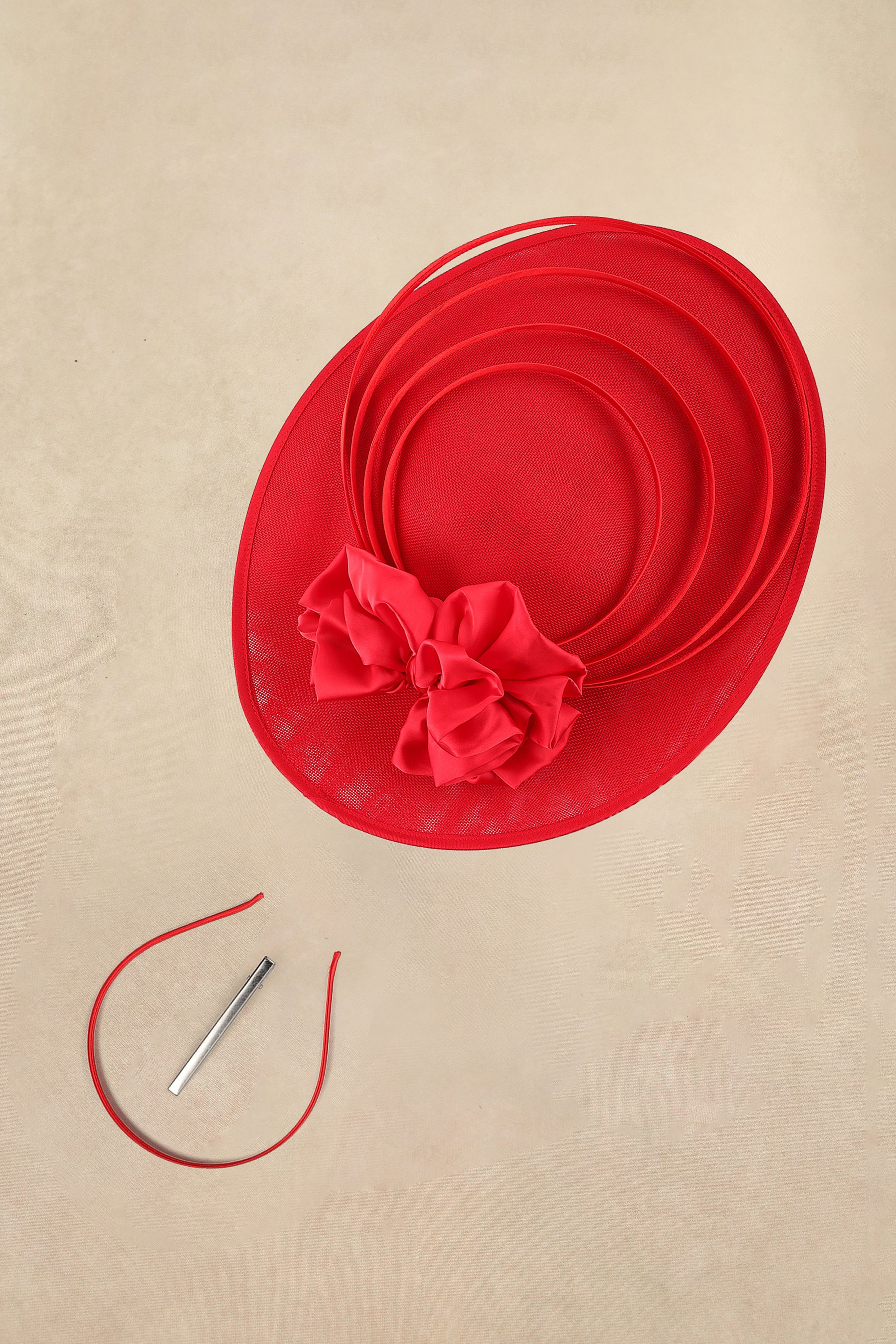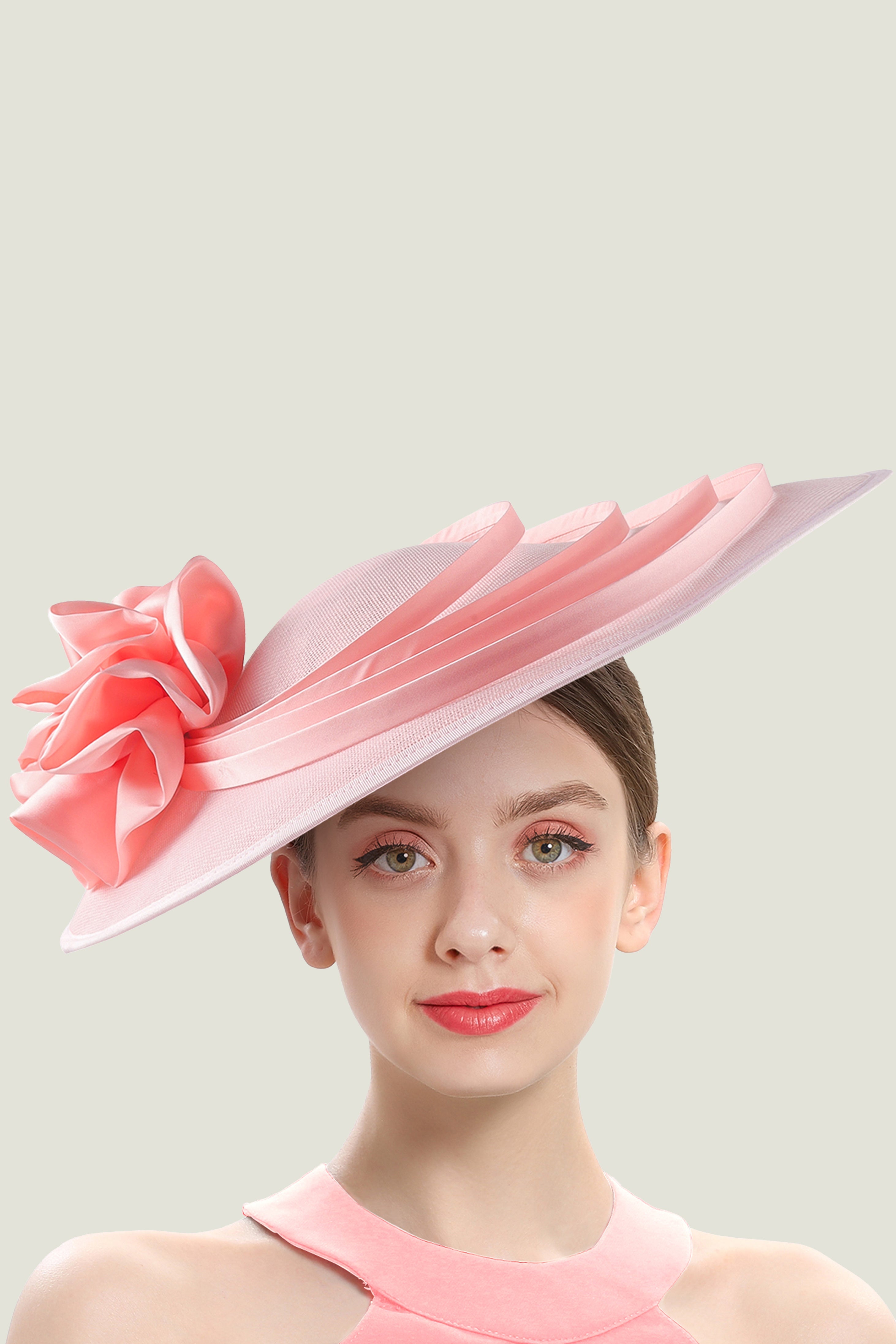A statement piece with a wide-brim mesh design, adorned with layered satin ribbons and elegant floral accents.