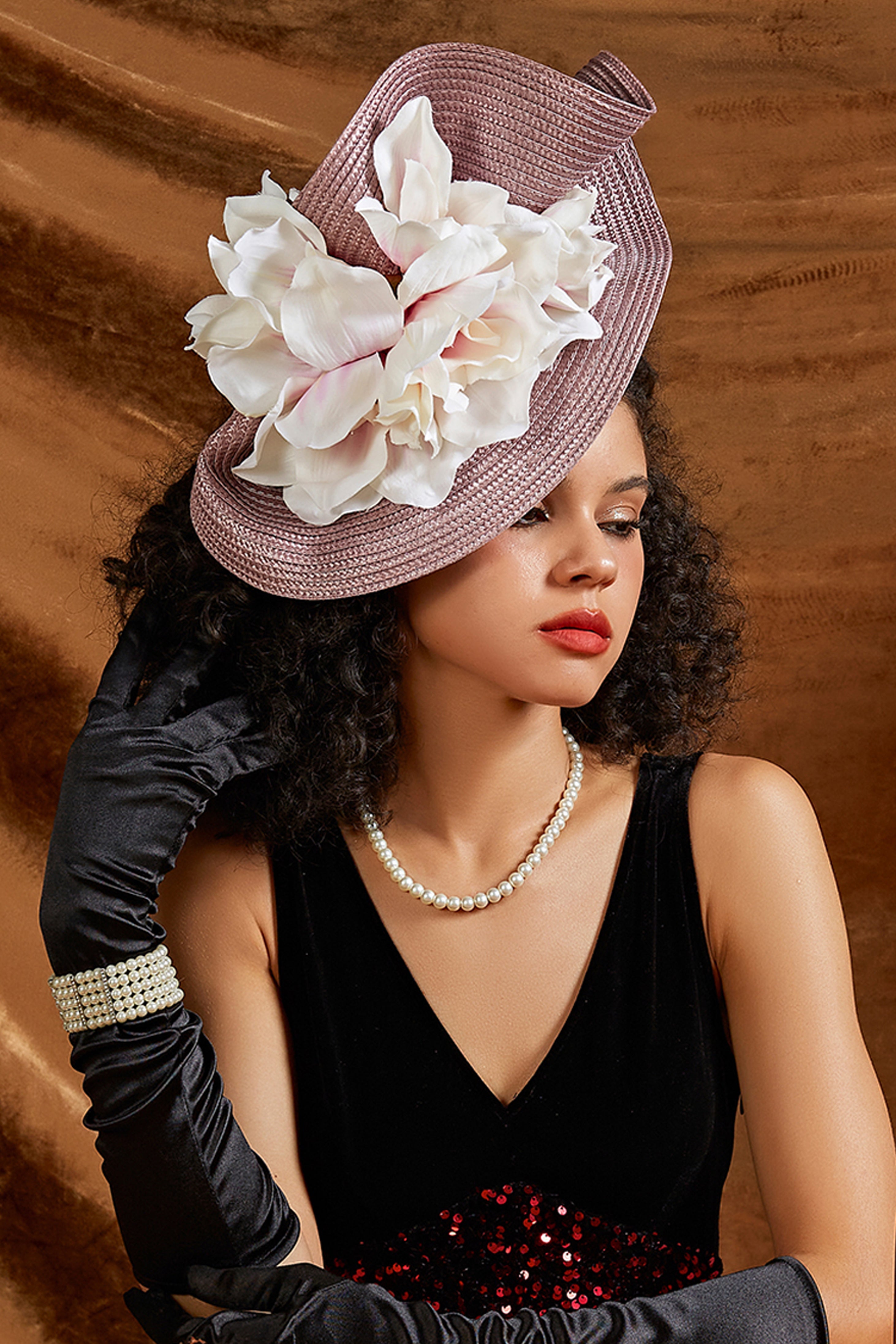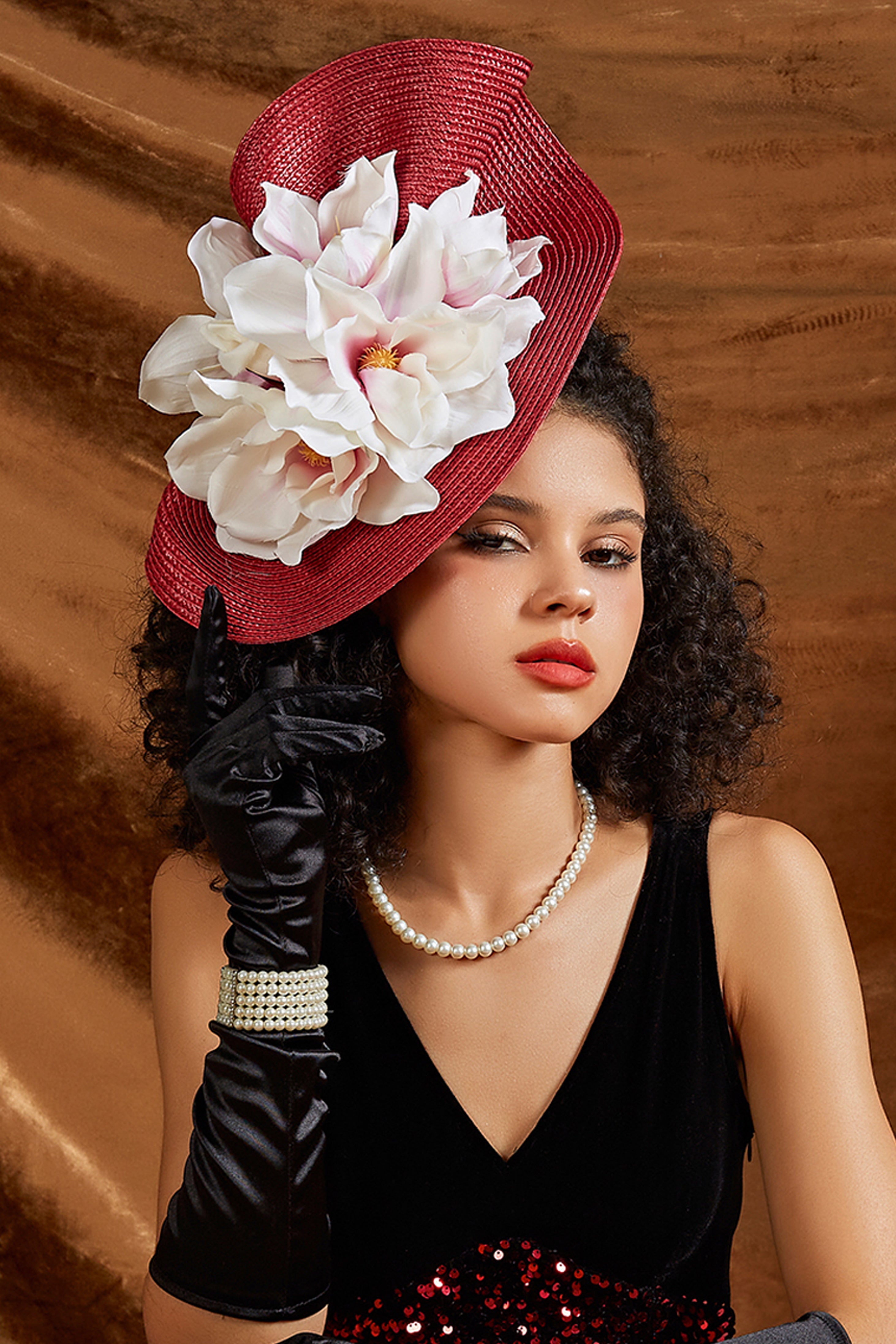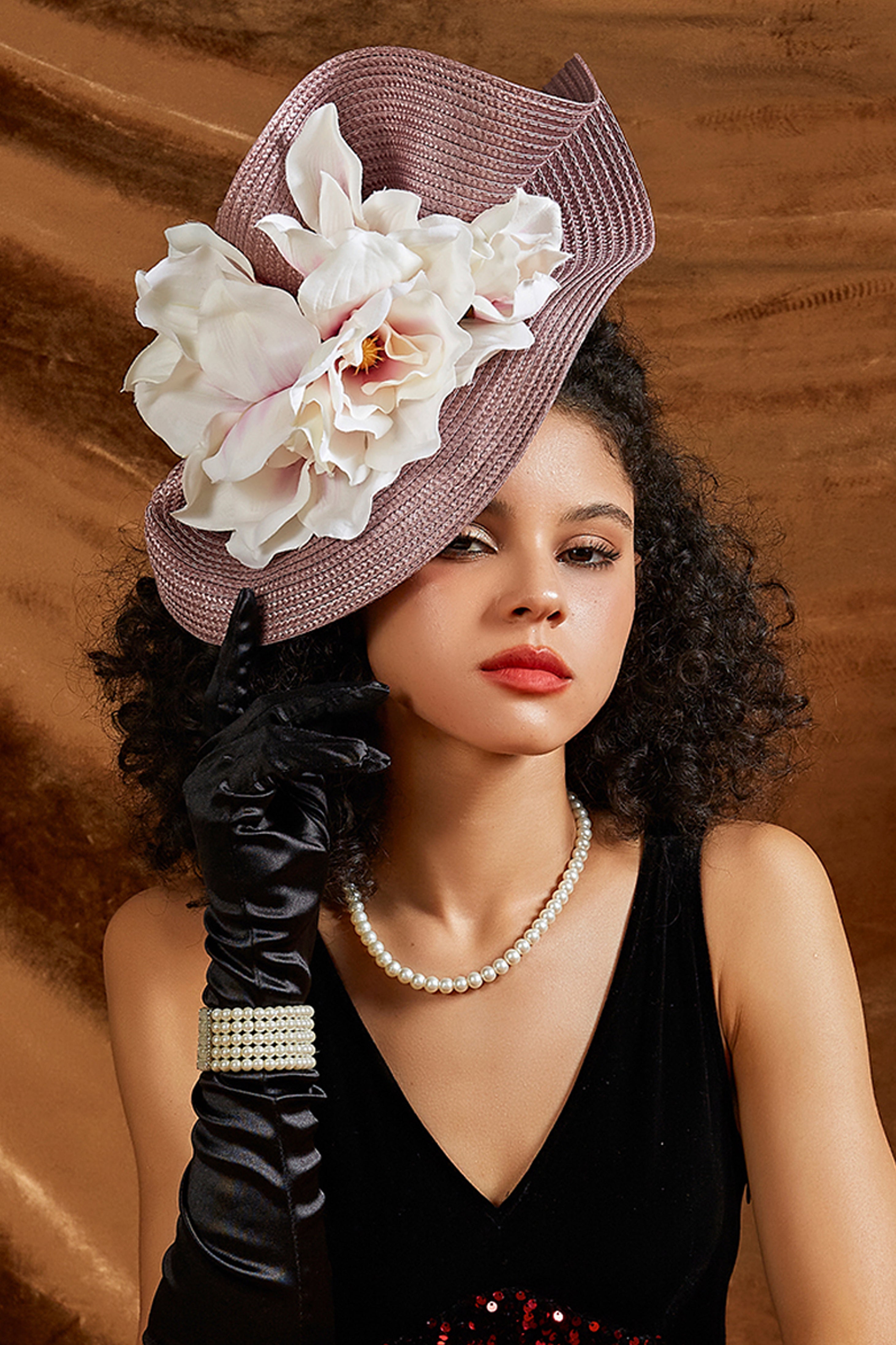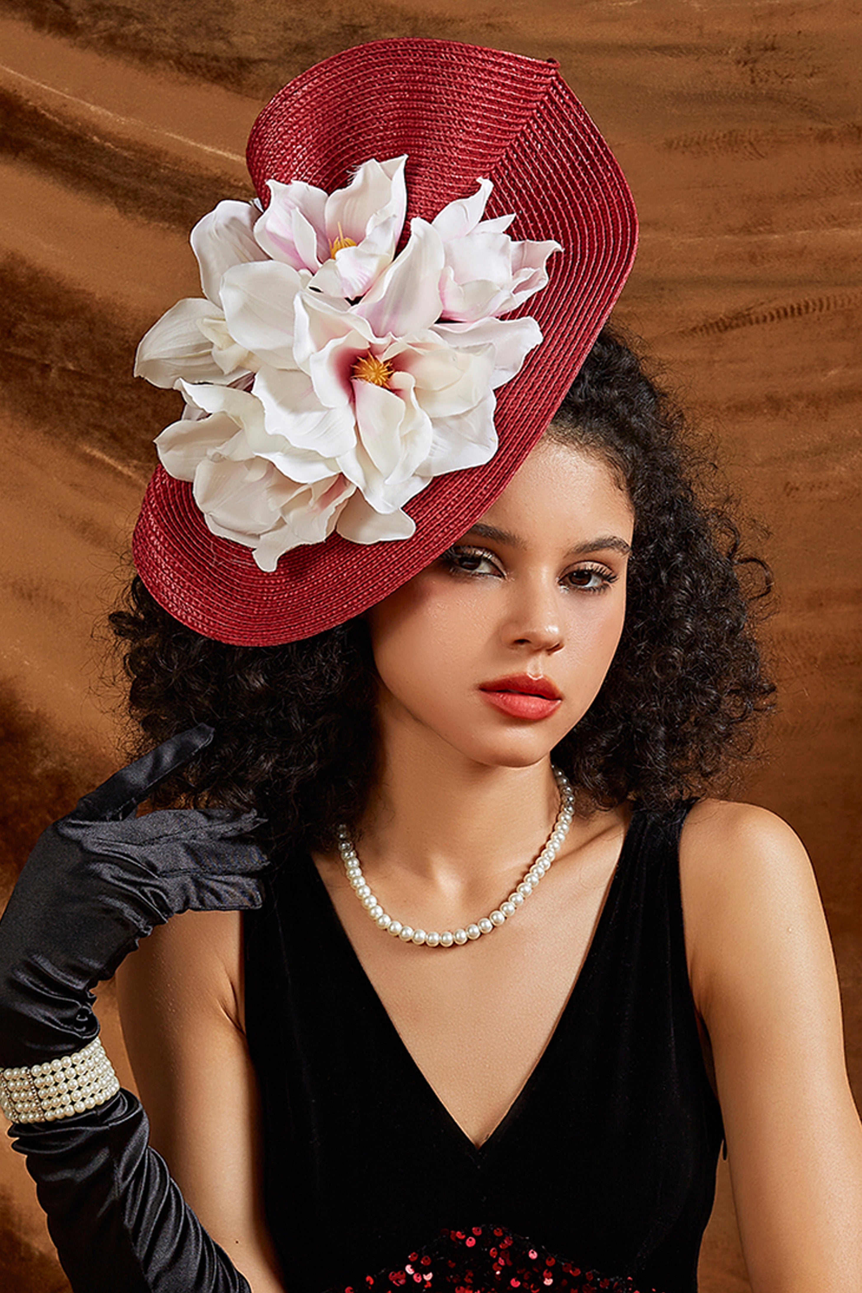 Make a statement with this Elegant Floral Wide-Brim Fascinator, featuring a dramatic curved design and stunning oversized flowers.