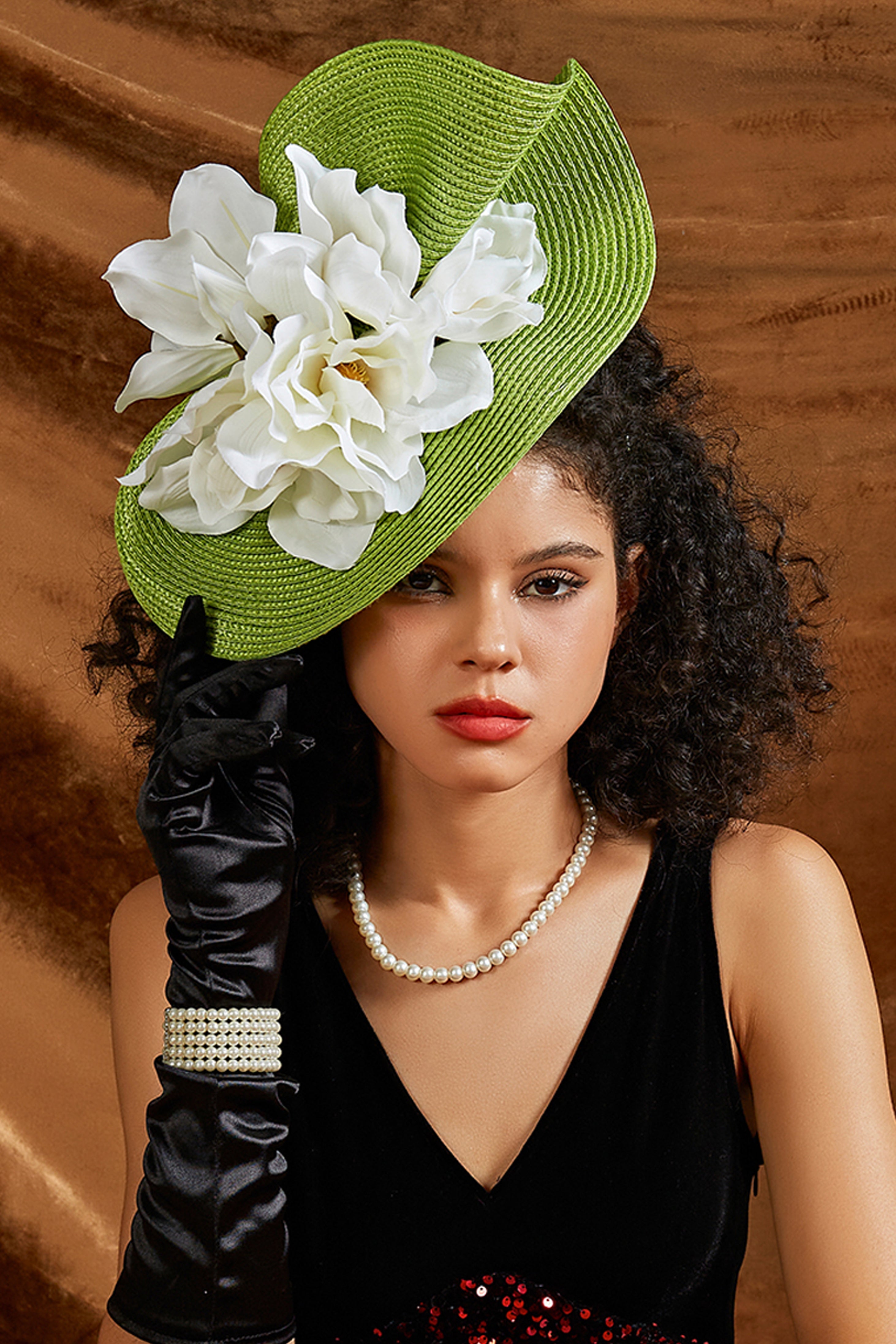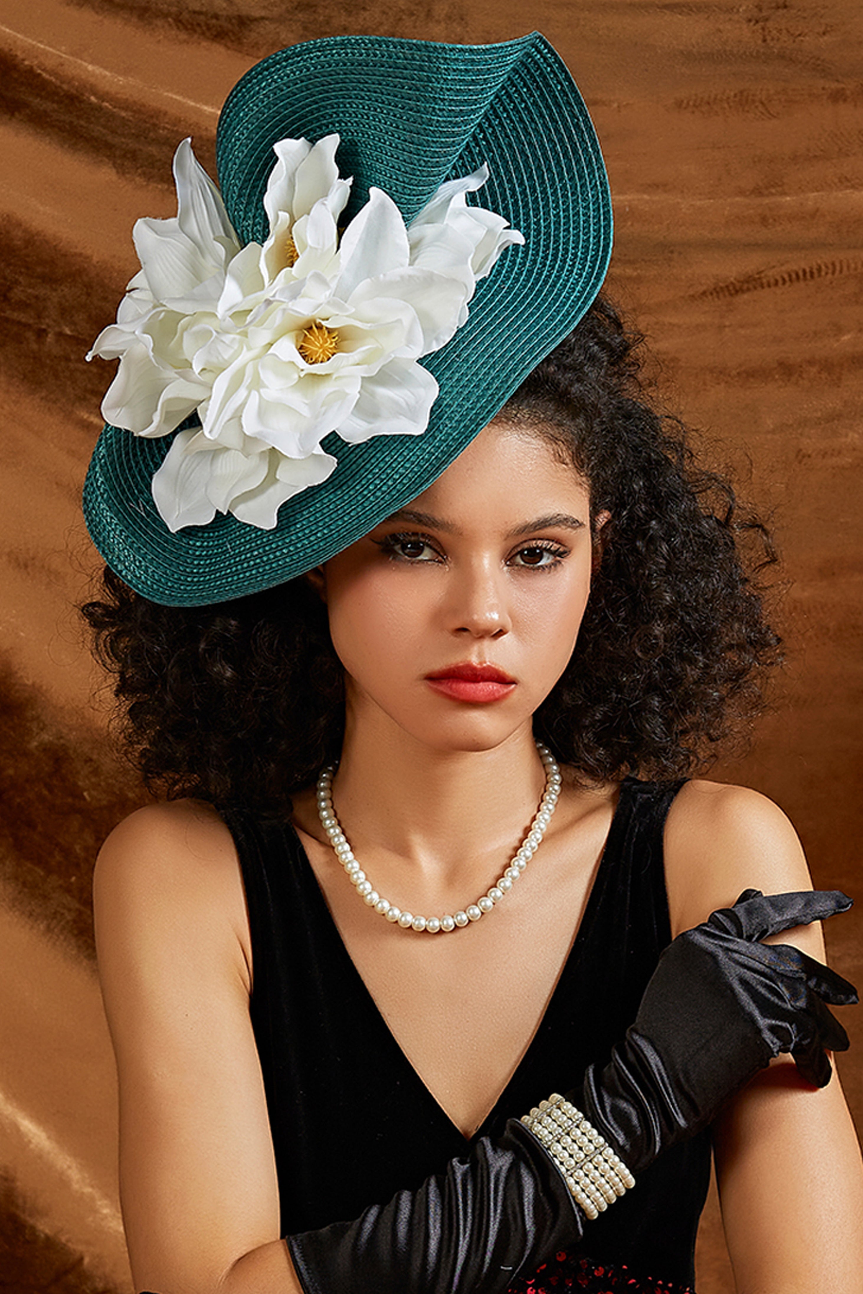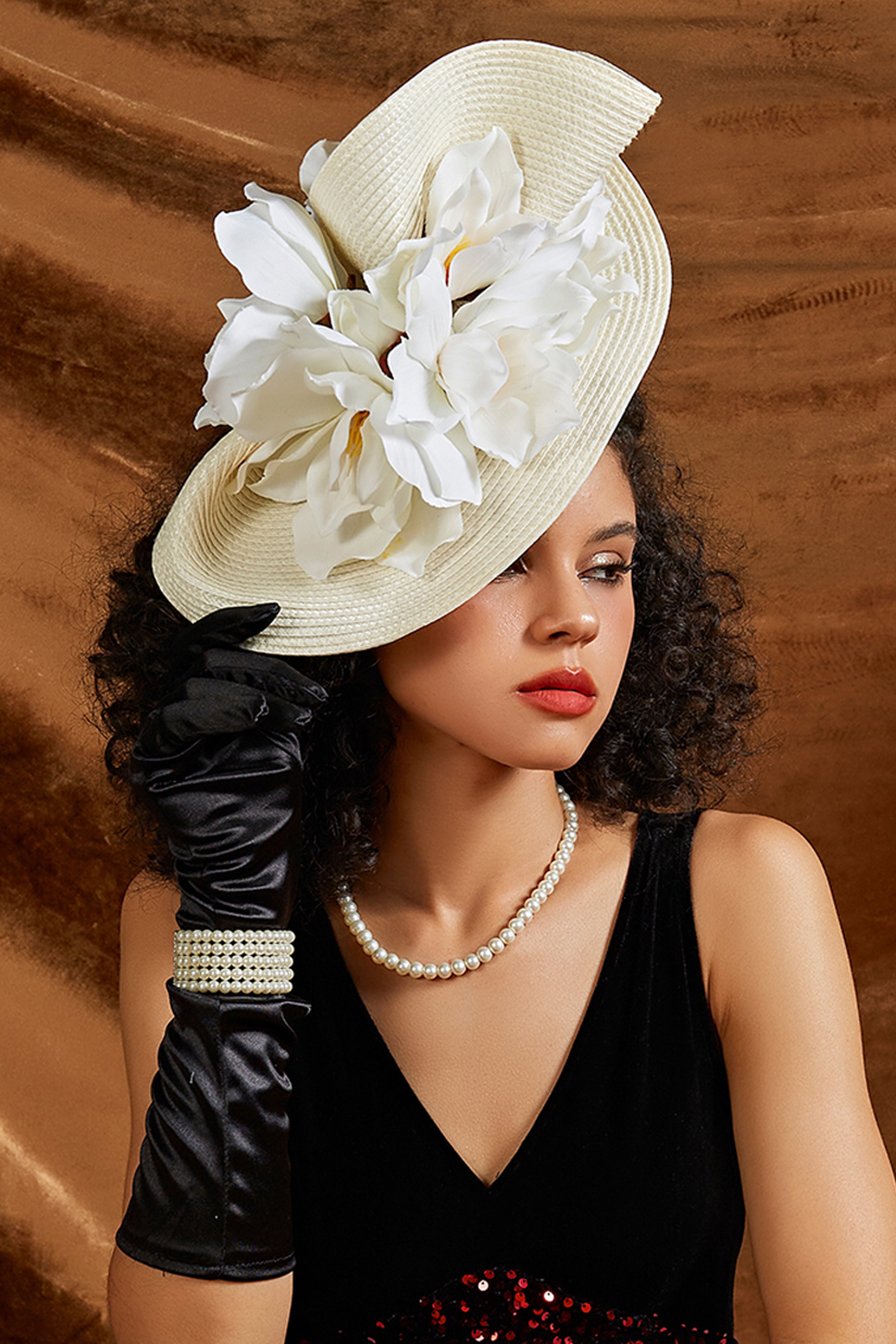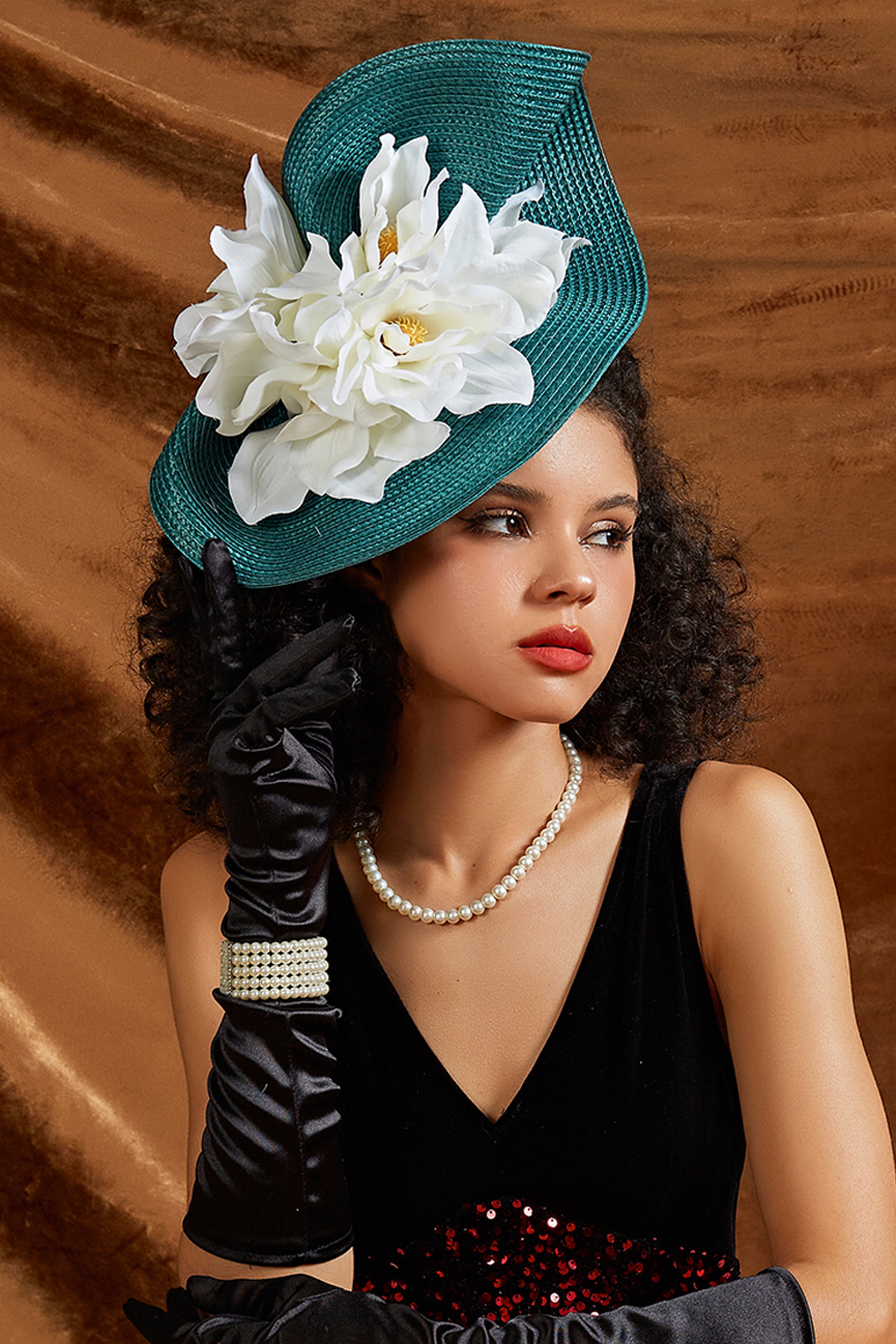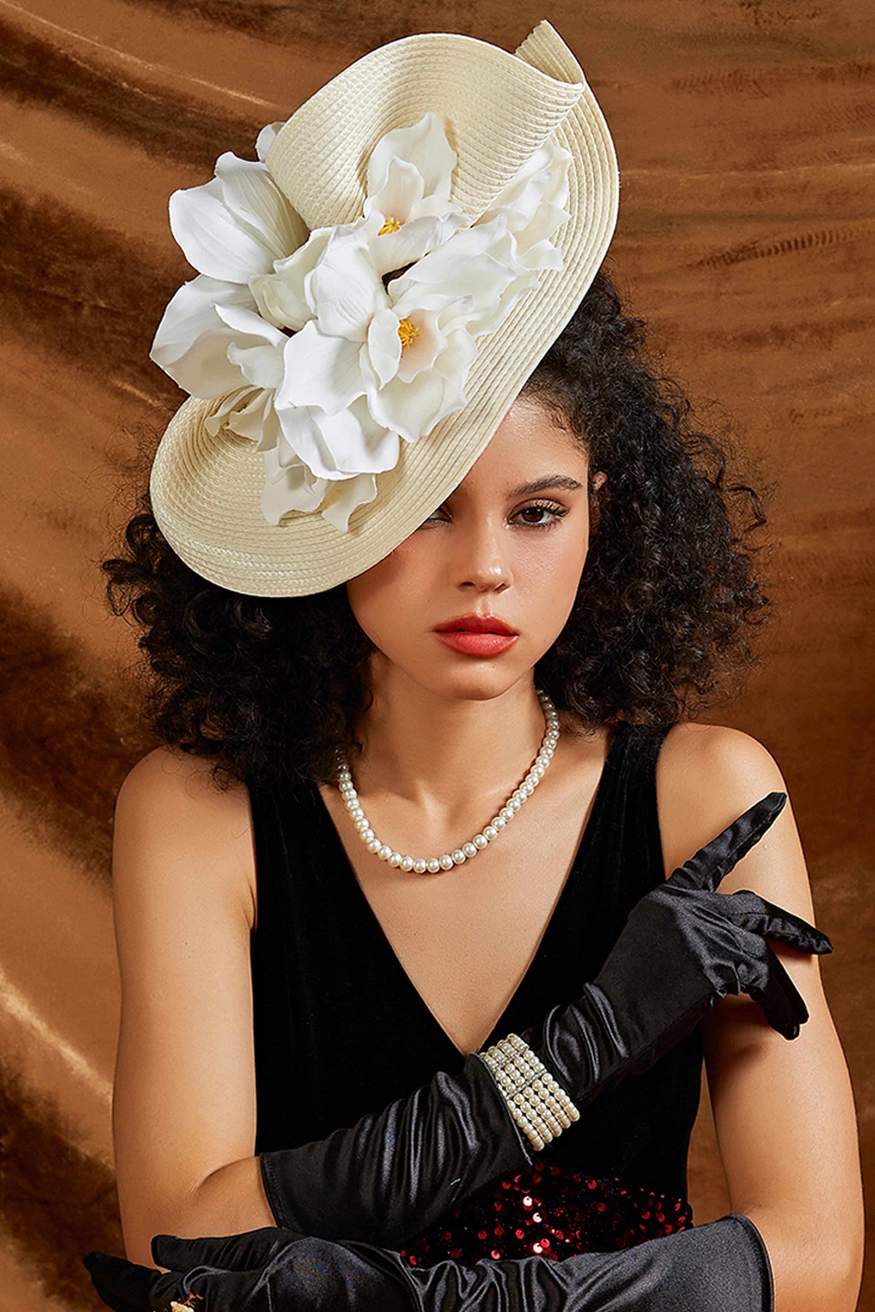 Make a statement with this Elegant Floral Wide-Brim Fascinator, featuring a dramatic curved design and stunning oversized flowers.