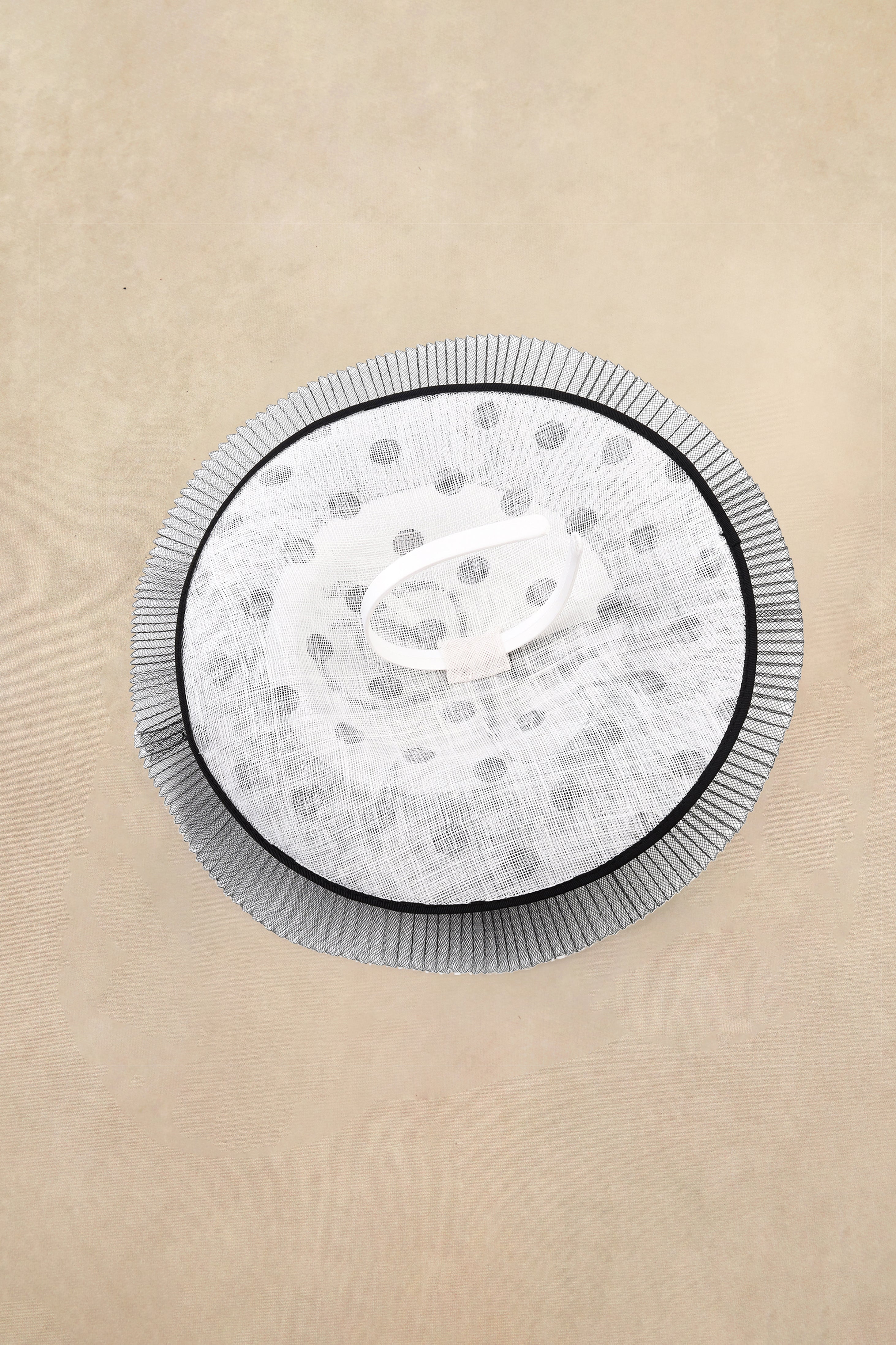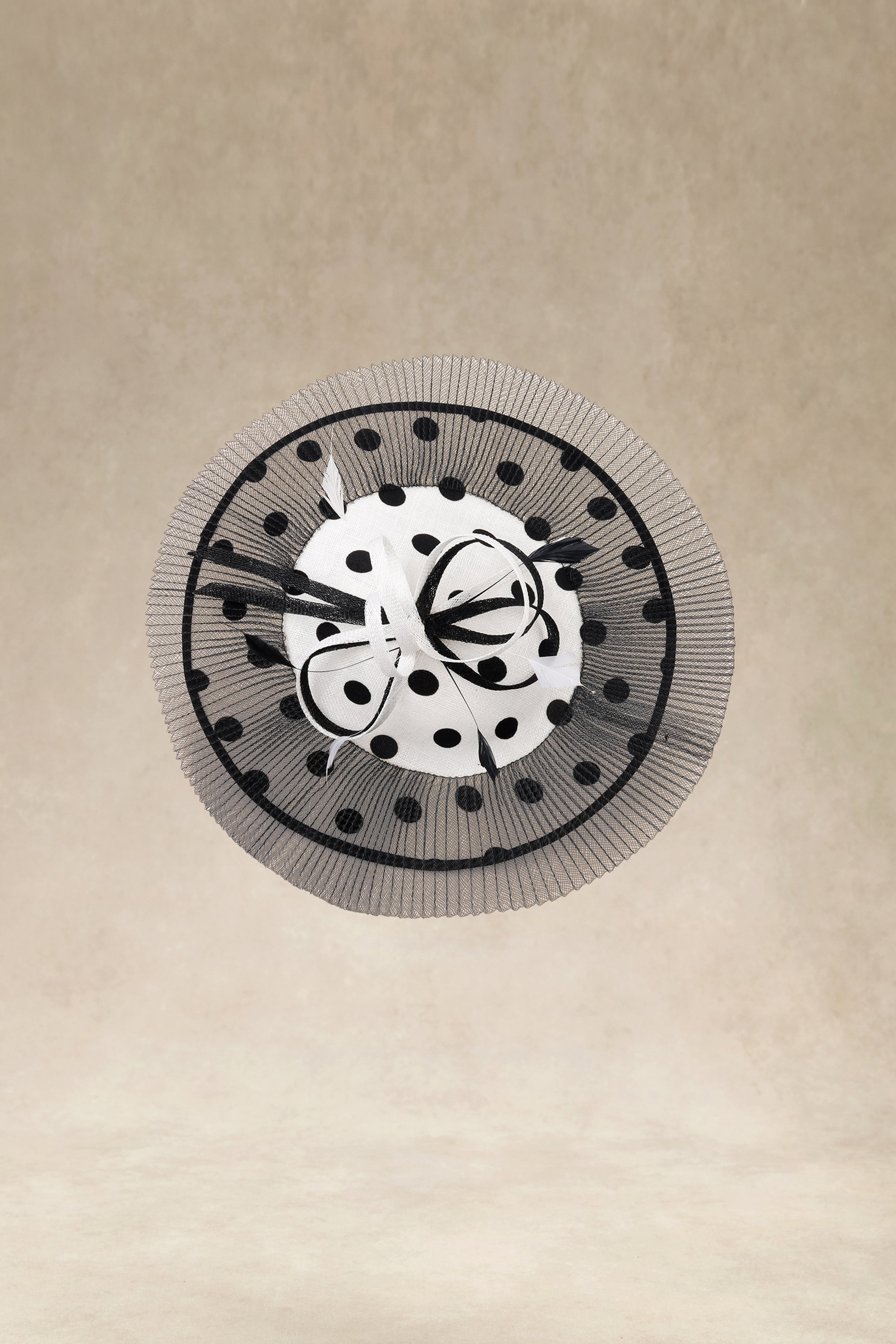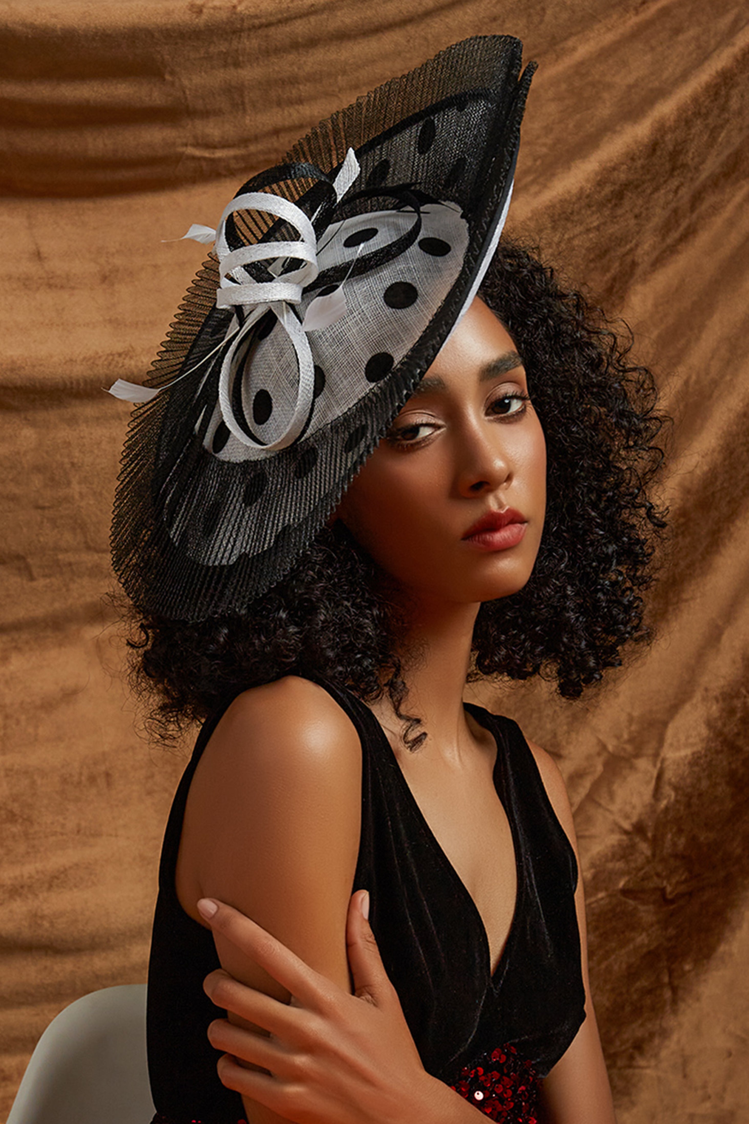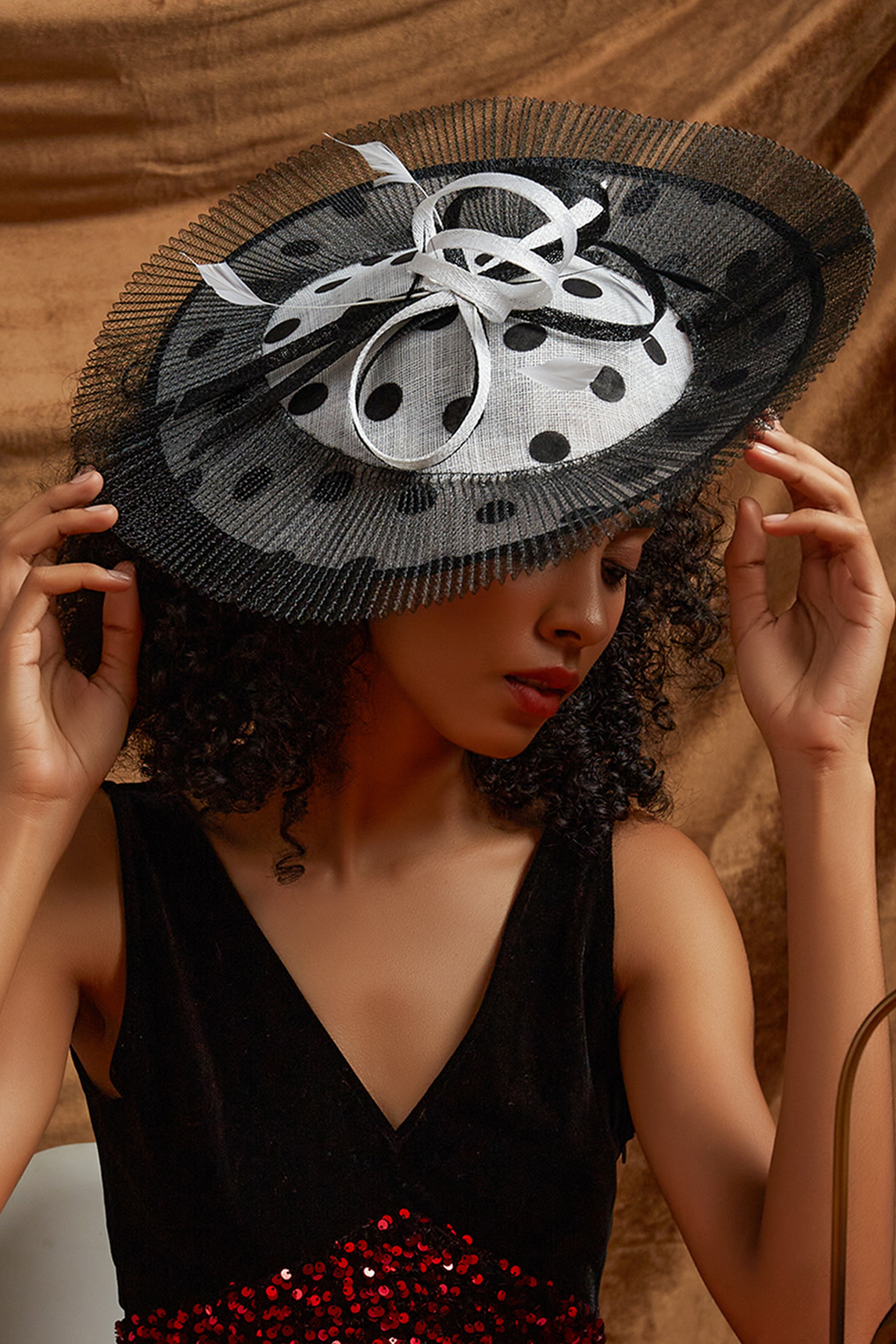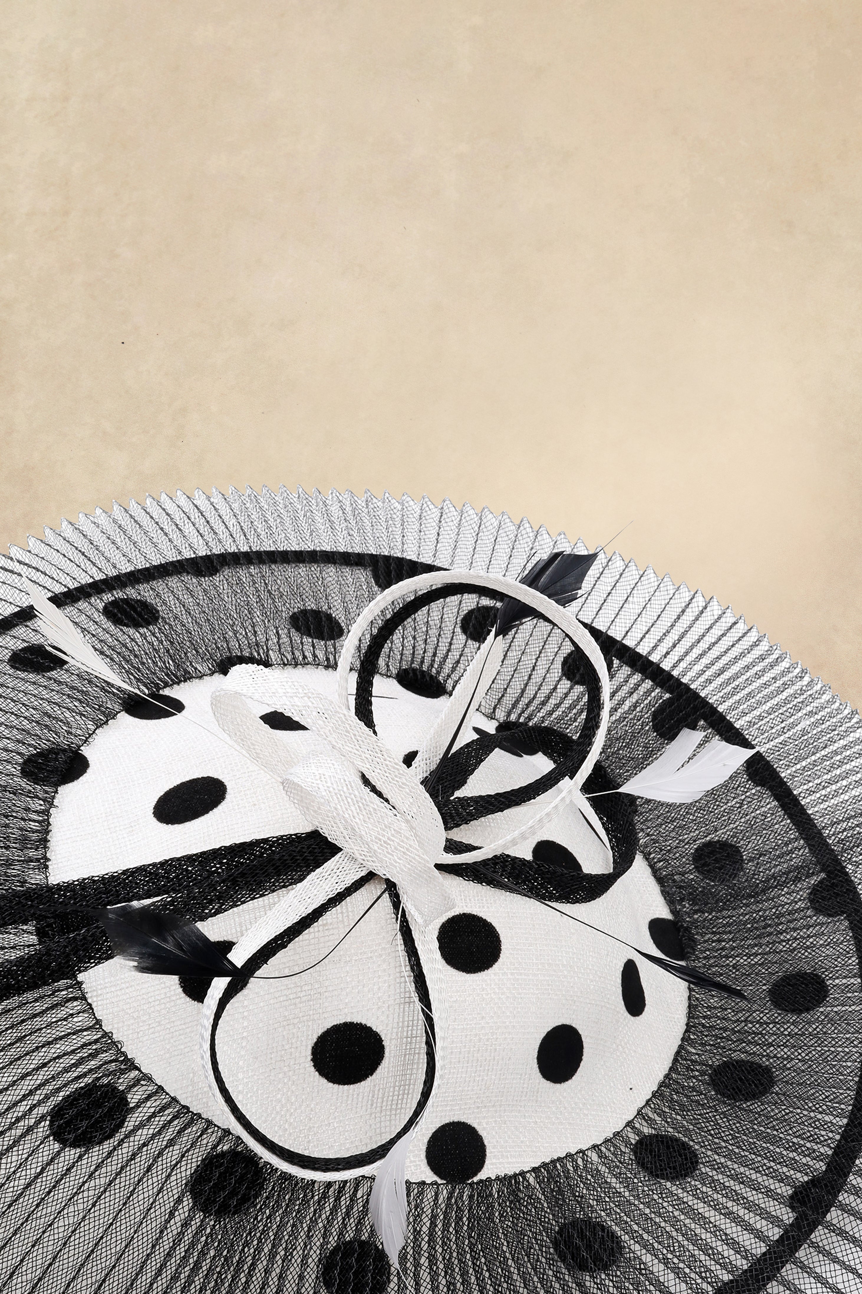 A stylish black-and-white polka dot fascinator with feathers and ribbons, perfect for adding elegance and playfulness to your race day look.