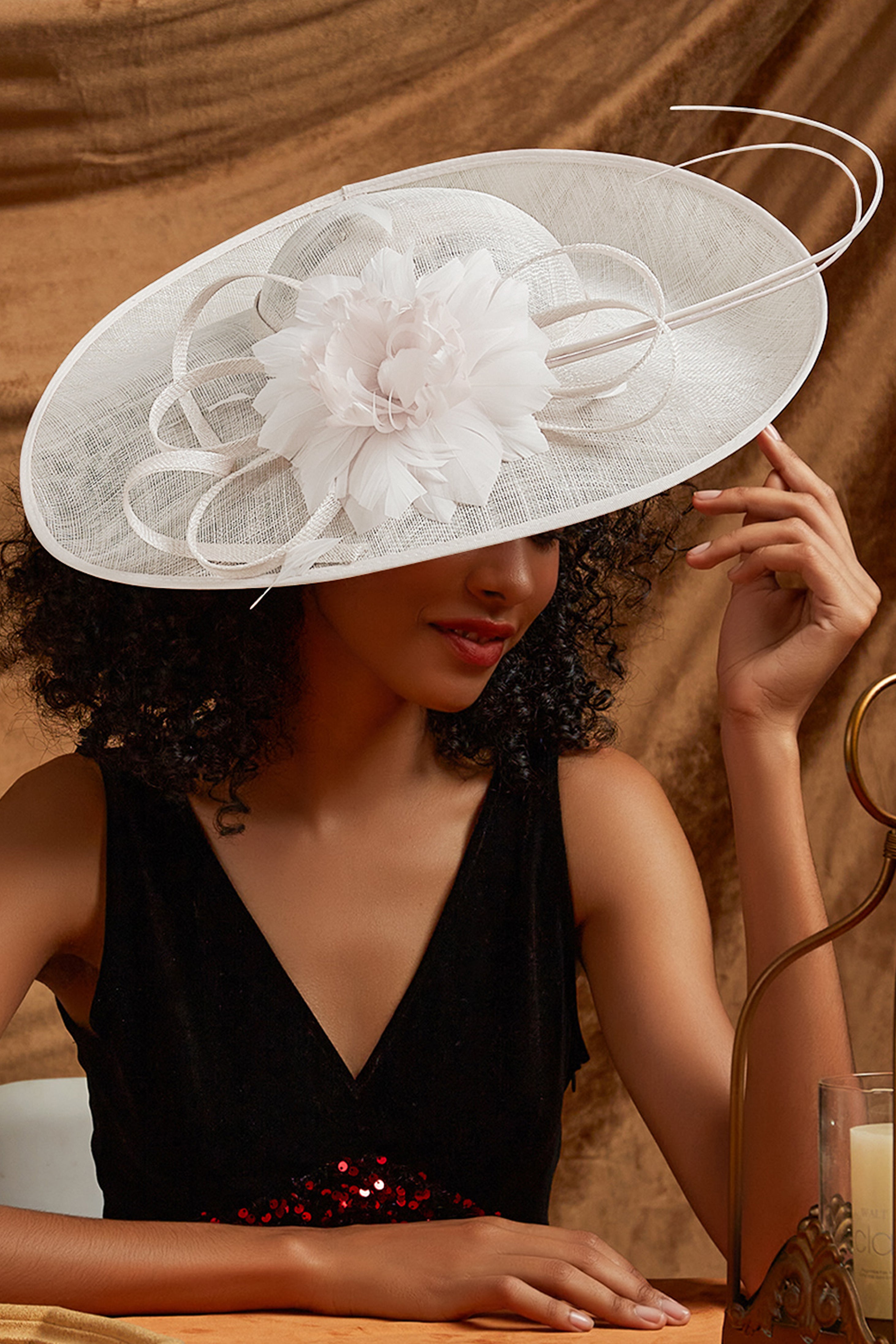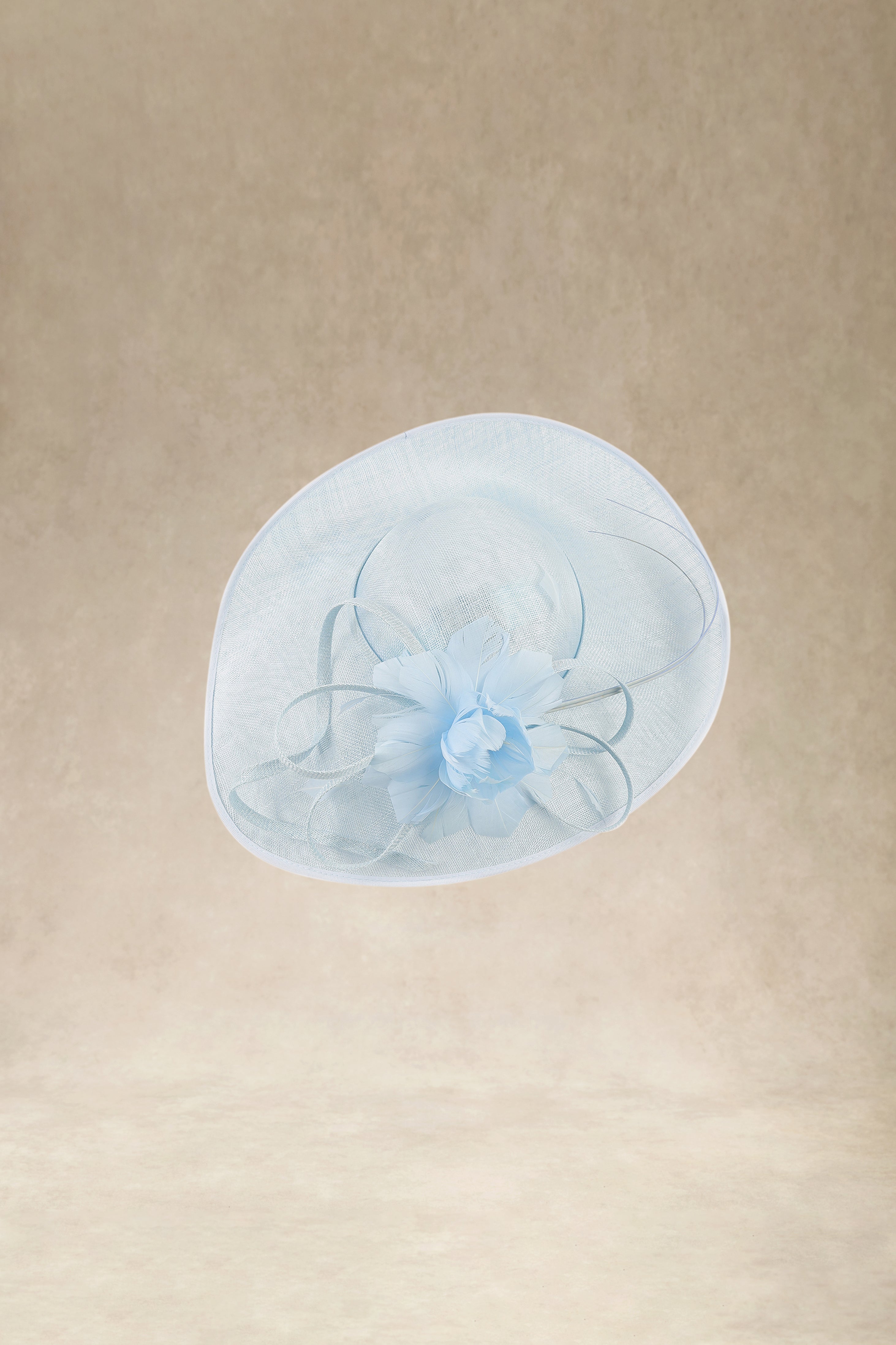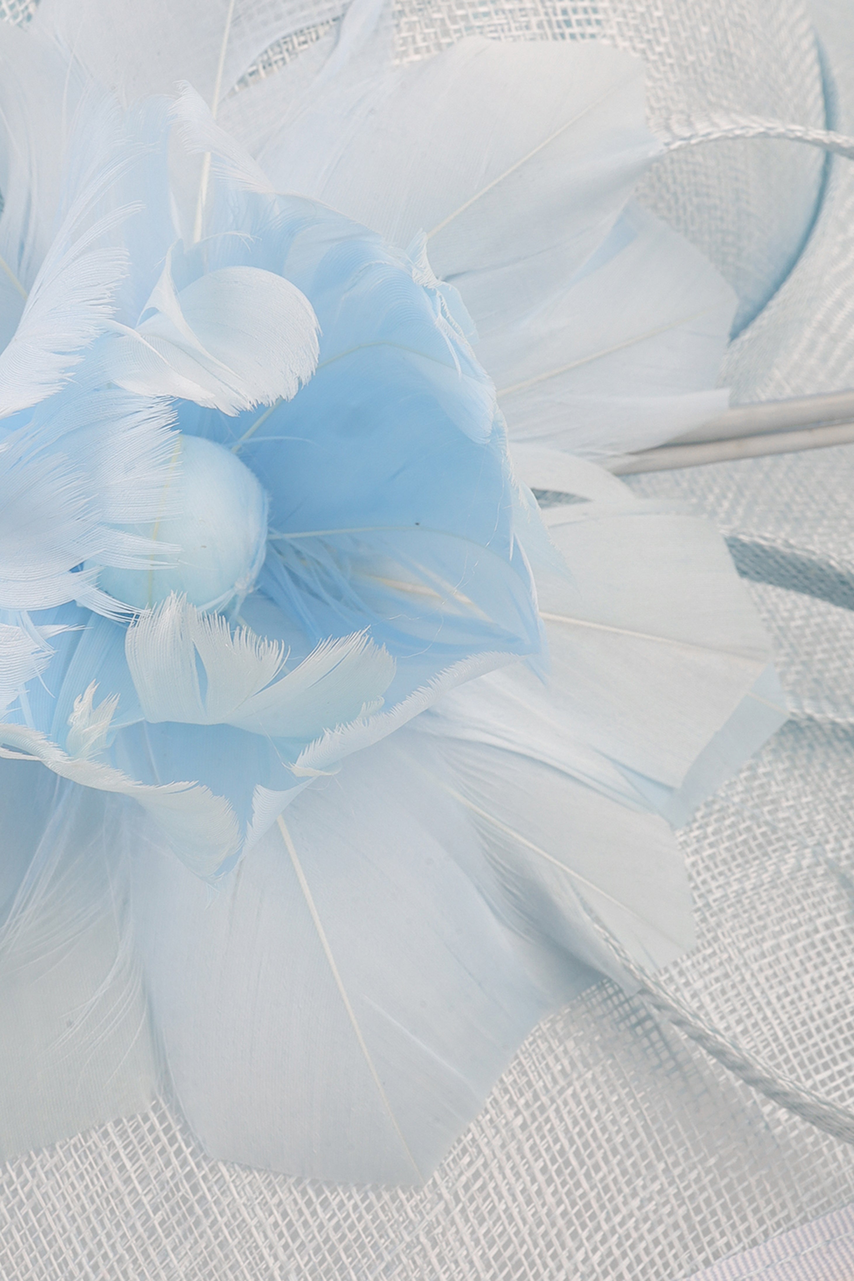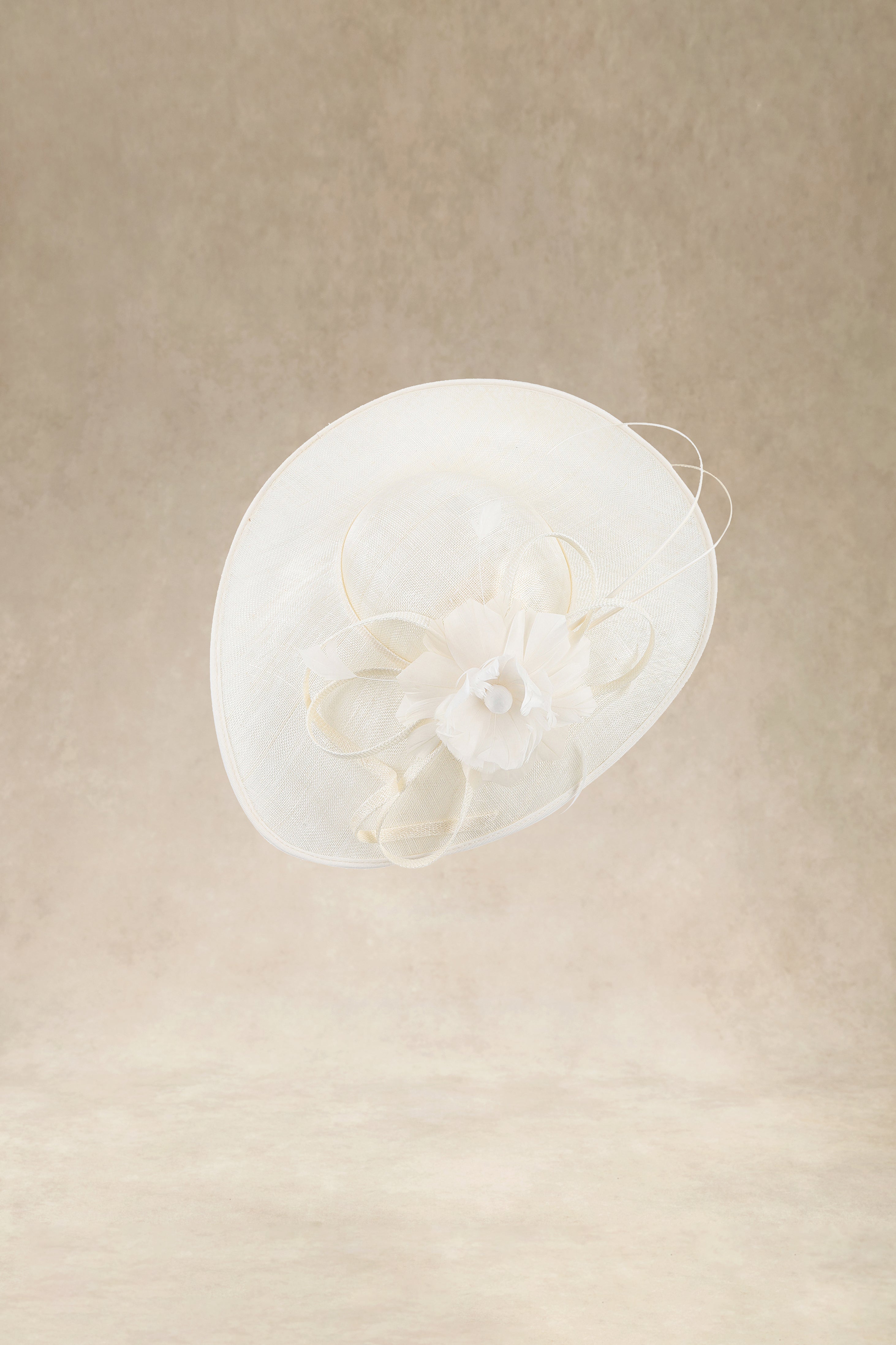 A sophisticated fascinator with a graceful floral accent and artistic ribbon loops. Designed to add charm and elegance, making it perfect for weddings, garden parties, and race day events.