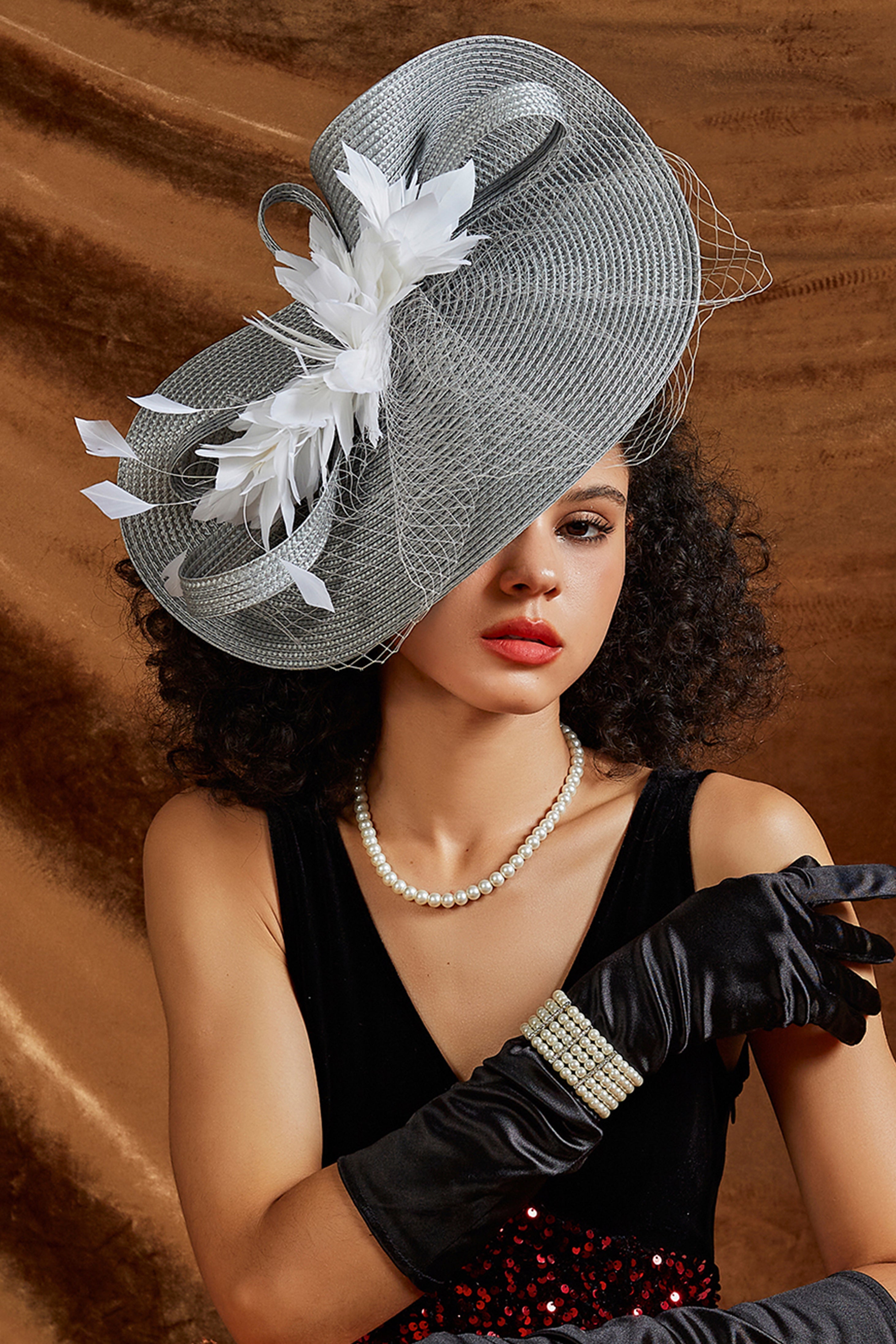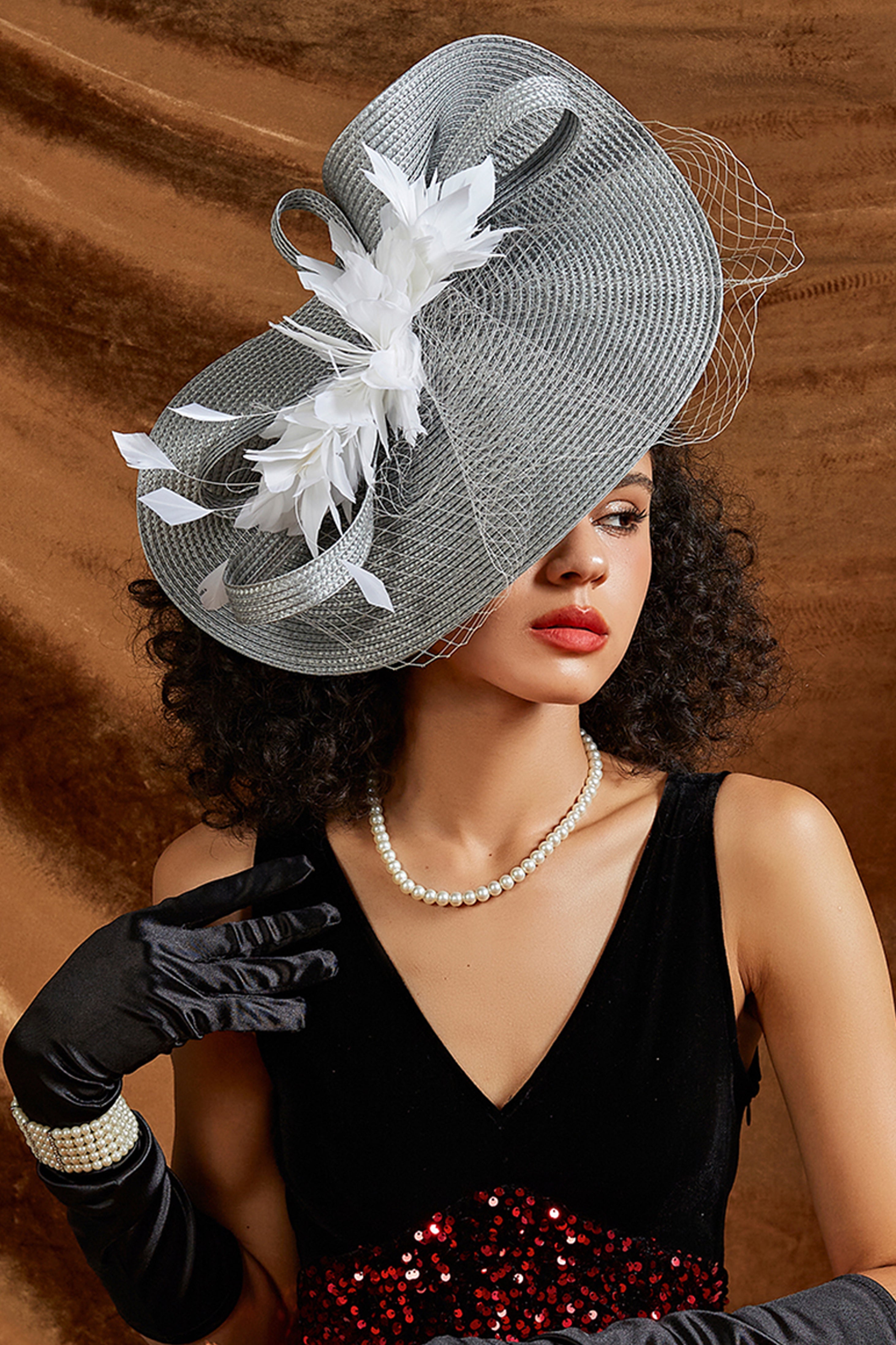 A stunning fascinator with a graceful curved design and elegant veil, perfect for making a statement at any race day event.