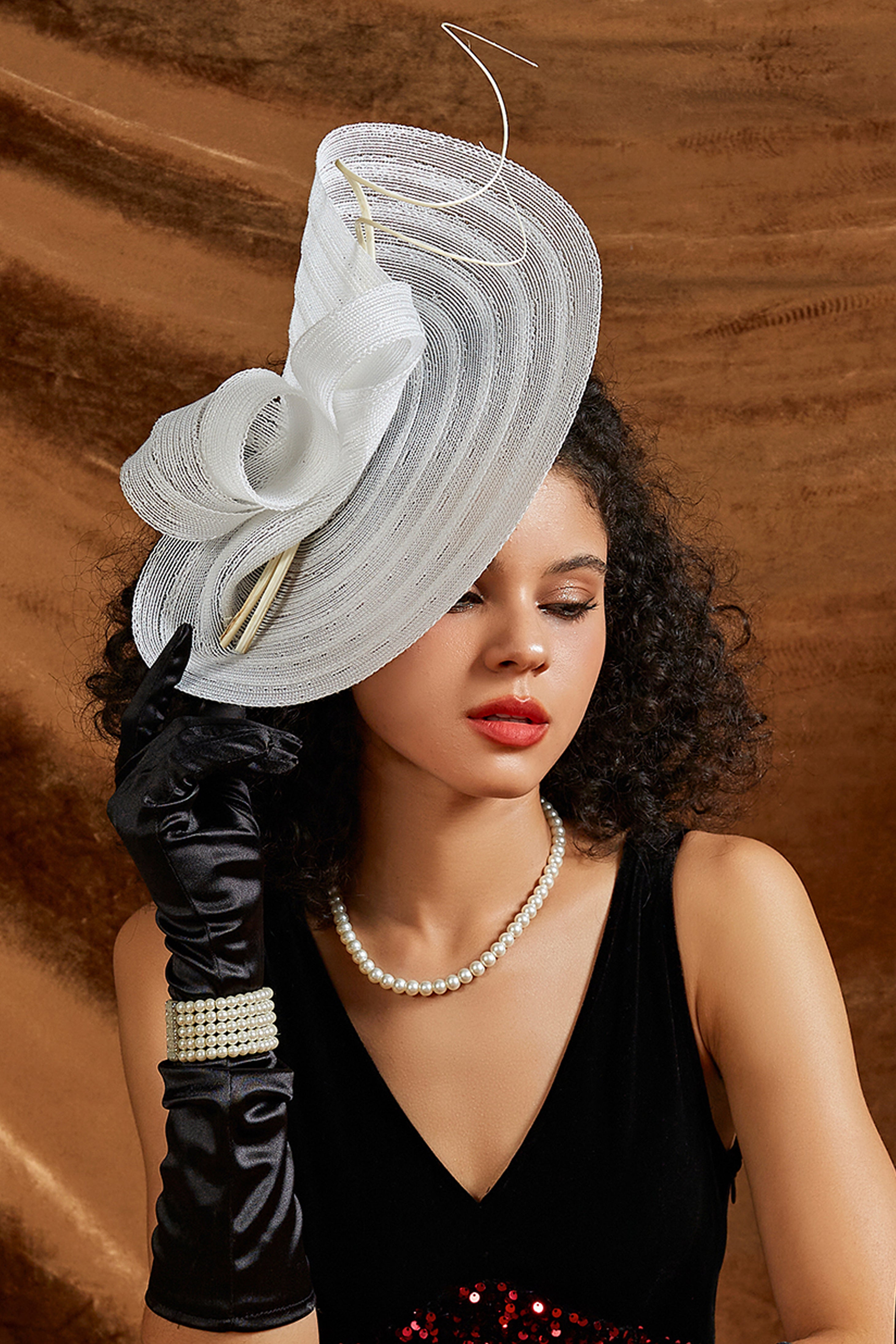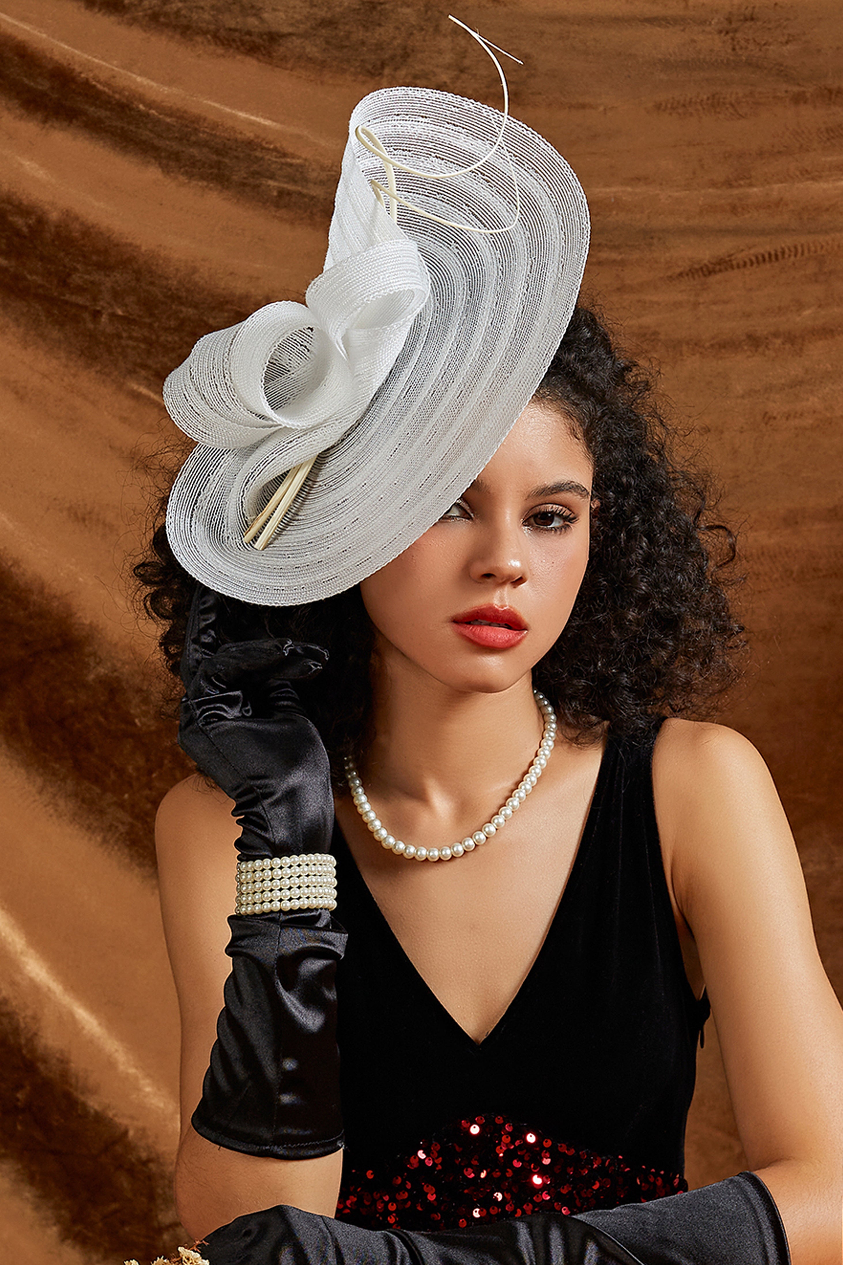Turn heads with this striking sinamay fascinator, featuring a wide, structured brim adorned with an exquisite floral design and delicate curled feathers.