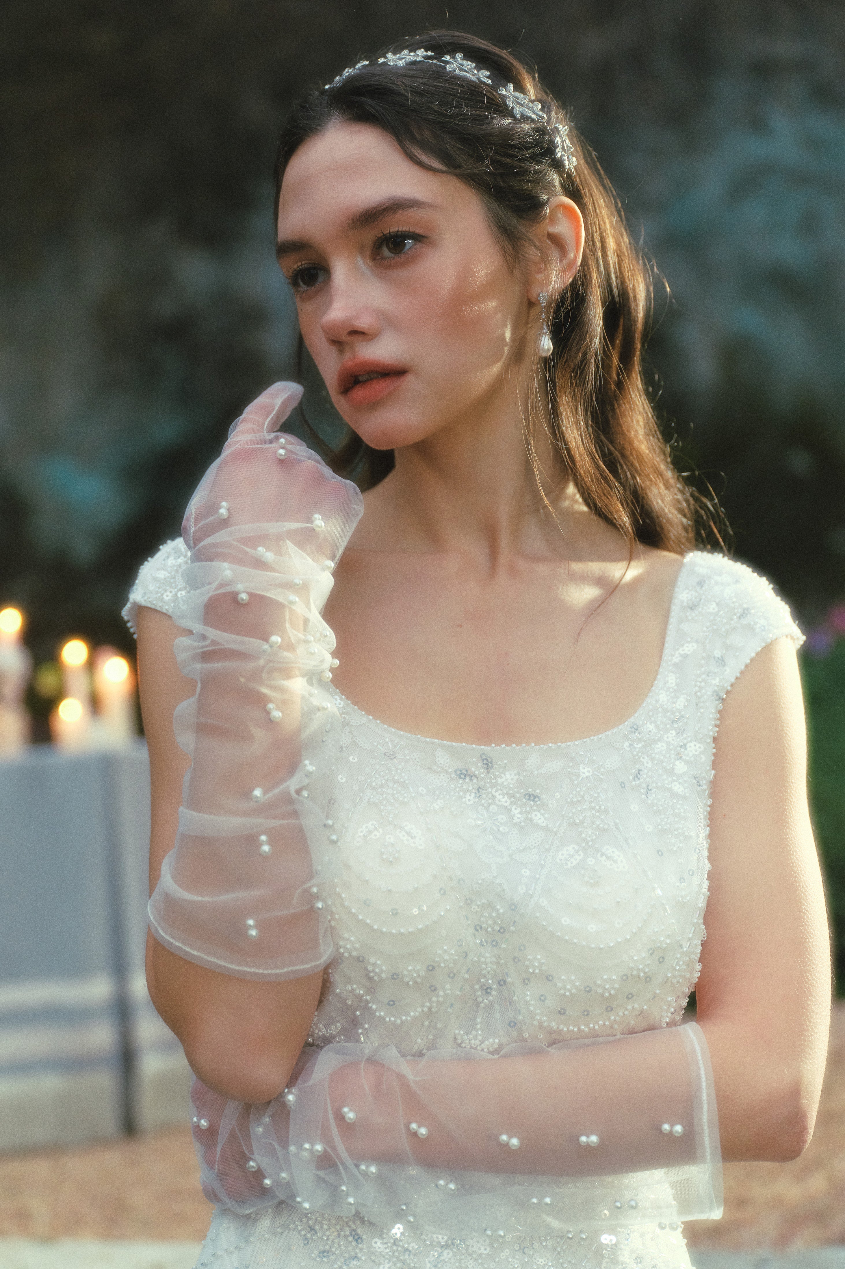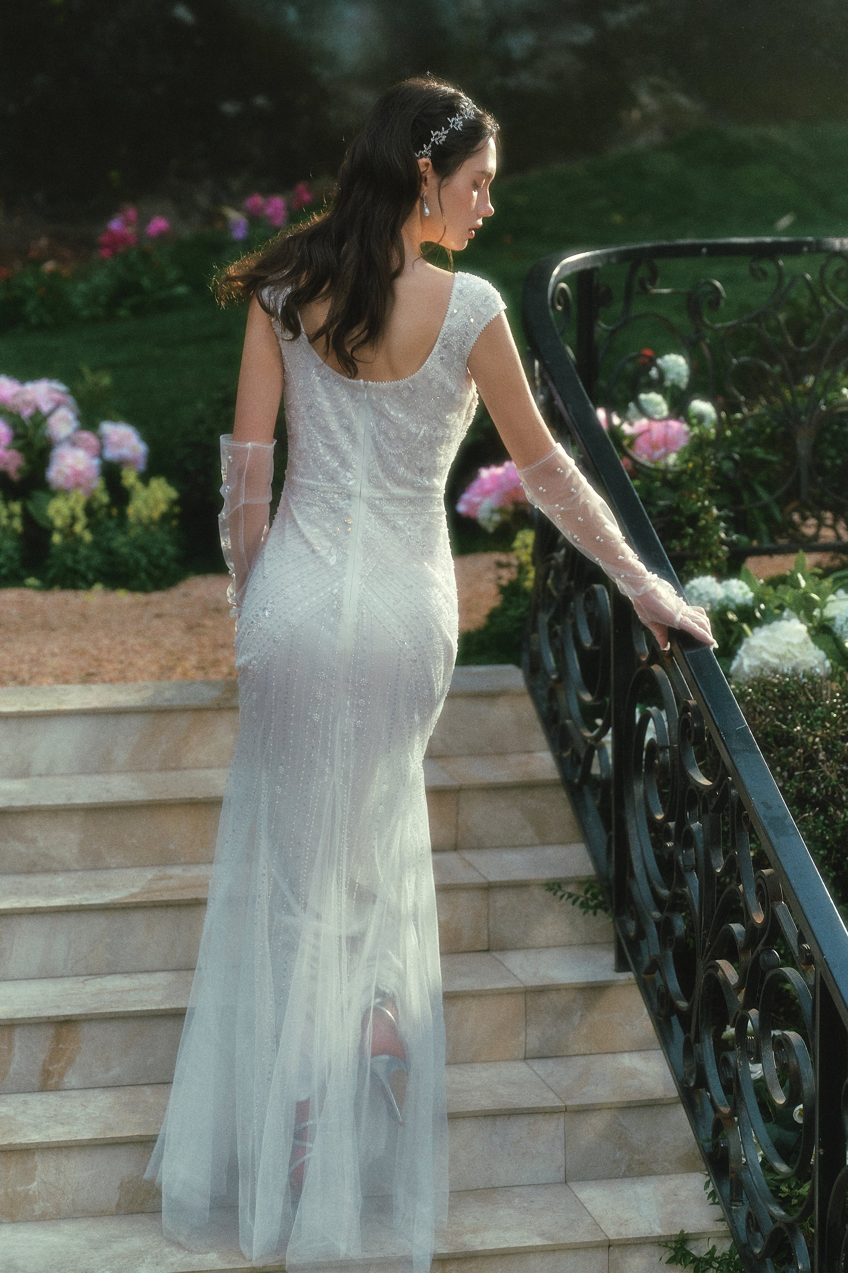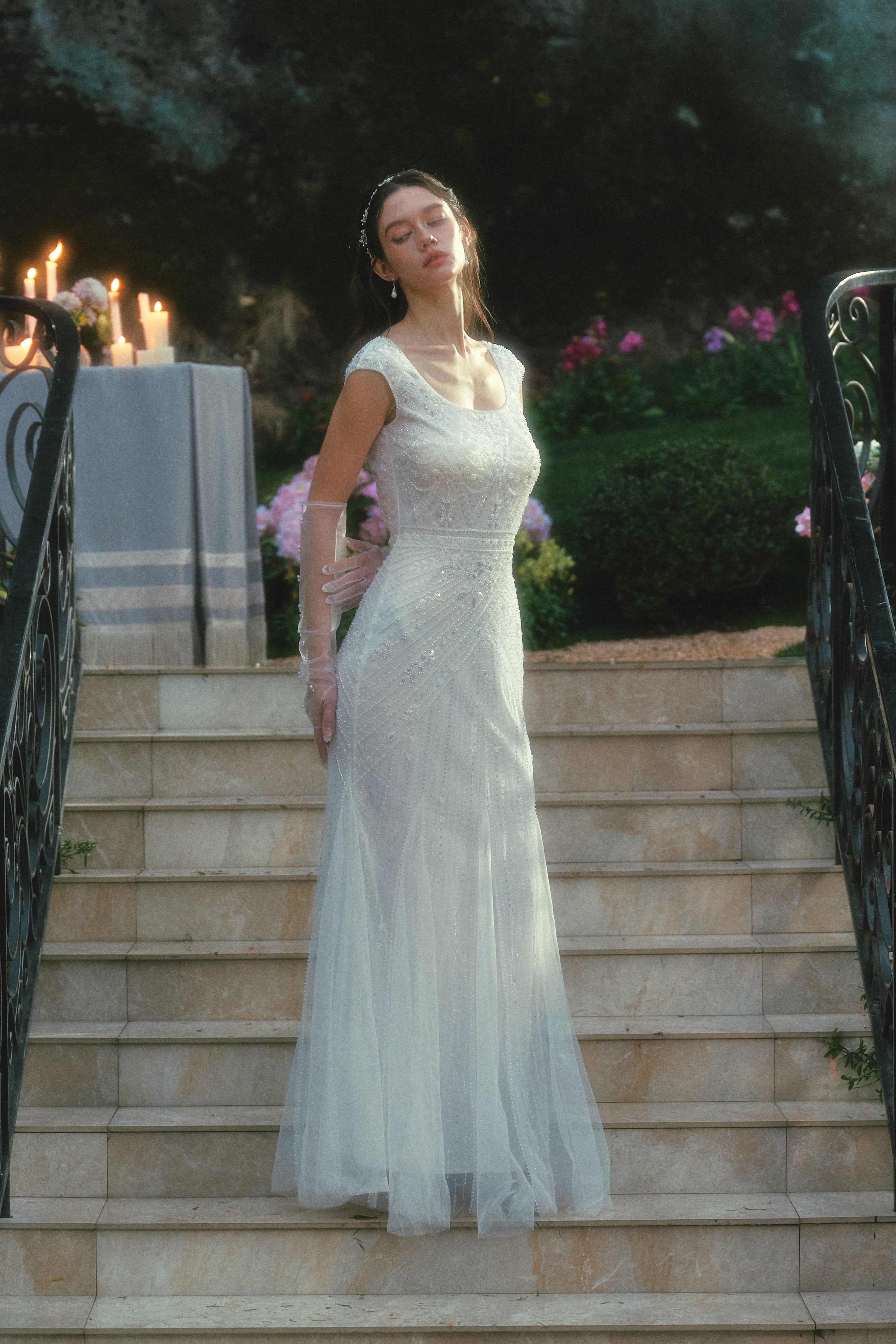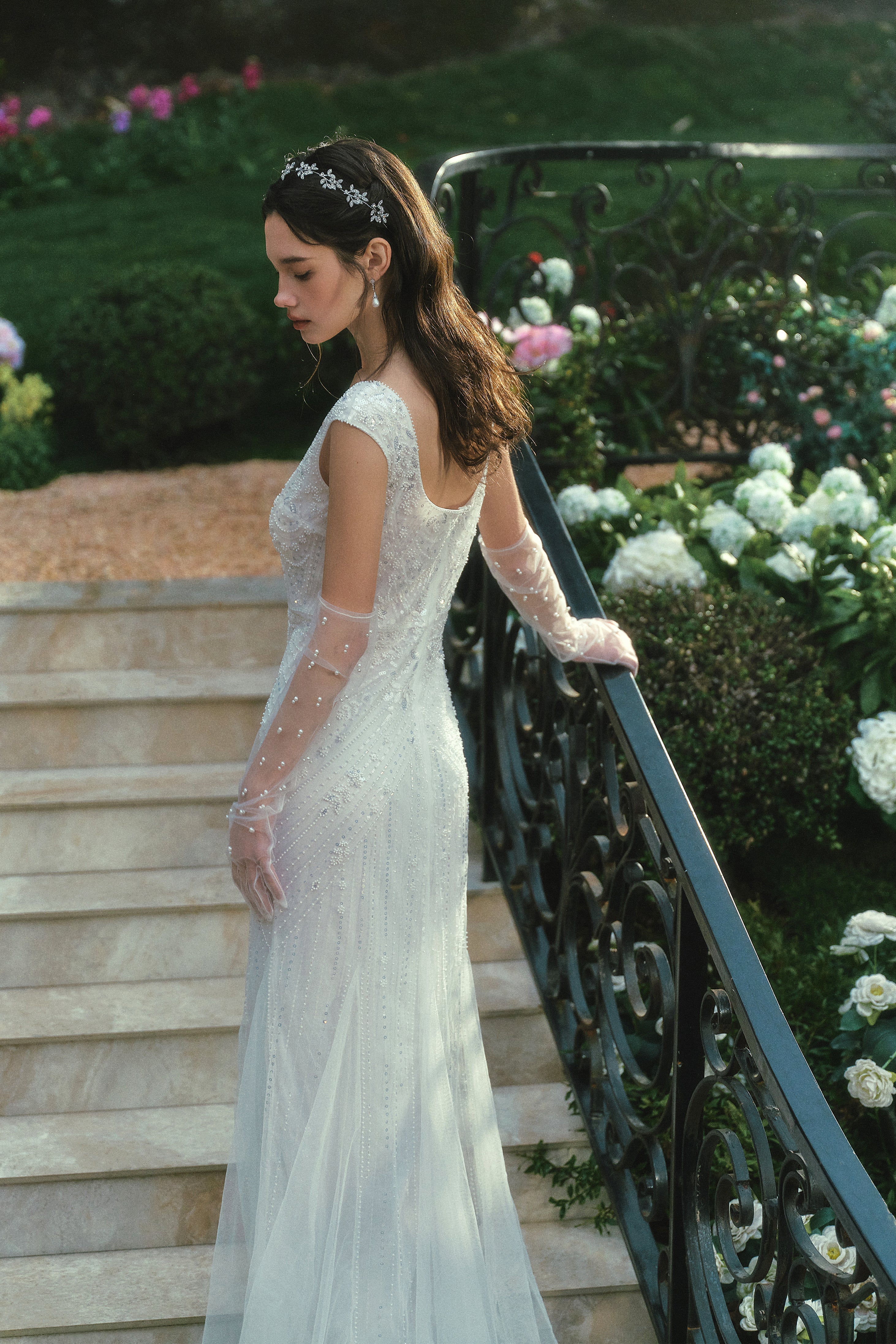She stops halfway up the garden steps, not to arrive anywhere, only to look. The tulle glows softly, a delicate fishtail tracing her movement. Beaded floral motifs at the bodice catch what little light remains, quiet but undeniable. Surrounded by flowers and grass, she watches the world with gentle curiosity, lingering without expectation.