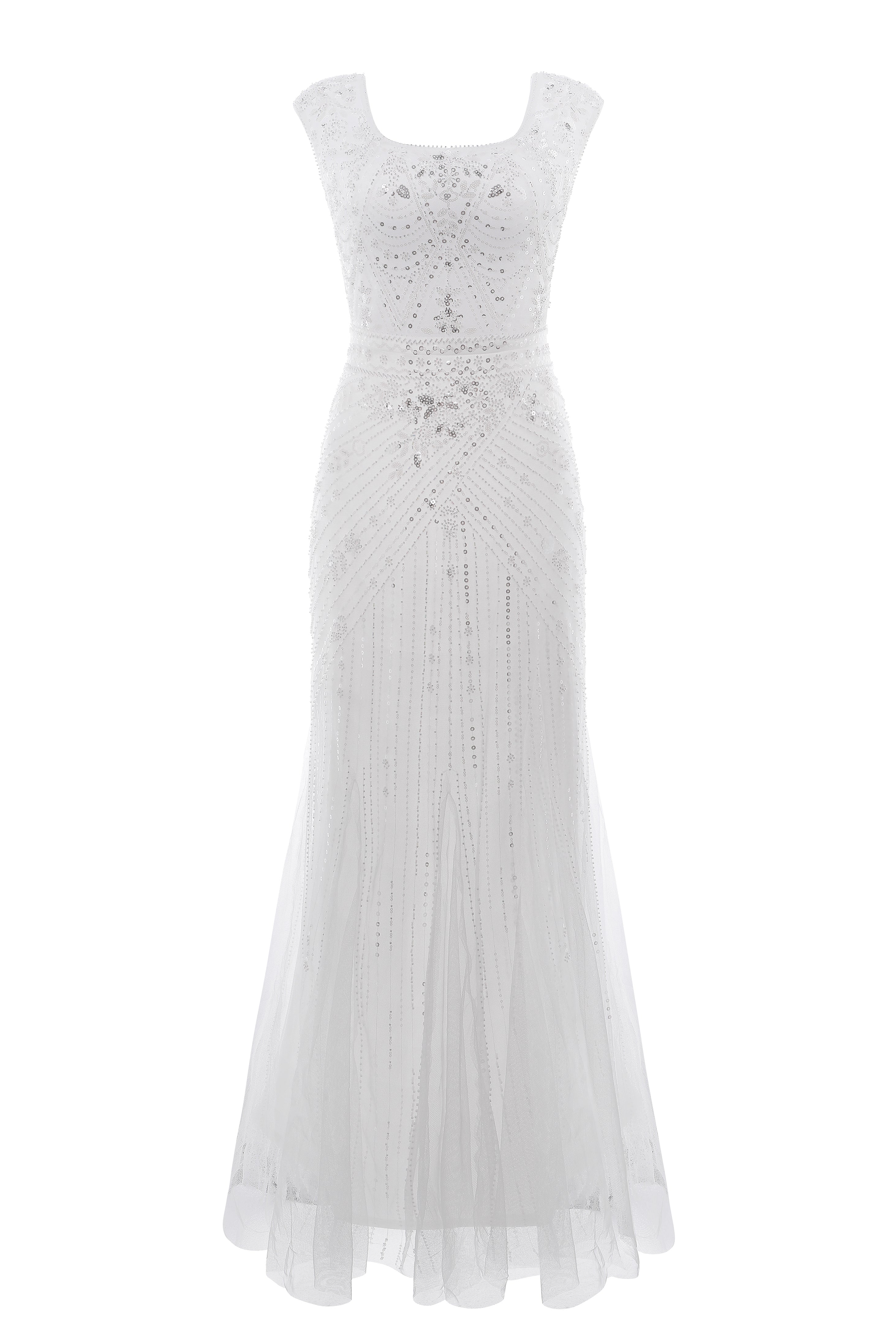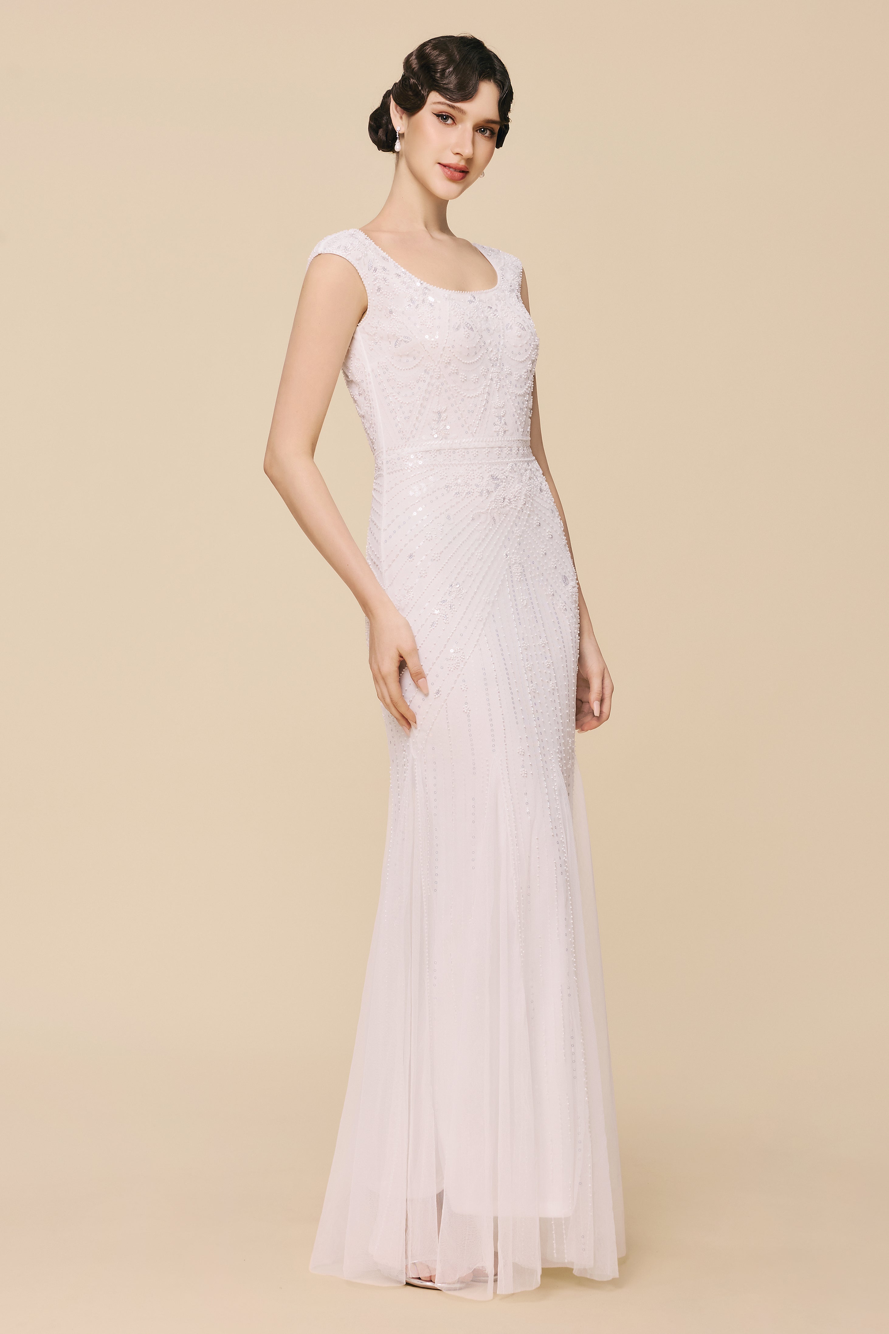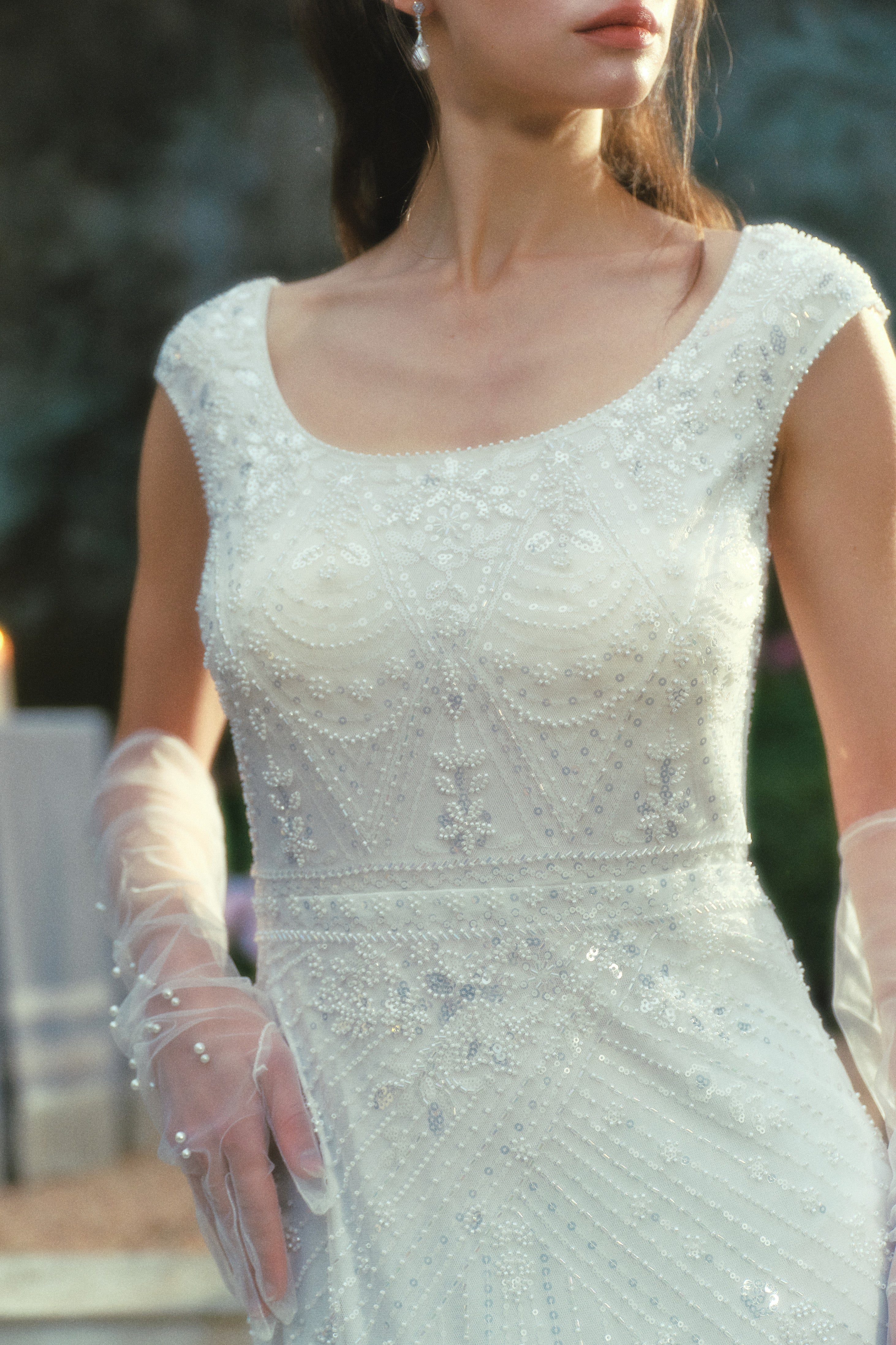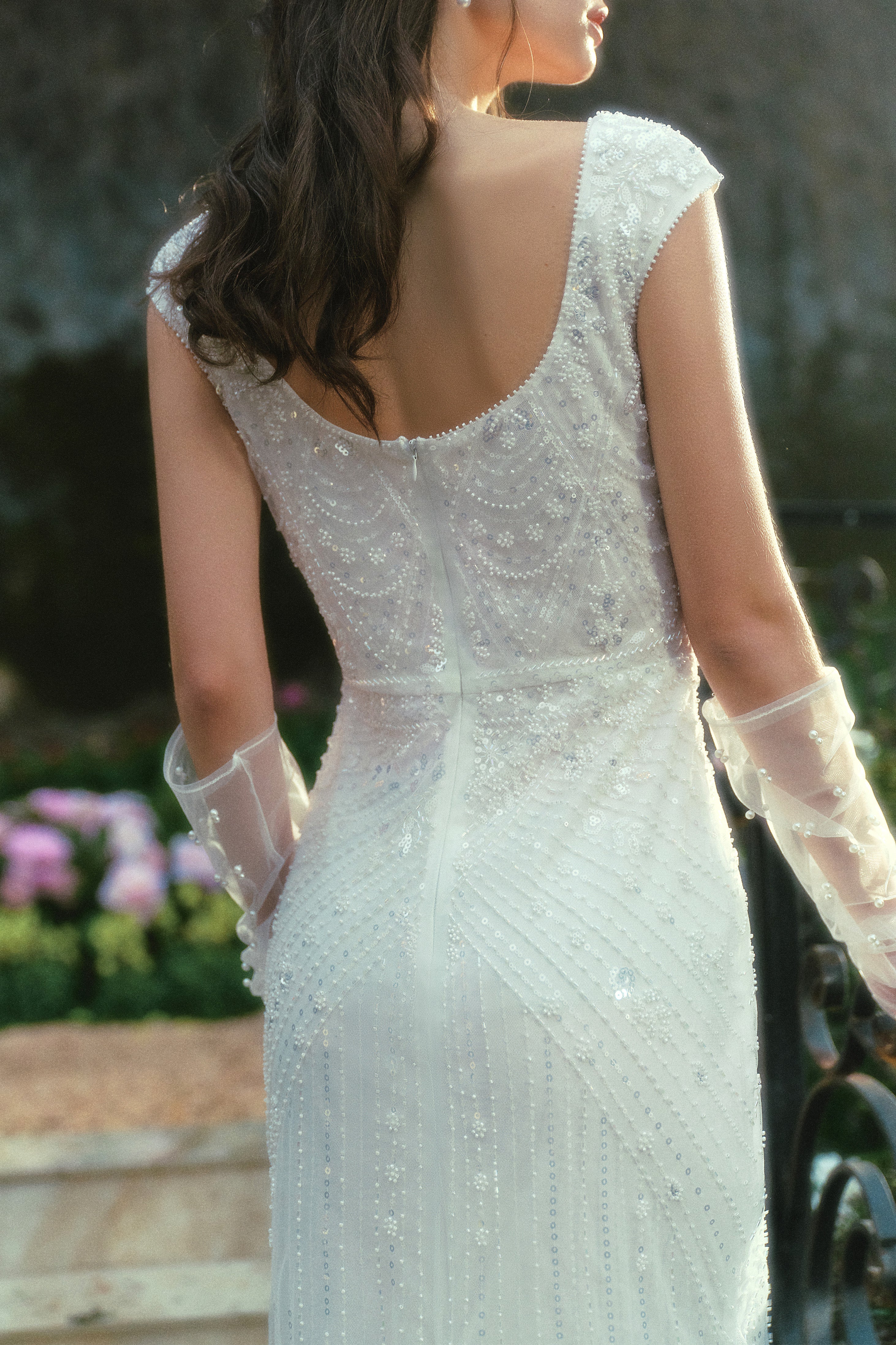 She stops halfway up the garden steps, not to arrive anywhere, only to look. The tulle glows softly, a delicate fishtail tracing her movement. Beaded floral motifs at the bodice catch what little light remains, quiet but undeniable. Surrounded by flowers and grass, she watches the world with gentle curiosity, lingering without expectation.
