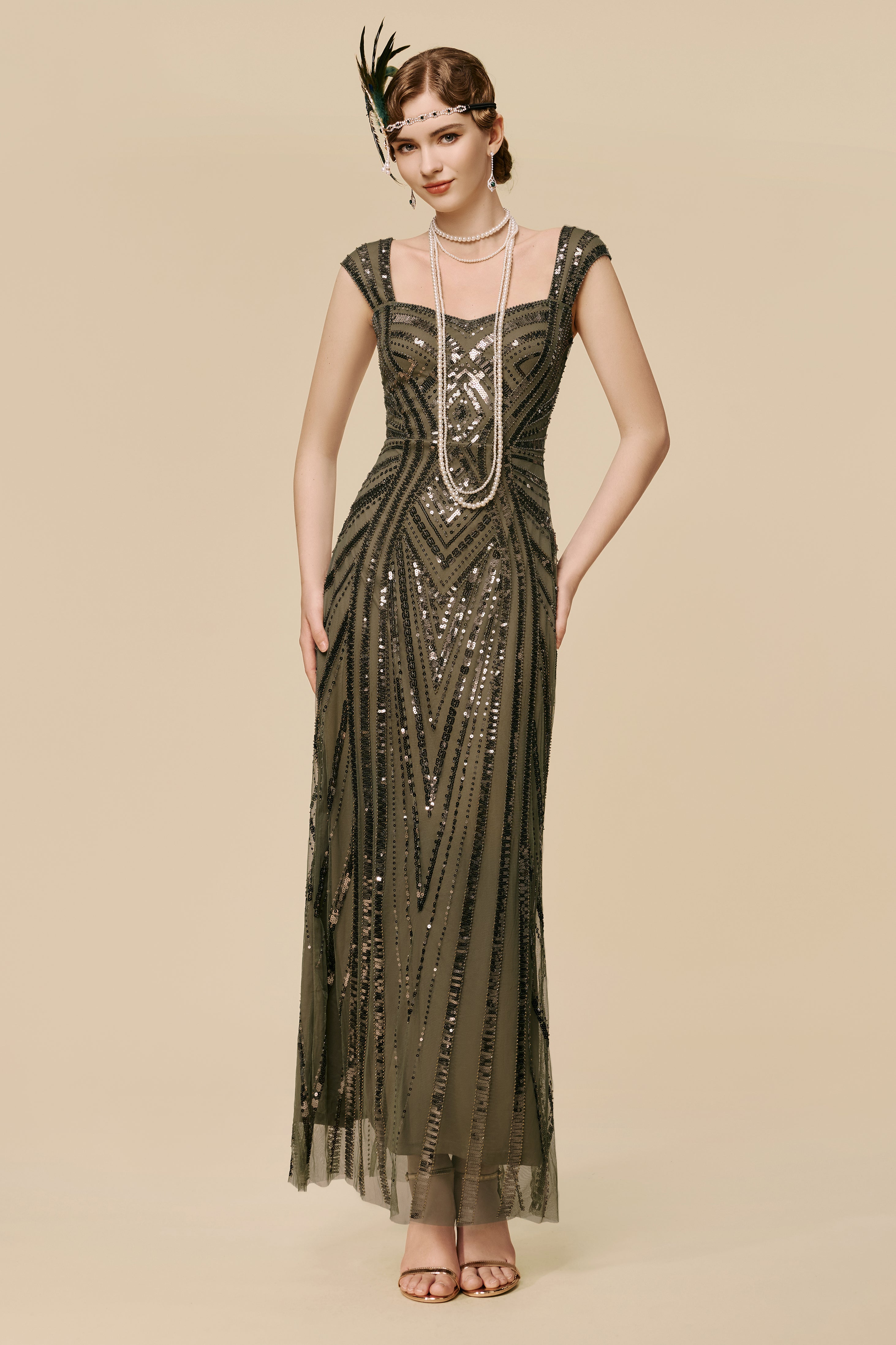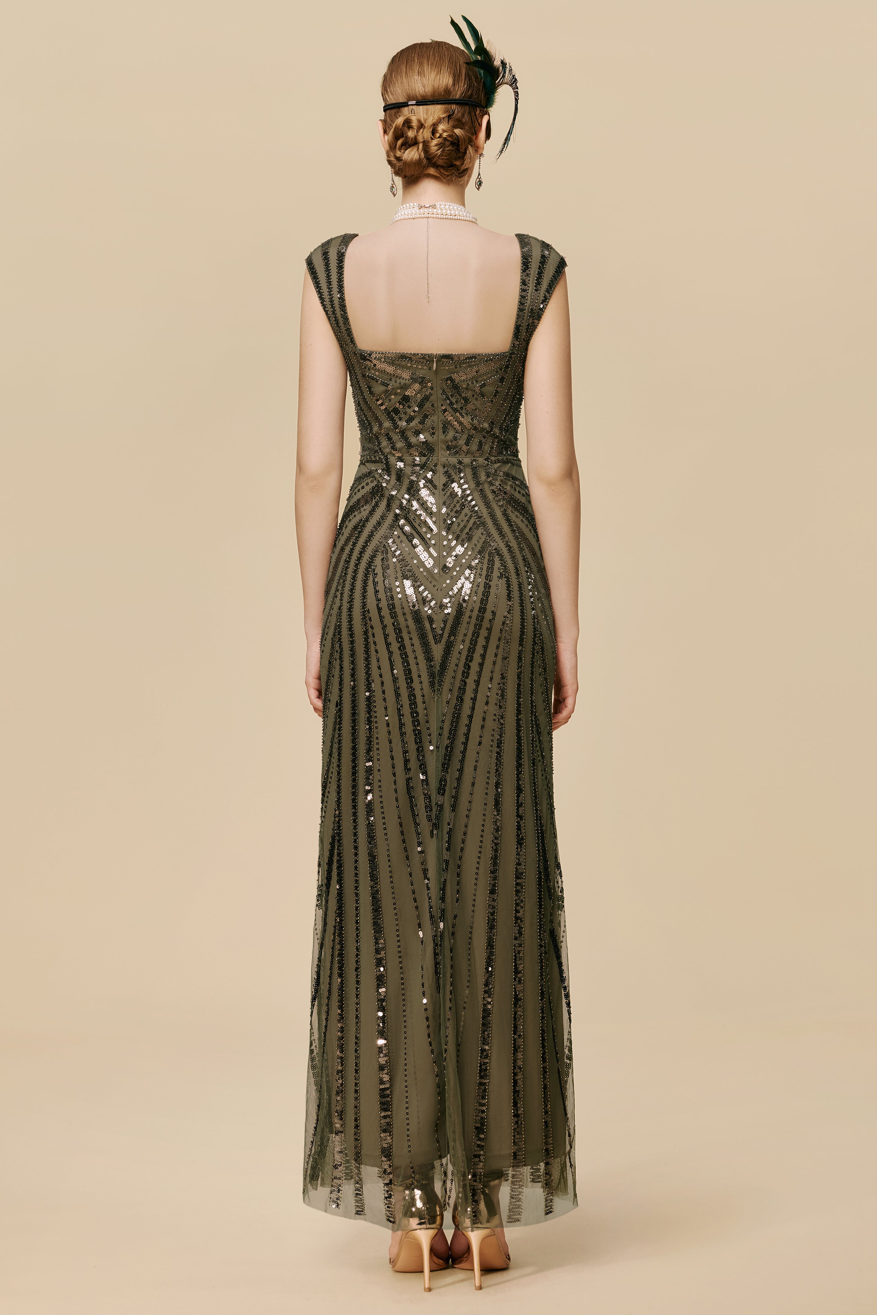 Art Deco Olive Green Sequin Evening Gown