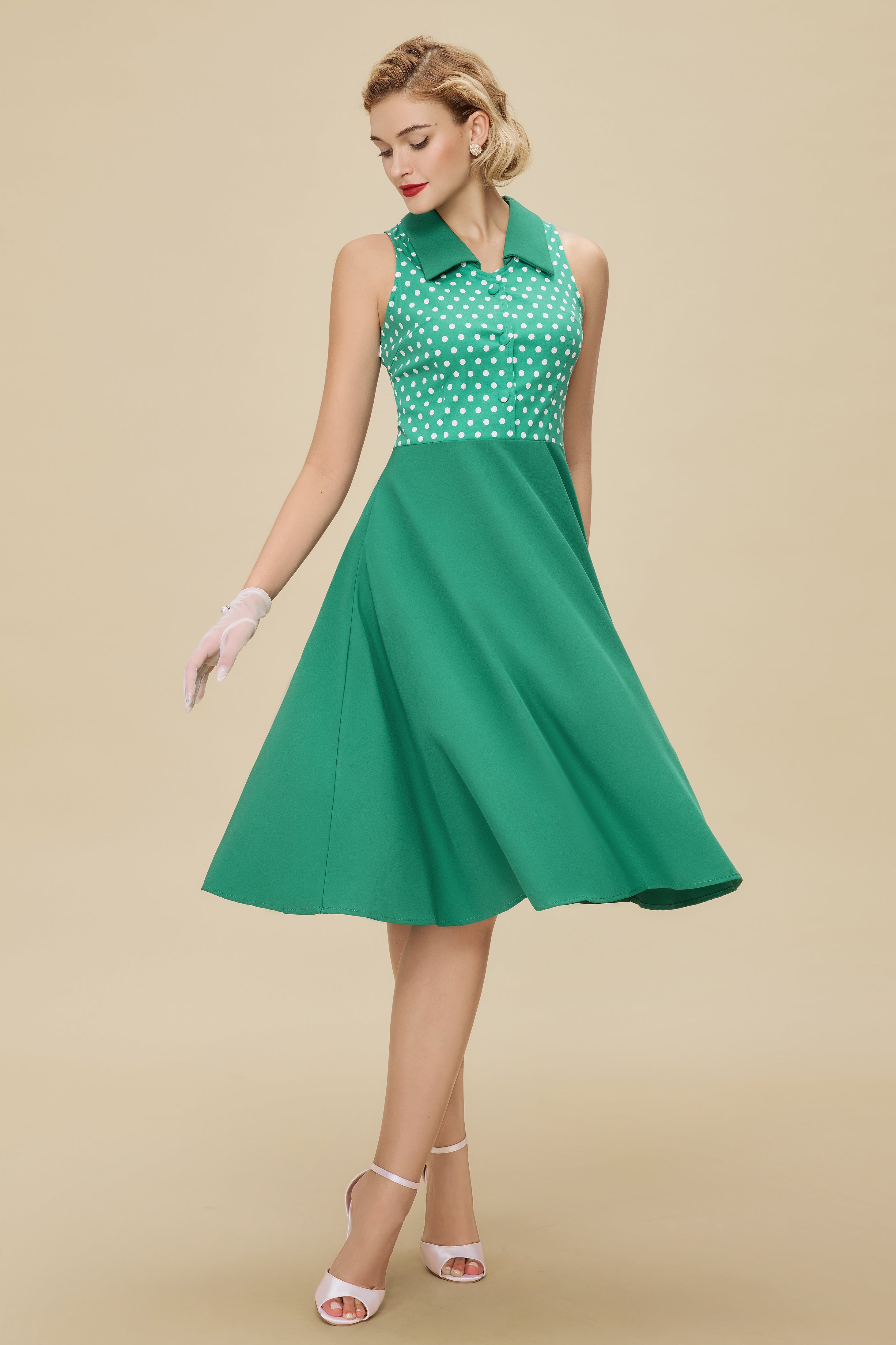 A playful nod to vintage charm, this sleeveless swing dress pairs a lively polka dot bodice with a flowing solid skirt. The wide pointed collar and button-front detail add a touch of retro sophistication.