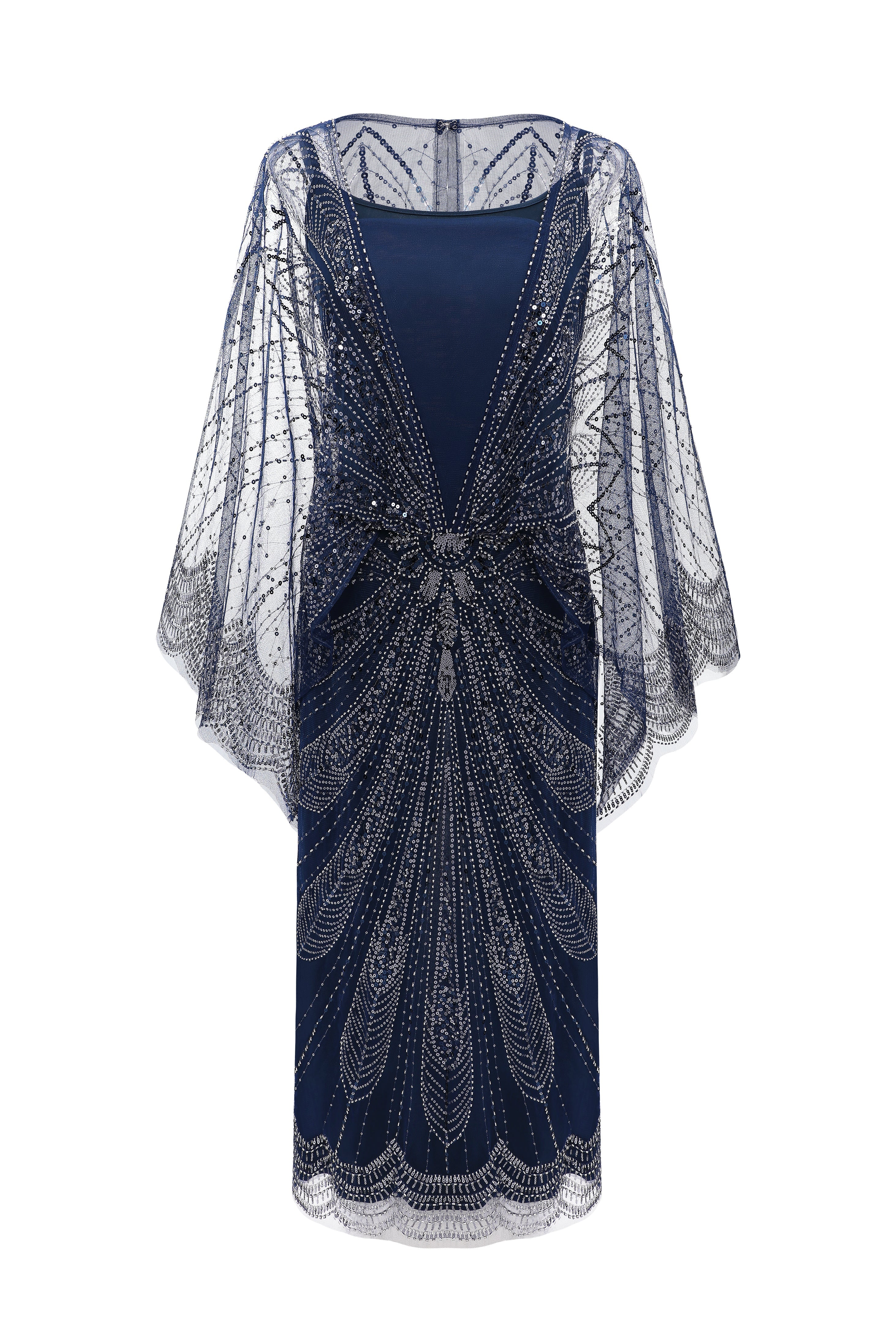 Sapphire Symphony Cape-Sleeve Evening Gown
