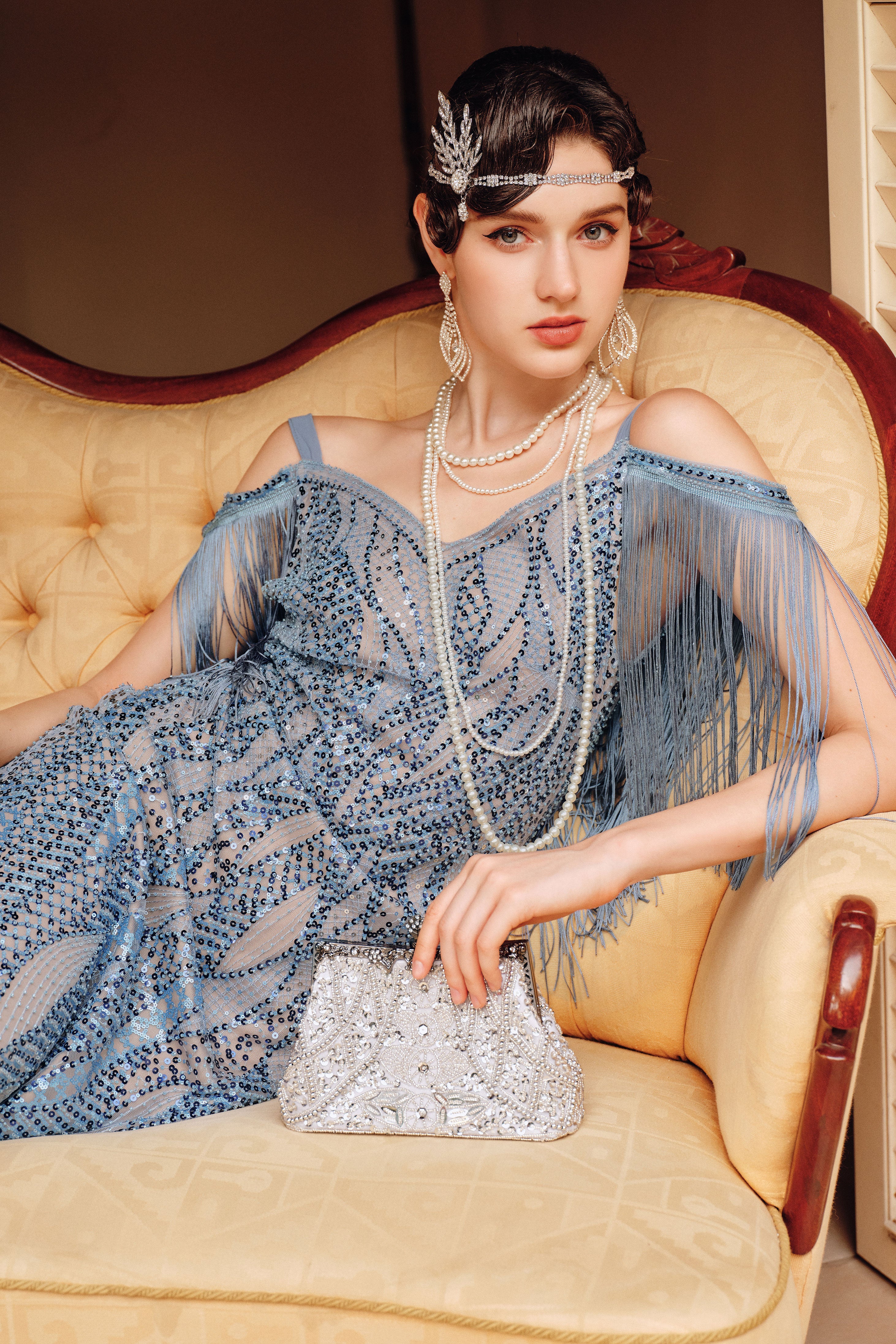 This original design reimagines Art Deco elegance through sculptural beaded wave patterns that contour and elongate the figure. Draped fringe sleeves frame the shoulders with architectural precision, while a plunging V-shaped back reveals a bold yet refined line. With its dynamic geometry and deliberate symmetry, this gown is a wearable statement of timeless form and movement.
