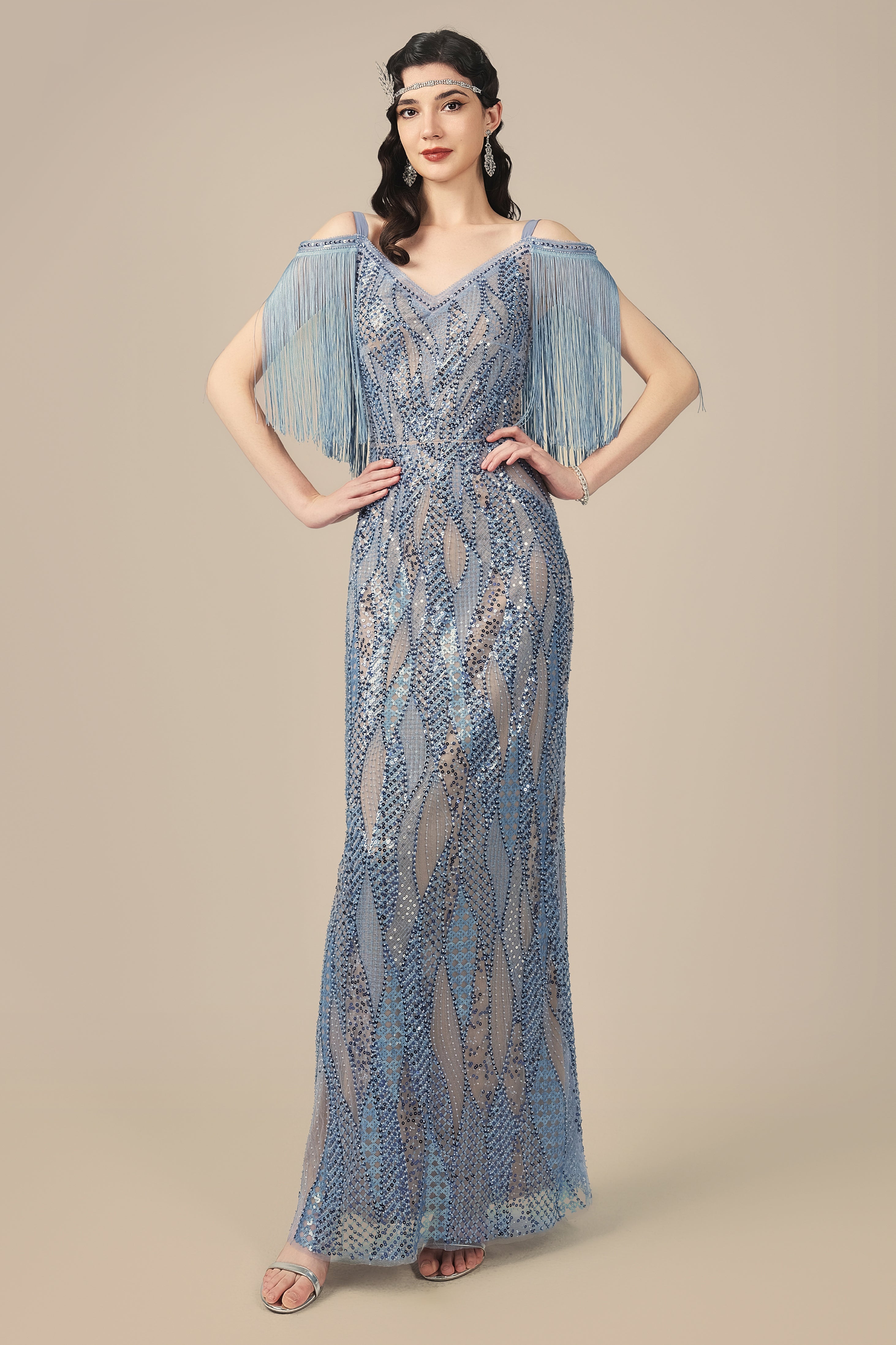 Beaded Wave Pattern Fringe Evening Gown